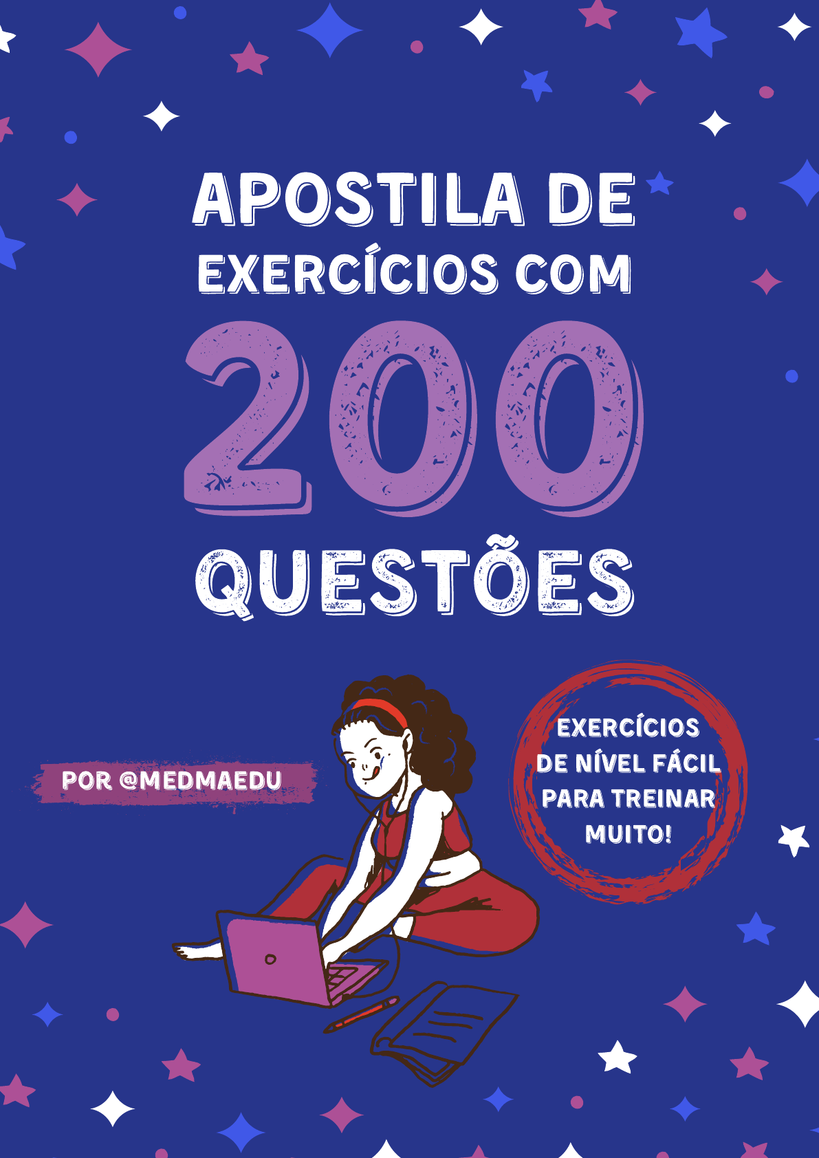 200 APOSTILA DE questões EXERCÍCIOS COM EXERCÍCIOS DE NÍVEL FÁCIL PARA TREINAR MUITO! por @medmaedu Olá, meu nome é Maria Eduarda, sou estudante de Medicina da Universidade Federal de Juiz de Fora, tendo ingressado na graduação em 2020. Depois de três anos de estudo após o Ensino Médio, sendo dois desses anos de estudo em casa, consegui conquistar o segundo lugar em Medicina na faculdade dos meus sonhos, tendo obtido a nota 816,18 no ENEM 2019. Amo trabalhar com educação e compartilhar experiências, encontrando no @medmaedu, assim, uma forma de unir essas paixões. Além disso, amo tocar instrumentos, criar mil listas de tarefas para me organizar e aprender muito sobre o corpo humano. PRAZER, MA(E)DU! Esta é uma apostila de 200 questões de nível fácil. A resolução deste material é recomendada para estudantes que estão reiniciando os seus estudos de preparação para o ENEM e para os vestibulares. A ideia desta apostila é ajudar os estudantes a identificarem o seu nível de domínio nos conteúdos mais básicos de cada área do conhecimento. A apostila também funciona como uma ferramenta para colaborar para a consolidação dos assuntos mais básicos das matérias. OBJETIVO 50 questões DE MATEMÁTICA Questão 2 - UNIFOR 2020 Após recuperar-se de uma cirurgia, o treinador da corredora Andrea estipulou um plano de treinamento diário: correr 500 metros no primeiro dia e aumentar 200 metros por dia, a partir do segundo, até que ela atinja 10 km. Andrea pretende correr 10 km na maratona do Rio de Janeiro, no início do próximo ano. Em quantos dias de treinamento Andrea atingirá 10 km? a) 35 d) 49 b) 39 e) 52 c) 43 Questão 1 - UERJ 2020/1 Admita que, em dezembro de 2014, uma filha tinha 20 anos e seu pai, 50. Em dezembro de 2024, a razão entre as idades da filha e do pai será de: a) 1/5 c) 3/4 b) 1/2 d) 4/3 Questão 4 - UERR 2020 Sendo a e b dois números inteiros e diferentes de zero, assinalar, entre as alternativas abaixo, qual dos seguintes números não é um número inteiro, necessariamente. a) a – b b) b – a c) a/b d) a/a e) b/b Questão 3 - CESGRANRIO 2020 Maria comprou uma caixa com 48 balas. Ela retirou algumas balas da caixa e as colocou em um saco, para dar ao seu filho Pedro. Em seguida, retirou da caixa mais algumas balas e as colocou em outro saco para dar a sua filha, Joana. Maria observou que restaram 16 balas na caixa e que, no saco destinado a Pedro, havia 4 balas a menos do que no saco destinado a Joana. Quantas balas Maria colocou no saco destinado a Pedro? Questão 5 - UPE 2020 Sara escreveu três números de quatro algarismos, cuja soma vale 12.345, sendo o primeiro número 6.789; no segundo número, Sara apagou o algarismo da dezena e, no terceiro, ela apagou os algarismos da centena e da unidade de milhar, conforme indicados a seguir: 2 0 __9 e __ __3 7 Que algarismos, respectivamente, Sara apagou na dezena do segundo número; na unidade de milhar e na centena do terceiro número? a) 1, 2 e 5 b) 1, 3 e 5 c) 1, 5 e 6 d) 2, 4 e 6 e) 3, 4 e 6 a) 14 d) 17 b) 15 e) 18 c) 16 Questão 6 - ENEM 2019 Um comerciante, que vende somente pastel, refrigerante em lata e caldo de cana em copos, fez um levantamento das vendas realizadas durante a semana. O resultado desse levantamento está apresentado no gráfico. Ele estima que venderá, em cada dia da próxima semana, uma quantidade de refrigerante em lata igual à soma das quantidades de refrigerante em lata e caldo de cana em copos vendidas no respectivo dia da ultima semana. Quanto aos pastéis, estima vender, a cada dia da próxima semana, uma quantidade igual à quantidade de refrigerante em lata que prevê vender em tal dia. Já para o número de caldo de cana em copos, estima que as vendas diárias serão iguais às da ultima semana. Questão 7 - OBRL 2019 Na imagem abaixo existe uma relação de formação entre as palavras (SENUN e NUNES) que se encontram na primeira linha. Na segunda linha está faltando uma sequência numérica, à direita, que precisa ser descoberta, e que ela, mantem a mesma relação que as palavras da primeira linha. Assim, qual alternativa faz a melhor comparação? SENUN está para NUNES assim como 71252 está para _ _ _ _ _. a) 15272 b) 75212 c) 22517 d) 25217 e) 72751 Questão 8 - FAI 2019 Em uma prova de rali, um carro percorreu 85% do percurso. Sabendo-se que faltam 180 km para completar a prova, é correto afirmar que o percurso total desse rali é: a) 2100 km b) 1020 km c) 1120 km d) 1210 km e) 1200 km Segundo essas estimativas, a quantidade a mais de pastéis que esse comerciante deve vender na próxima semana é a) 20 d) 55 b) 27 e) 71 c) 44 Questão 10 - FATEC 2019 Um grupo de cinco amigos resolveu passar o final de semana em um hotel fazenda no interior do estado de São Paulo. Todos foram juntos no mesmo carro e decidiram dividir, igualmente, a despesa total da viagem entre os cinco participantes. Dados da viagem de carro: • a distância percorrida ida e volta foi de 432 km; • o consumo de gasolina do veículo foi de 9 km/L; • o preço da gasolina foi de R$ 4,50/L; • o valor de cada pedágio foi de Questão 11 - ENEM PPL 2017 Uma equipe de ambientalistas apresentou um mapa de uma reserva ambiental em que faltava a especificação da escala utilizada para a sua confecção. O problema foi resolvido, pois um dos integrantes da equipe lembrava-se de que a distância real de 72 km, percorrida na reserva, equivalia a 3,6 cm no mapa. Qual foi a escala utilizada na confecção do mapa? a) 1 : 20 b) 1 : 2 000 c) 1 : 20 000 d) 1 : 200 000 e) 1 :2 000 000 · P1: R$ 10,00 · P2: R$ 2,50 · P3: R$ 4,40 · P4: R$ 2,70 Sabendo que todos os pedágios foram pagos na ida e na volta, cada amigo gastou em transporte, considerando apenas a gasolina e os pedágios, a quantia de a) R$ 43,20 b) R$ 45,24 c) R$ 47,12 d) R$ 51,04 e) R$ 53,08 Questão 9 - UPE 2019 Ana leva 15 minutos, todos os dias, para chegar ao seu trabalho, viajando de metrô. Trabalha durante 8 hora