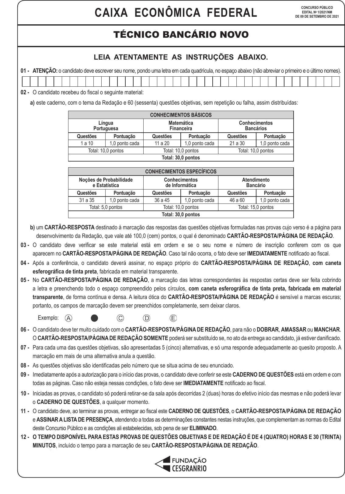 pcimarkpci MjgwNDowMTRjOjg1ODY6NTAwMTowOTljOjdiY2M6NTJlNzplZWQz:U3VuLCAwMyBNYXIgMjAyNCAyMDozODowNCAtMDMwMA== www.pciconcursos.com.br CAIXA ECONÔMICA FEDERAL CONCURSO PÚBLICO EDITAL No 1/2021/NM DE 09 DE SETEMBRO DE 2021 LEIA ATENTAMENTE AS INSTRUÇÕES ABAIXO. 01 - ATENÇÃO: o candidato deve escrever seu nome, pondo uma letra em cada quadrícula, no espaço abaixo (não abreviar o primeiro e o último nomes). 02 - O candidato recebeu do fiscal o seguinte material: a) este caderno, com o tema da Redação e 60 (sessenta) questões objetivas, sem repetição ou falha, assim distribuídas: CONHECIMENTOS BÁSICOS Língua Portuguesa Matemática Financeira Conhecimentos Bancários Questões Pontuação Questões Pontuação Questões Pontuação 1 a 10 1,0 ponto cada 11 a 20 1,0 ponto cada 21 a 30 1,0 ponto cada Total: 10,0 pontos Total: 10,0 pontos Total: 10,0 pontos Total: 30,0 pontos CONHECIMENTOS ESPECÍFICOS Noções de Probabilidade e Estatística Conhecimentos de Informática Atendimento Bancário Questões Pontuação Questões Pontuação Questões Pontuação 31 a 35 1,0 ponto cada 36 a 45 1,0 ponto cada 46 a 60 1,0 ponto cada Total: 5,0 pontos Total: 10,0 pontos Total: 15,0 pontos Total: 30,0 pontos b) um CARTÃO-RESPOSTA destinado à marcação das respostas das questões objetivas formuladas nas provas cujo verso é a página para desenvolvimento da Redação, que vale até 100,0 (cem) pontos, o qual é denominado CARTÃO-RESPOSTA/PÁGINA DE REDAÇÃO. 03 - O candidato deve verificar se este material está em ordem e se o seu nome e número de inscrição conferem com os que aparecem no CARTÃO-RESPOSTA/PÁGINA DE REDAÇÃO. Caso tal não ocorra, o fato deve ser IMEDIATAMENTE notificado ao fiscal. 04 - Após a conferência, o candidato deverá assinar, no espaço próprio do CARTÃO-RESPOSTA/PÁGINA DE REDAÇÃO, com caneta esferográfica de tinta preta, fabricada em material transparente. 05 - No CARTÃO-RESPOSTA/PÁGINA DE REDAÇÃO, a marcação das letras correspondentes às respostas certas deve ser feita cobrindo a letra e preenchendo todo o espaço compreendido pelos círculos, com caneta esferográfica de tinta preta, fabricada em material transparente, de forma contínua e densa. A leitura ótica do CARTÃO-RESPOSTA/PÁGINA DE REDAÇÃO é sensível a marcas escuras; portanto, os campos de marcação devem ser preenchidos completamente, sem deixar claros. Exemplo: 06 - O candidato deve ter muito cuidado com o CARTÃO-RESPOSTA/PÁGINA DE REDAÇÃO, para não o DOBRAR, AMASSAR ou MANCHAR. O CARTÃO-RESPOSTA/PÁGINA DE REDAÇÃO SOMENTE poderá ser substituído se, no ato da entrega ao candidato, já estiver danificado. 07 - Para cada uma das questões objetivas, são apresentadas 5 (cinco) alternativas, e só uma responde adequadamente ao quesito proposto. A marcação em mais de uma alternativa anula a questão. 08 - As questões objetivas são identificadas pelo número que se situa acima de seu enunciado. 09 - Imediatamente após a autorização para o início das provas, o candidato deve conferir se este CADERNO DE QUESTÕES está em ordem e com todas as páginas. Caso não esteja nessas condições, o fato deve ser IMEDIATAMENTE notificado ao fiscal. 10 - Iniciadas as provas, o candidato só poderá retirar-se da sala após decorridas 2 (duas) horas do efetivo início das mesmas e não poderá levar o CADERNO DE QUESTÕES, a qualquer momento. 11 - O candidato deve, ao terminar as provas, entregar ao fiscal este CADERNO DE QUESTÕES, o CARTÃO-RESPOSTA/PÁGINA DE REDAÇÃO e ASSINAR A LISTA DE PRESENÇA, atendendo a todas as determinações constantes nestas instruções, que complementam as normas do Edital deste Concurso Público e as condições ali estabelecidas, sob pena de ser ELIMINADO. 12 - O TEMPO DISPONÍVEL PARA ESTAS PROVAS DE QUESTÕES OBJETIVAS E DE REDAÇÃO É DE 4 (QUATRO) HORAS E 30 (TRINTA) MINUTOS, incluído o tempo para a marcação de seu CARTÃO-RESPOSTA/PÁGINA DE REDAÇÃO. TÉCNICO BANCÁRIO NOVO pcimarkpci MjgwNDowMTRjOjg1ODY6NTAwMTowOTljOjdiY2M6NTJlNzplZWQz:U3VuLCAwMyBNYXIgMjAyNCAyMDozODowNCAtMDMwMA== www.pciconcursos.com.br 2 CAIXA ECONÔMICA FEDERAL TÉCNICO BANCÁRIO NOVO REDAÇÃO A Caixa é uma empresa pública brasileira que exerce um papel fundamental no desenvolvimento do país. A sua atuação como instituição financeira apoia-se em vários valores, e um dos fundamentais é a proteção da privacidade dos dados pessoais de seus clientes, usuários e colaboradores. O texto abaixo tem o objetivo de situar sua discussão e deve ser usado como motivador para a produção de sua redação. Não o copie. Política de segurança e informação Objetivo 1.1 Estabelecer diretrizes aplicáveis aos usuários, no que se refere aos temas segurança da informação, segurança cibernética, segurança física de ambientes e de pessoas, segurança de canais, produtos e serviços, continuidade de negócios, uso e tratamento de dados e informações. 1.2 Estabelecer diretrizes que norteiam a segurança cibernética contra ameaças e ataques cibernéticos, através da prevenção, detecção e redução das vulnerabilidades. 1.3 Estabelecer diretrizes que orientam as práticas de governança, gestão e tratamento de ativos de informação na CAIXA em consonância com o Plano Estratégico Corporativo CAIXA e o Plano Estratégico de Tecnologia, com a finalidade de permitir a gestão de dados e informações como ativos da Instituição. Disponível em: https://www.caixa.gov.br/Downloads/caixa-governanca-politica-seguranca-informacao.pdf. Acesso em: 23 set. 2021. Adaptado. Ao navegar pelo site de uma empresa, utilizar seus aplicativos, canais e serviços ou contratar um produto, o cliente disponibiliza informações. Dessa forma, é obrigação da empresa agir com ética, transparência e responsabilidade, seguindo rigorosamente as leis e práticas de segurança mais atuais do mercado e, para garantir a sua privacidade. Tomando como ponto de partida