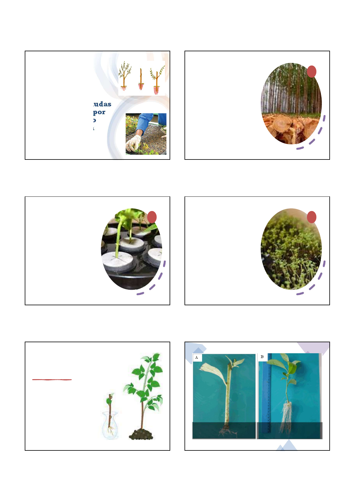 31/01/2022 Produção de mudas de eucalipto por propagação vegetativa Universidade Federal de Minas Gerais - UFMG Instituto de Ciências Agrárias - ICA Silvicultura PROF. NILZA DE LIMA PEREIRA SALES Introdução • “A alta competitividade do mercado leva a utilização de tecnologias que minimizam o custo de implantação, aumentando-se a rentabilidade da atividade florestal.” • Alcance desse objetivos – propagação de genótipos superiores desenvolvidos por programas de melhoramento florestal + produção de mudas de qualidade. Clonagem • Clonagem: formação de indivíduos geneticamente idênticos a partir de células matriz e a ocorrência de reprodução assexuada. • Há necessidade de colocação rápida no mercado de plantas de ciclo de vida longo, geralmente espécies arbóreas e arbustivas selecionadas melhoramento genético. Clonagem • Início da clonagem de espécies florestais em escala comercial na década de 70 (eucalipto). Hoje praticamente todas as empresas do setor florestal. • Através da propagação vegetativa, há formação de plantios clonais de alta produtividade e uniformidade, além de garantia de melhores qualidades tecnológicas da madeira e seus produtos. Métodos de R. Vegetativa • Os métodos desenvolvidos até o momento são estaquia, miniestaquia, microestaquia e micropropagação. • A silvicultura clonal é prática consagrada na maioria das empresas brasileiras do setor de papel. • Atualmente são clonados principalmente híbridos naturais de E. urophylla e E. grandis (Urograndis). Estaca Miniestaca 31/01/2022 Microestaca Micropropagação Eucalyptus urophylla Eucalyptus grandis Propagação Vegetativa • Multiplicação assexuada de partes da planta (células, tecidos, órgãos ou propágulos), originando indivíduos idênticos à mãe, por meio de vários métodos (mergulhia, enxertia, estaquia e micropropagação). Mergulhia aérea Mergulhia Estaca Borbulhia Enxertia Micropropagação Propagação Clonal • Macropropagação: estaca e enxertia • Micropropagação: cultura de tecidos Métodos de Propagação do Eucalyptus • Estaquia: o enraizamento de estacas envolve a regeneração de meristemas radiculares diretamente a partir de tecidos associados com o tecido vascular, ou a partir do tecido caloso formado na base da estaca. É função da espécie, genótipo e nível de maturação da planta doadora. 31/01/2022 Métodos de Propagação do Eucalyptus • Tipos de estaca: Foliar; Radicular; Caulinar. • Tipos de estaquia: Macroestaquia; Microestaquia; Miniestaquia. Estacas caulinares e foliares Estaca foliar Enraizamento estaca Microestaquia Miniestaquia Macroestaquia Macroestaquia • Consiste em retirar pequenas estacas (15- 20cm) em jardins clonais de campo; • Jardins clonais: recebem tratamento intensivo de irrigação, adubação e espaçamento – otimização da produção de brotos; Jardim clonal no campo Jardim Clonal Jardim Clonal Suspenso 31/01/2022 Macroestaquia • Estacas obtidas de plantas nos jardins clonais com 0,5m de altura; • Coleta seletiva de brotações (evita-se patógenos e também estresse na planta geradora), aproveitamento de 50-70%. Microestaquia • Consiste em retirar microestacas (3-5cm) em jardins microclonais, formados de mudas micropropagadas anteriormente, através de cultura de tecidos. Vantagens do uso de microjardim clonal • Controle mais efetivo de todo o processo (espaço reduzido); • Redução da área necessária para a produção de brotos; • Maior controle de irrigação, fertilização, pragas e doenças; • Redução e eliminação de operações como transporte de brotos e tratos culturais; Vantagens do uso de microjardim clonal • Não-necessidade de uso de reguladores de crescimento para enraizamento; • Aumento da produtividade por área; • Aumento da eficiência do viveiro (melhor enraizamento, qualidade do sistema radicular, maior velocidade de emissão de raízes – melhor qualidade das mudas); Vantagens do uso de microjardim clonal • Menor número de mão-de- obra; • Menor permanência para enraizamento (15-20 dias ao invés de 30 dias na macroestaquia); • Maior taxa de crescimento e sobrevivência de mudas no campo; • Maior homogeneidade dos plantio comerciais. Miniestaquia • Caracteriza-se pela utilização de brotações de plantas propagadas pelo método de estaquia convencional como fontes de propágulos vegetativos, não promovendo previamente o seu rejuvenescimento “in vitro”. 31/01/2022 Miniestaquia • Técnica recente que surgiu das limitações da microestaquia (obtenção de material rejuvenescido em laboratório de micropropagação) ou sejam: Estruturais, operacionais e de custo. Hidrojardim Clonal • Cultivo do Microjardim ou do Minijardim clonal em sistema hidropônico; • Consiste em tubetes imersos na solução nutritiva. Evolução dos jardins clonais pra produção de estacas Local Espaçamento de plantio Idade da 1ª poda (dias) Freqüência de coleta (dias) Tamanho da estaca (cm) Produtividade média(estacas/ m²/ano) Época Campo 3 X 3 m 540 30 – 40 10 – 15 114 Dec. 80 Campo 1 X 1,5 m 180 40 – 60 121 Início 90 Campo 0,5 X 0,5 m 30 – 40 40 – 60 6 – 8 1.752 1995- 99 Viveiro Tubete (55cm³) 30 – 40 15 – 20 2 - 3 29.200 1996 Viveiro 0,1 X 0,1 m (Sistema hidropônico) 20 - 30 7 - 15 2 - 3 41.480 1999 Comparativo entre estaquia e micropropagação Itens Estaquia Microestaquia Área de multiplicação vegetativa •Localização •Produção de brotações/m²/coleta •Intervalo de coleta (dias) •Tamanho de estacas/microestacas (cm) •Tamanho das estacas/microcepas (cm) Jardim Clonal Jardim clonal 400 estacas 40 – 45 6 – 8 30 – 40 Jardim Microclonal Viveiro 1.400 microestacas 15 – 20 2 – 3 6 – 8 Produção de mudas (viveiro) •Permanência em casa de vegetação (dias) •Permanência em case de sombra (dias) •Muda pronta (dias) •Uso de hormônio para enraizamento (AIB) 30 – 