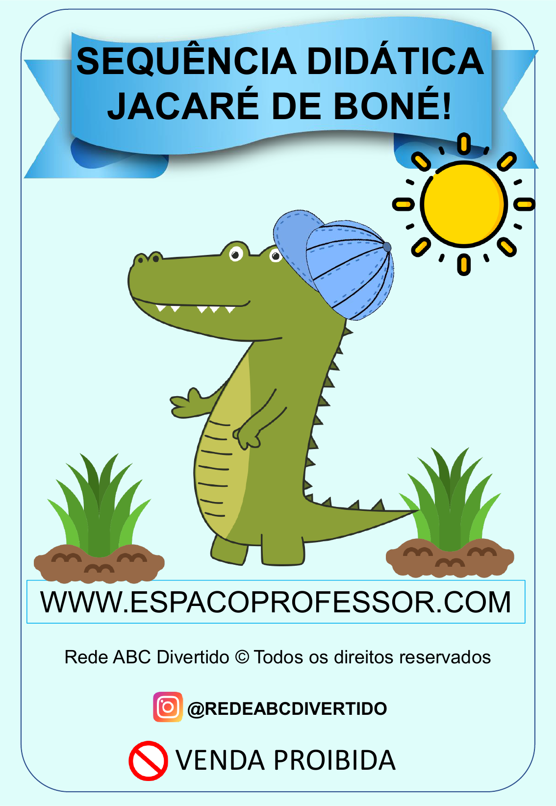 @REDEABCDIVERTIDO Rede ABC Divertido © Todos os direitos reservados VENDA PROIBIDA WWW.ESPACOPROFESSOR.COM SEQUÊNCIA DIDÁTICA JACARÉ DE BONÉ! Conheça nossos blogs (atividades gratuitas) e lojas (atividades pagas) com atividades incríveis. Quero baixar atividades gratuitamente! Quero comprar apostilas completas! Clique nos ícones abaixo! Quero receber as atividades para seguidores! Siga! LEIA O TEXTO: JACARÉ DE BONÉ ERA UM JACARÉ MUITO LELÉ. GOSTAVA DE TOMAR SOL USANDO BONÉ . ELIANA DE OLIVEIRA COMPREENSÃO DA LEITURA 1. TÍTULO DO TEXTO:__________________________ 2. COMO ERA O JACARÉ? _____________________________________________ 3. O QUE O JACARÉ GOSTAVA DE FAZER? _____________________________________________ _____________________________________________ 4. QUE PALAVRAS RIMAM NO TEXTO? _____________________________________________ ESCREVA OS NOMES DOS DESENHOS. 1.LEIA O TEXTO E PINTE OS ESPAÇOS ENTRE AS PALAVRAS. ❖ CIRCULE AS PALAVRAS QUE RIMAM. ❖ CIRCULE A PALAVRA JACARÉ. JACARÉ DE BONÉ 2. COMPLETE O TEXTO COM AS PALAVRAS QUE FALTAM. ERA UM JACARÉ MUITO LELÉ. GOSTAVA DE TOMAR SOL USANDO BONÉ . ELIANA DE OLIVEIRA ERA UM _______________ MUITO LELÉ. GOSTAVA DE TOMAR ____________ USANDO ______________ . ORGANIZE E COLE O TEXTO. JACARÉ DE BONÉ ERA UM JACARÉ MUITO LELÉ. GOSTAVA DE TOMAR DE SOL USANDO BONÉ. JACARÉ DE BONÉ ERA UM JACARÉ MUITO LELÉ. GOSTAVA DE TOMAR DE SOL USANDO BONÉ. 1.CIRCULE A SÍLABA INICIAL E COMPLETE A PALAVRA. JA JE JI JO JU ___CARÉ BA BE BI BO BU ___NÉ SAL SEL SIL SOL SUL _____ 2. CIRCULE O DESENHO QUE COMECA COM A MESMA SÍLABA DE: 1. ENCONTRE OS NOMES DOS DESENHOS E ESCREVA A PALAVRA. SO SOL HA GA TI SA JA CA RÉ VAS BO NÉ 2. PINTE A QUANTIDADE DE SÍLABAS E ESCREVA NOS QUADRINHOS. BONÉ SOL JACARÉ 1. LEIA E ENUMERE AS PALAVRAS OBSERVANDO A LEGENDA. JACARÉ BONÉ SOL 1 2 3 2. MARQUE AS SÍLABAS QUE FORMAM AS PALAVRAS. VA PO BO NÉ JA GA CA RÉ SO SOL OL CO 1.ESCREVA OS NOMES DOS DESENHOS E COMPLETE O QUADRO. __________ _________ _________ BO NÉ JA RÉ CA SOL 2. SEPARE EM SÍLABAS AS PALAVRAS. SOL BONÉ JACARÉ LEIA COM ATENÇÃO! Material protegido pela Lei de Direitos Autorais. Ao comprar esse material você adquire o direito de uso pessoal do arquivo. Não é permitido repassar o arquivo para outras pessoas. Esse material está sendo cedido a você para ser usado em sua prática no processo de ensino- aprendizagem. Não é autorizado a sua distribuição em sites, blogs ou redes sociais. É proibido a comercialização desse arquivo. Todos os direitos relativos a essa obra pertencem a REDE ABC DIVERTIDO CNPJ 37.491.604/0001-98 Distribuir esse conteúdo é crime e quem compartilha pode ser penalizado. CUIDADO! IMAGENS USADAS EM NOSSAS ATIVIDADES CONHEÇA NOSSO INSTAGRAM! @REDEABCDIVERTIDO