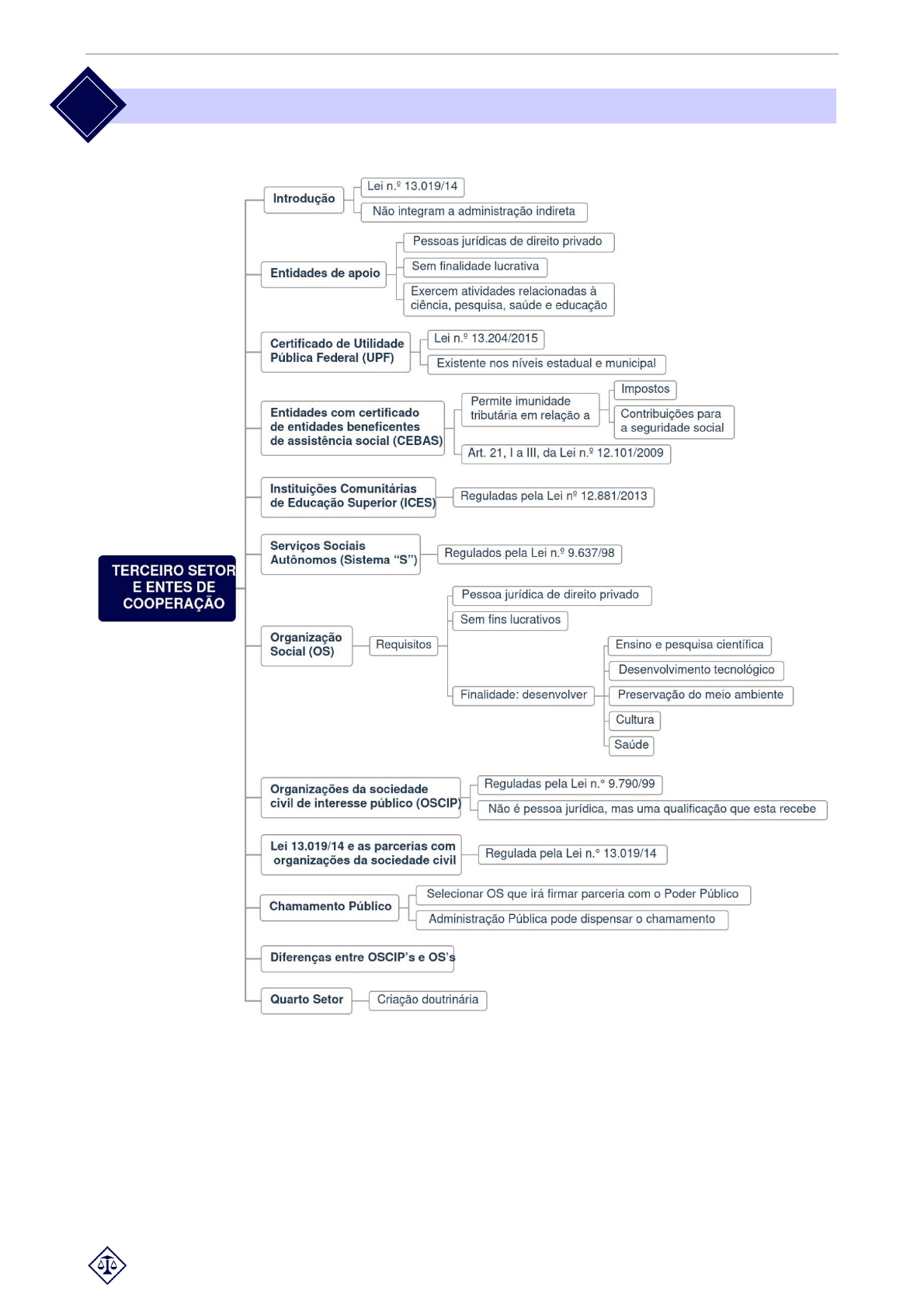 FLÁVIA LIMMER TERCEIRO SETOR E ENTES DE COOPERAÇÃO • 4 83 TERCEIRO SETOR E ENTES DE COOPERAÇÃO 4 FLÁVIA LIMMER TERCEIRO SETOR E ENTES DE COOPERAÇÃO • 4 84 Para entender o terceiro setor, é interessante esclarecer quais são os demais. O primeiro setor é o Estado, e o segundo a iniciativa privada/mercado. No terceiro estão organismos, instituições ou organizações sem fins lucrativos que realizam projetos de interesse do Estado. Desempenham atividades em áreas que não são de atuação exclusiva do Poder Público, com o objetivo de agir junto à sociedade, visando a sua melhora e desenvolvimento. Estes entes de cooperação não integram a administração indireta e compreendem: • Serviços Sociais Autônomos (Sistema S); • Entidades de Apoio; • Organizações Sociais (OS); • Organizações da Sociedade Civil de Serviço Público (OSCIP); Ronny Charles56 prefere inserir essas últimas duas entidades (OS e OSCIP) dentro do terceiro setor, que para ele inclui: • Organizações Sociais (OS); • Organizações da Sociedade Civil de Serviço Público (OSCIP); • Entidades de Utilidade Pública Federal (UPF); • Entidades com certificado de entidades beneficentes de assistência social (CEBAS); • Instituições Comunitárias de Ensino Superior (ICES). É bom ressaltar que existem autores que se utilizam da expressão terceiro setor como sinônimo de entes de cooperação. De toda sorte, a Lei n.º 13.019/2014 estabelece o regime jurídico das parcerias entre a Administração Pública e as organizações da sociedade civil, em regime de mútua cooperação, para a consecução de finalidades de interesse público e recíproco. Importante ter em mente que essas pessoas jurídicas não pertencem ao Estado, e em regra se submetem ao regime jurídico de direito privado. O terceiro setor está em uma área intermediária, em princípio privada, mas que se volta para a execução de atividades privadas e auxilia o Estado no atendimento do interesse público e na realização de atividades que beneficiam a coletividade. Embora não integrem a Administração Pública, alguns entes do terceiro setor recebem fomento estatal e inclusive podem ser mantidos por recursos orçamentários ou contribuições parafiscais, que servem para custeio de atividades realizadas por entidades privadas que não integram funções próprias do Estado, mas que tenham finalidade pública. São chamadas de entidades paraestatais, pois atuam ao lado do Estado. Existiu uma longa discussão quanto à submissão dessas entidades ao regime jurídico administrativo, que hoje estão pacificadas. Di Pietro57 já sustentava que os integrantes do terceiro setor são “predominantemente de direito privado, mas parcialmente derrogado por normas de direito público”. O STF, na ADI 1923/DF, determinou que trata-se de um regime híbrido: por receberem recursos públicos, bens públicos e servidores públicos, o regime jurídico das organizações sociais tem de ser minimamente informado pela incidência dos princípios da Administração Pública (CF, art. 37, caput). Resumidamente: • Não há obrigatoriedade de licitação; • Apesar de afastado o dever de licitar, os princípios administrativos devem ser observados; • As compras e contratações com emprego de recursos públicos devem ocorrer mediante regulamento próprio, com a devida publicidade e pautados pelos princípios administrativos; • Os contratos de trabalho destas instituições são regidos pela CLT. 56 TORRES, Ronny Charles Lopes de. Terceiro Setor: entre a liberdade e o controle. Salvador: Juspodivm, 2013. 57 DI PIETRO, Maria Sylvia Zanella. Direito Administrativo 33ª ed. São Paulo: GenForense, 2020. Livro eletrônico não paginado. FLÁVIA LIMMER TERCEIRO SETOR E ENTES DE COOPERAÇÃO • 4 85 O Estado e o terceiro setor firmam parcerias, ações públicas para aprimorar projetos e prestação de serviços de interesse da sociedade. São os chamados acordos administrativos colaborativos que, segundo Justino de Oliveira, tem por fim instituir vínculos de colaboração entre o Estado e a sociedade civil. A finalidade desses vínculos colaborativos é promover a efetivação do direito ao desenvolvimento, principalmente por meio da realização de serviços sociais58. É na concepção de parceria da Administração Pública com a sociedade civil que nasce o terceiro setor. Seu grande diferencial quando comparado com os demais entes de cooperação é que o terceiro setor realiza as atividades independentemente da vontade estatal. É justamente sua área de atuação que vai justificar a iniciativa do Estado de fomentar o terceiro setor, através de parcerias. As entidades desse setor não são criadas por lei; as seguintes características – cumulativamente – são necessárias a elas para que façam parte do terceiro setor: • Pertencer à iniciativa privada, nem direta ou indiretamente; • Não ter finalidade lucrativa; • Dotadas de personalidade jurídica; • Exercer atividades voluntária. São elementos essenciais para caracterização do terceiro setor: • Origem privada, fora do Estado; • Inexistência de finalidade lucrativa; • Objetivos e ações devem envolver atividades de interesse público. Existem outras entidades paraestatais que contribuem para a persecução de finalidades públicas, como as entidades fechadas. Existe uma diferença entre terceiro setor e entidade fechada. Na entidade fechada, a atuação está restrita a determinado grupo social, voltada aos seus interesses (associações de classe, sindicatos, clubes, etc.). Alguns autores entendem que as entidades fechadas poderiam ser inseridas dentro do terceiro setor, mas, na verdade, não seria possível. Isso porque as entidades fechadas têm diferentes finalidades. Ainda, no terceiro setor há interesses altruísticos que estão sendo defendidos para toda a sociedade; já as entidades fechadas realizam suas atividades não em prol da cole