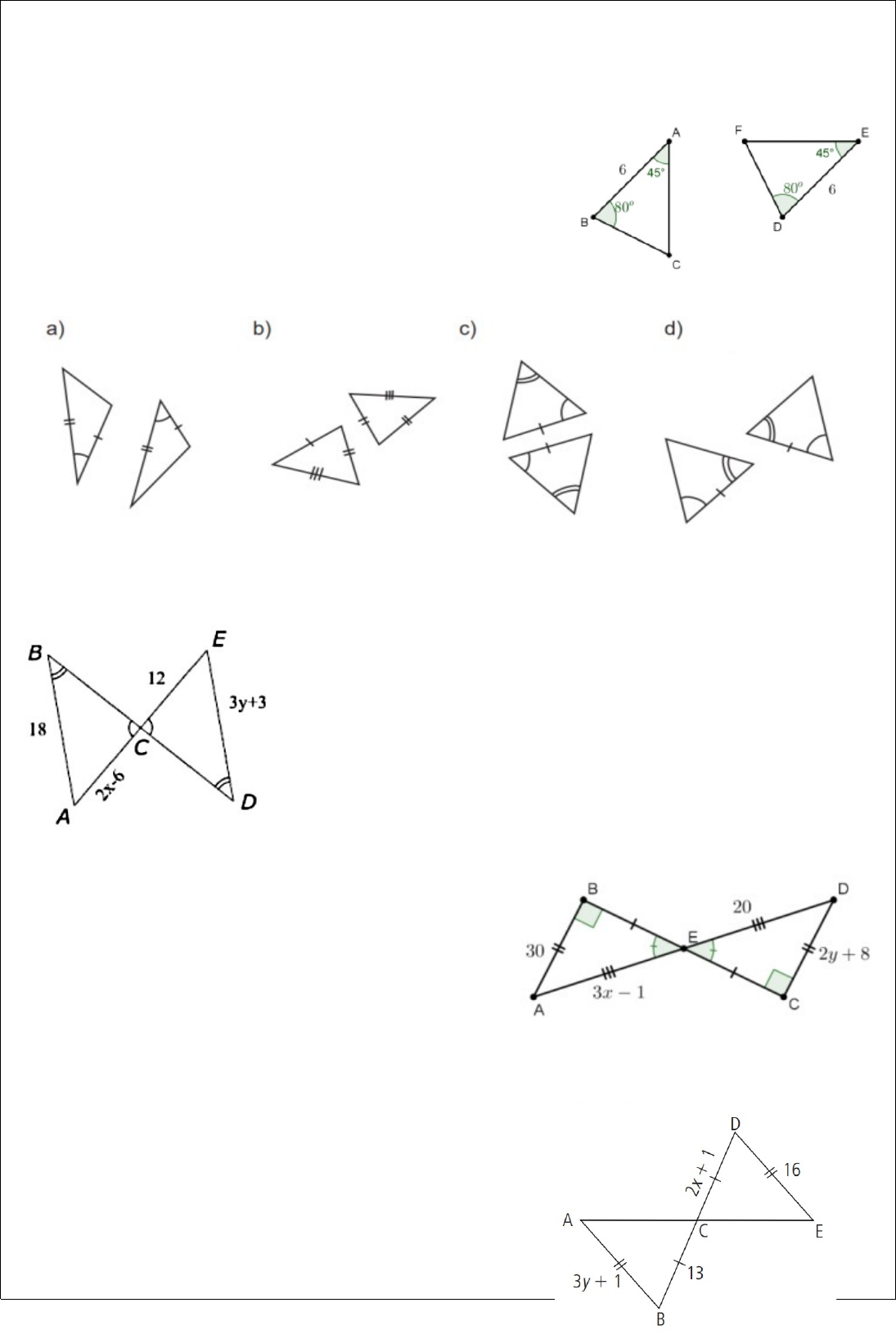 TRABALHO DE MATEMÁTICA Questão 01: Os triângulos ABC e DEF são congruentes? Justifique. _______________________________________________________________________________________________________________________________________________ Questão 02: Os pares de triângulo abaixo são congruentes. Indique o caso de congruência. ______________ ________________ _______________ _______________ Questão 03: Na figura, o triângulo ABC é congruente ao triângulo CDE. Quanto vale x + y? Questão 04: Na figura, os triângulos são congruentes. Qual o valor de x e y? Questão 05: Os triângulos ABC e EDC são congruentes. Então a soma x + y é igual a: Questão 06: Na figura abaixo, os dois triângulos são congruentes e os ângulos A e E, internos a cada um desses triângulos, têm a mesma medida. Dessa forma, x e y são? Questão 07: Se na figura abaixo, ∆ ABC ≡ ∆ EDC, então é igual a: Questão 08: Cite em cada item o caso de congruência dos triângulos. Boa Sorte! image4.png image5.png image6.png image7.png image8.png image1.png image2.png image3.png