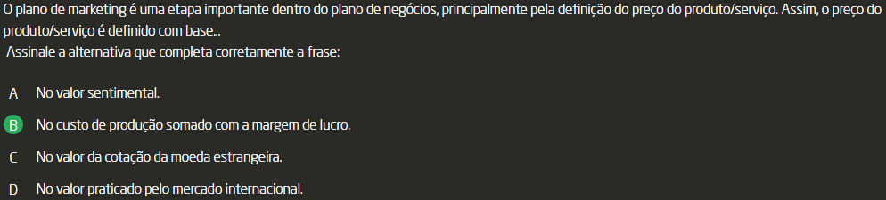 plano de marketing é uma etapa importante dentro do plano de negócios, principalmente pela definição do preço do produto/serviço. Assim, preço do produto/serviço é definido com base... Assinale a alternativa que completa corretamente a frase: A No valor sentimental. B No custo de produção somado com a margem de lucro. C No valor da cotação da moeda estrangeira. D No valor praticado pelo mercado internacional.