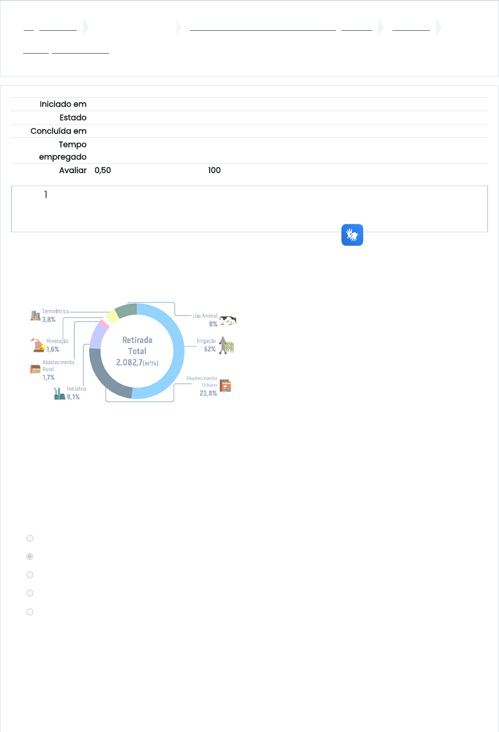 07/10/2023, 00:55 Avaliação - Unidade I: Revisão da tentativa https://ambienteonline.uninga.br/mod/quiz/review.php?attempt=1939895&cmid=462475 1/8 Página inicial Minhas disciplinas 2023/1 - Fundamentos Básicos da Engenharia UNIDADE I Avaliação - Unidade I Iniciado em quinta, 9 mar 2023, 04:34 Estado Finalizada Concluída em sábado, 11 mar 2023, 08:17 Tempo empregado 2 dias 3 horas Avaliar 0,50 de um máximo de 0,50(100%) Questão 1 Correto Atingiu 0,05 de 0,05 A água é um dos bens mais preciosos que temos, sem ela, não haveria vida. Para isso devemos nos conscientizar e preservar os mananciais e o percurso do rio por completo. Estudos realizados pela Agência Nacional de Águas e Saneamento Básico (ANA, 2019), registram que no Brasil são retirados a cada segundo 2.083m³/s, abaixo podemos ver a distribuição do consumo de água no Brasil por setor. Com base nas informações acima e seus conhecimentos em regra de três, analise as afirmativas a seguir e identifique o que for correto. I. Para o uso animal é destinado um volume aproximado de 166 m³/s. II. Para o abastecimento urbano é utilizado um volume aproximado de 1,7x10 m³/h. III. Para o abastecimento rural é utilizado um volume aproximado de 1,27x10 m³/h. IV. Para o abastecimento industrial é utilizado por dia um volume aproximado de 1,6x10 m³. Dados: 1h = 3600 s. 1m³ = 1000L a. Somente a I está correta. b. Todas estão corretas. c. Somente a II e IV estão corretas. d. Somente a I e III estão corretas. e. Somente a I e IV estão corretas. 6 5 7 A resposta correta é: Todas estão corretas. 07/10/2023, 00:55 Avaliação - Unidade I: Revisão da tentativa https://ambienteonline.uninga.br/mod/quiz/review.php?attempt=1939895&cmid=462475 2/8 Questão 2 Correto Atingiu 0,05 de 0,05 Questão 3 Correto Atingiu 0,05 de 0,05 A engenharia é uma ciência que depende de vários fatores matemáticos, portanto é comum nos depararmos com produtos notáveis, fatoração entre outros, durante o curso em diversas disciplinas diferentes. Sabendo disso analise as afirmativas abaixo e identifique, com base nos conhecimentos de fatoração, fator comum e agrupamento, a (as) alternativa(s) correta(s): I. Podemos dizer que o quadrado da soma é identificado por (x + y)². II. Podemos dizer que o cubo da soma é identificado por (x - y)³. III. Podemos analisar que a diferença de cubos é (x - y).(x² + xy - y²). IV. Podemos descrever que o quadrado da diferença é x² - 2xy - y². a. Somente a assertiva II está correta. b. Somente a assertiva I está correta. c. Somente as assertivas II e III estão corretas. d. Somente as assertivas I, II e III estão corretas. e. Somente as assertivas I e II estão corretas. A resposta correta é: Somente a assertiva I está correta. As operações elementares são fundamentais na vida do engenheiro, serão rotineiras e cotidianas seu uso, então frequentemente serão utilizadas no exercício da sua profissão. Com base nos conhecimentos de operações elementares, você, como engenheiro orçamentista, deverá cotar a manutenção de um grupo gerador que parou de funcionar. Para isso segue os dados que você encontrou: - O tempo de manutenção será de 3h e 30min. Estará incluso na manutenção, os materiais e mão de obra necessários. - O Engenheiro de manutenção precisará de ajuda de um auxiliar que custa R$ 90,00/h. O custo do engenheiro de manutenção é de R$ 150,00/h. - A máquina precisará trocar o óleo e o filtro. Você encontrou o filtro no valor de R$ 120,00. É necessário 8,75 L de óleo Especial para motor Selênia Perform 5W30, que custa R$ 38,50 /L. Agora com toda a informação que você conseguiu, analise as afirmativas abaixo e identifique a correta: a. O Custo do óleo é de R$ 236,68. b. O custo total da manutenção é de R$ 1296,80. c. O Custo da mão-de-obra é de R$ 525,00. d. O Custo de manutenção é de R$ 1396,76. e. O custo dos materiais necessários é de R$ 411,99. A resposta correta é: O custo total da manutenção é de R$ 1296,80. 07/10/2023, 00:55 Avaliação - Unidade I: Revisão da tentativa https://ambienteonline.uninga.br/mod/quiz/review.php?attempt=1939895&cmid=462475 3/8 Questão 4 Correto Atingiu 0,05 de 0,05 Números reais estão presentes em nosso dia-a-dia para toda atividade que praticamos, por isso, eles são fundamentais em nossa vida. Gomes (2018) explica que os números reais, são números divididos em diversos conjuntos, cada qual com sua origem e emprego específico. Compreendendo mais sobre os números reais, podemos dizer que sobre as operações elementares: ( ) ( x + y ) + z = x + ( y + z ) é uma propriedade associativa. ( ) x * y = y * x a ordem dos fatores não altera o produto, e é uma propriedade associativa da multiplicação. ( ) (x * y) = (y * x) a ordem dos fatores não altera o produto, e é uma propriedade comutativa da multiplicação. ( ) x * ( y + z) = (x * y) + (x * z) é uma propriedade de distributividade. a. F, F, V, V. b. V, V, V, V. c. F, V, V, F. d. V, F, V, V e. F, V, F, V. A resposta correta é: V, F, V, V 07/10/2023, 00:55 Avaliação - Unidade I: Revisão da tentativa https://ambienteonline.uninga.br/mod/quiz/review.php?attempt=1939895&cmid=462475 4/8 Questão 5 Correto Atingiu 0,05 de 0,05 Os resíduos sólidos urbanos (RSU) são grandes responsáveis pela contaminação de lençóis freáticos, rios, lagos e mananciais, quando descartados incorretamente. Por isso, a conscientização é fundamental. Com base nos dados apresentados acima, identifique o que for correto. I. De 2010 para 2019, a destinação adequada teve um aumento de 4,75%. II. De 2010 para 2019, a destinação inadequada perdeu 3,2%. III. Em 2019, a destinação inadequada ainda é superior que a adequada. IV. Em 2019, houve apenas um aumento de destinação correta de 10%. a. Somente a I e III estão corretas. b. Somente a I e IV estão corretas. c. Todas estão corretas. d. Somente a II e IV estão corretas. e. Somente a I está c