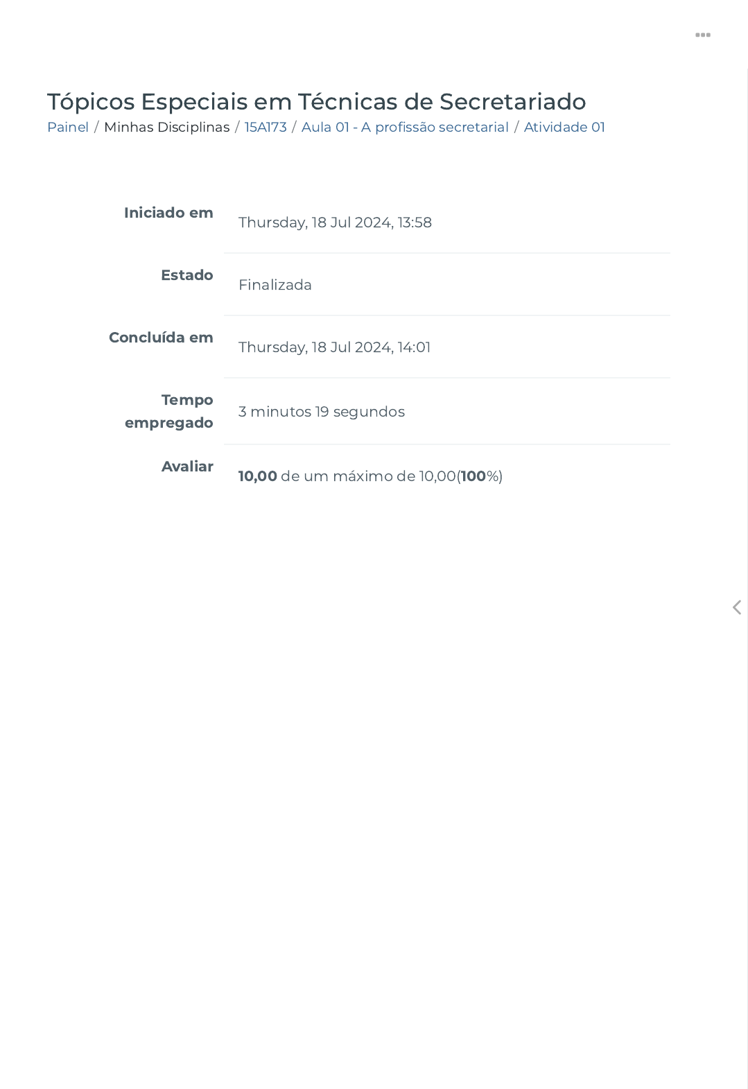 Painel / Minhas Disciplinas / 15A173 / Aula 01 - A pro�ssão secretarial / Atividade 01 Tópicos Especiais em Técnicas de Secretariado Iniciado em Thursday, 18 Jul 2024, 13:58 Estado Finalizada Concluída em Thursday, 18 Jul 2024, 14:01 Tempo empregado 3 minutos 19 segundos Avaliar 10,00 de um máximo de 10,00(100%) https://ava.politecnicabr.com.br/my/ https://ava.politecnicabr.com.br/my/ https://ava.politecnicabr.com.br/course/view.php?id=932 https://ava.politecnicabr.com.br/course/view.php?id=932#section-2 https://ava.politecnicabr.com.br/mod/quiz/view.php?id=24893 https://ava.politecnicabr.com.br/ Questão 1 Correto Atingiu 2,00 de 2,00 Azevedo e Costa igualmente indicam a alteração do per�l secretarial, sinalizando a necessidade de competência em, exceto a opção: Escolha uma opção: a. gestão, compreendendo o exercício das funções de planejamento, organização, liderança e controle. b. assessoria que diz respeito ao exercício das funções de planejamento, organização, liderança e controle. c. assessoria que diz respeito à capacidade de trabalhar ao lado dos centros de poder e decisão. d. empreendedorismo que representa a capacidade re�exiva e criativa para identi�car e solucionar problemas e promover práticas inovadoras. https://ava.politecnicabr.com.br/ Questão 2 Correto Atingiu 2,00 de 2,00 Qual a lei que Dispõe sobre a atividade de Secretário e dá outras providências? Escolha uma opção: Questão 3 Correto Atingiu 2,00 de 2,00 Podemos a�rmar que a atuação do secretário hoje é muito é bem mais operacional do que estratégica, fazendo-se, portanto, respeitada e valorizada pelo mercado. Escolha uma opção: a. Lei 7.556, de 12 de setembro de 1988 b. Lei 11.556, de 12 de setembro de 1988 c. Lei 8.656, de 5 de setembro de 1978 d. Lei 6.556, de 5 de setembro de 1978 Verdadeiro Falso https://ava.politecnicabr.com.br/ Questão 4 Correto Atingiu 2,00 de 2,00 A pro�ssão de secretariado surgiu nas civilizações antigas, na �gura dos escribas, que foram os primeiros a serem conhecidos como assessores, pro�ssionais que dominavam a escrita, com alto nível de intelectualidade e conhecimento cultural e, por isso, ocupavam lugares de prestígio na sociedade, eram respeitados por todos, além de colaborarem na perpetuação do conhecimento por meio da prática da escrita. Escolha uma opção: Questão 5 Correto Atingiu 2,00 de 2,00 Podemos a�rmar que o secretário envolve-se com a projeção de ações, delineamento dos objetivos, de�nição de prioridades e prazos e a metodologia a ser adotada na ação, ou seja, preocupa-se com o que fazer, para que fazer, quando fazer, além do como fazer. Escolha uma opção: Verdadeiro Falso Verdadeiro Falso https://ava.politecnicabr.com.br/ © 2022 - Escola Politécnica Brasileira Entre em Contato https://www.politecnicabr.com.br 0800 084 2627 0800 084 2627 Links Úteis Dicas da nossa Diretora Acadêmica Planner de Estudos Declaração de Matrícula Orientações do AVA Abertura de Ticket Fale com o Tutor Cronograma de Estudos Manual de Estágio Manual de Competência Siga-nos nas redes sociais https://ava.politecnicabr.com.br/mod/quiz/0 https://ava.politecnicabr.com.br/mod/quiz/0 https://www.politecnicabr.com.br/ https://soundcloud.com/user-501638417/sets/escola-politecnica-brasileira https://soundcloud.com/user-501638417/sets/escola-politecnica-brasileira https://storage.googleapis.com/sirius-pubstore/semestre_plannerdeestudo%20poli.pdf https://storage.googleapis.com/sirius-pubstore/semestre_plannerdeestudo%20poli.pdf https://storage.googleapis.com/sirius-pubstore/declaracao_matricula.pdf https://storage.googleapis.com/sirius-pubstore/declaracao_matricula.pdf https://storage.googleapis.com/sirius-pubstore/orientacoes_ava.pdf https://storage.googleapis.com/sirius-pubstore/orientacoes_ava.pdf https://storage.googleapis.com/sirius-pubstore/abertura_ticket.pdf https://storage.googleapis.com/sirius-pubstore/abertura_ticket.pdf https://storage.googleapis.com/sirius-pubstore/fale_com_tutor.pdf https://storage.googleapis.com/sirius-pubstore/fale_com_tutor.pdf https://storage.googleapis.com/sirius-pubstore/cronograma_estudos.pdf https://storage.googleapis.com/sirius-pubstore/cronograma_estudos.pdf https://storage.googleapis.com/sirius-pubstore/manual_estagio.pdf https://storage.googleapis.com/sirius-pubstore/manual_estagio.pdf https://storage.googleapis.com/sirius-pubstore/manual_competencia.pdf https://storage.googleapis.com/sirius-pubstore/manual_competencia.pdf https://www.facebook.com/politecnicabr https://www.instagram.com/politecnicabr_oficial https://ava.politecnicabr.com.br/