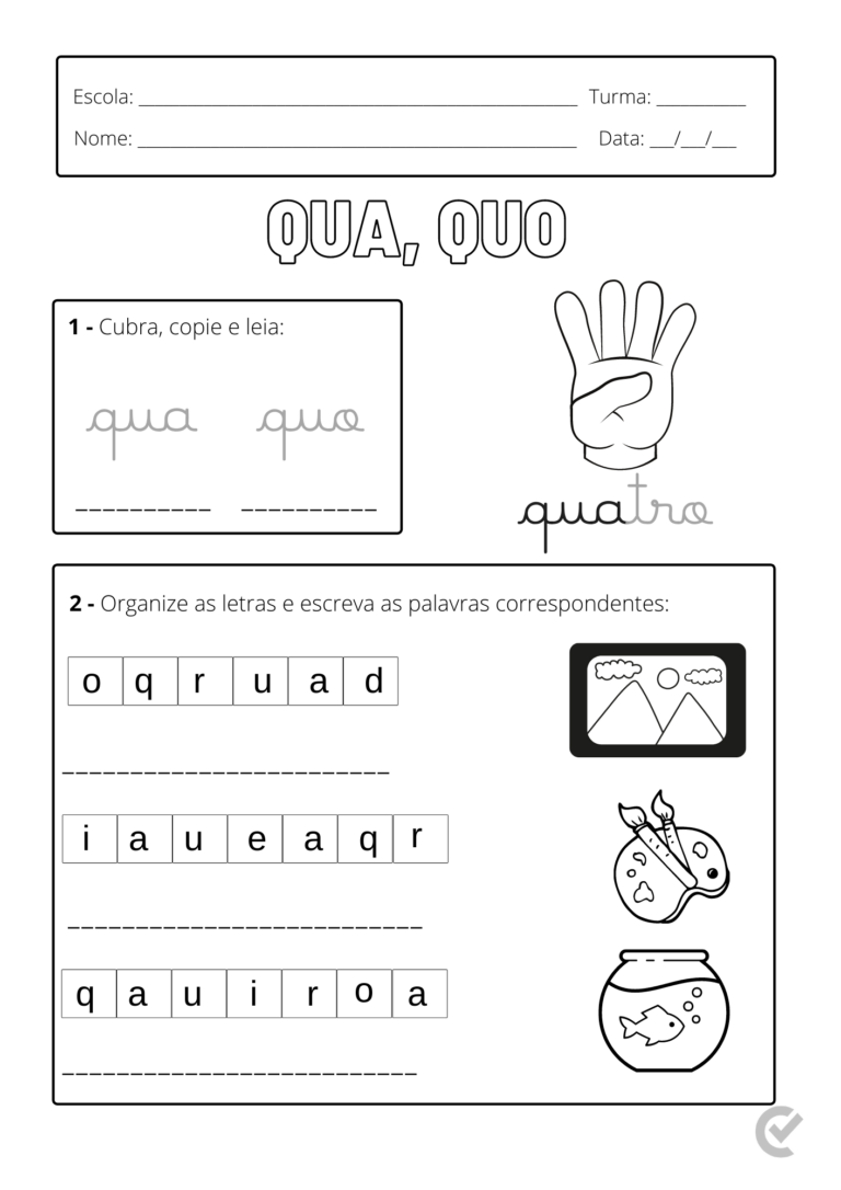 Escola: Turma: Nome: Data: / / QUA QUO - Cubra, copie e leia: qua quatro - Organize as letras e escreva as palavras correspondentes: oqruad