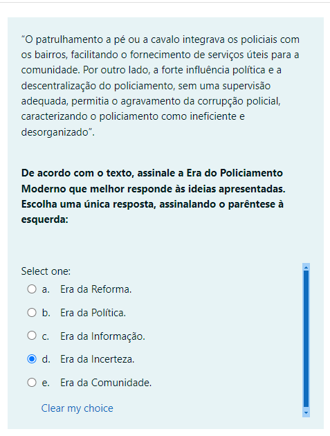 "O patrulhamento a pé ou a cavalo integrava os policiais com os bairros, facilitando o fornecimento de serviços úteis para a comunidade. Por outro lado, a forte influência política e a descentralização do policiamento, sem uma supervisão adequada, permitia o agravamento da corrupção policial, caracterizando policiamento como ineficiente e desorganizado". De acordo com o texto, assinale a Era do Policiamento Moderno que melhor responde às ideias apresentadas. Escolha uma única resposta, assinalando o parêntese à esquerda: Select one: a. Era da Reforma. b. Era da Política. C. Era da Informação. d. Era da Incerteza. e. Era da Clear my choice