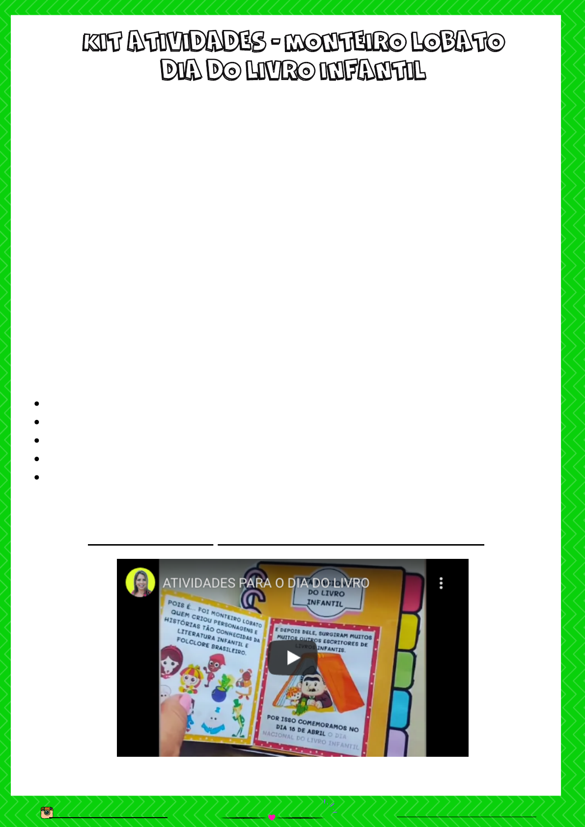 O aluno pode colar no caderno O professor pode trabalhar o recurso como cartaz e adaptar a atividade Competência leitora Trabalhar letra inicial e final Sílabas Este é um material didático, produzido por Mariana Fioravanti Ribeiro e tem todos os seus direitos reservados. Atividades para trabalhar estratégias de leitura e percepção visual de uma forma divertida. Com Pequenas ADIVINHAS para identificarem, adivinharem e lerem os nomes dos PERSONAGENS. HABILIDADES QUE PODEM SER CONTEMPLADAS: EF01LP09: Comparar palavras, identificando semelhanças e diferenças entre sons de sílabas iniciais, mediais e finais. EF02LP26: Ler e compreender, com certa autonomia, textos literários, de gêneros variados, desenvolvendo o gosto pela leitura. EDUCADORdeCORAÇÃO @coracao.deeducador WWW.CORACAODEEDUCADOR.COM KIT ATIVIDADES - MONTEIRO LOBATOKIT ATIVIDADES - MONTEIRO LOBATO DIA DO LIVRO INFANTILDIA DO LIVRO INFANTIL MAIS DETALHES, ASSISTA AO VÍDEO DO RECURSO https://www.instagram.com/coracao.deeducador/ https://www.instagram.com/coracao.deeducador/ https://coracaodeeducador.com/ https://www.youtube.com/watch?v=r70W5Vj1Wqc https://www.youtube.com/watch?v=r70W5Vj1Wqc DIA NACIONAL DO LIVRO INFANTIL MEU PERSONAGEM OU HISTÓRIA PREFERIDA DE MONTEIRO LOBATO É: POR QUE SERÁ QUE O DIA NACIONAL DO LIVRO INFANTIL É 18 DE ABRIL? POIS É... FOI MONTEIRO LOBATO QUEM CRIOU PERSONAGENS E HISTÓRIAS TÃO CONHECIDAS DA LITERATURA INFANTIL E FOLCLORE BRASILEIRO. POR QUE, ENTRE TANTOS DIAS QUE COMPÕEM UM ANO, O 18 DE ABRIL FOI ESCOLHIDO PARA COMEMORAR-SE O DIA NACIONAL DO LIVRO INFANTIL? ESSA DATA FOI ESCOLHIDA PORQUE FOI NESSE DIA E MÊS, DO ANO DE 1882, QUE NASCEU O ESCRITOR BRASILEIRO MONTEIRO LOBATO. AFINAL, QUE MELHOR DATA PARA CELEBRAR-SE O LIVRO INFANTIL DO QUE O ANIVERSÁRIO DESSE ESCRITOR QUE FOI O PRIMEIRO, NO BRASIL, A DEDICAR-SE À PRODUÇÃO LITERÁRIA VOLTADA ÀS CRIANÇAS? E DEPOIS DELE, SURGIRAM MUITOS MUITOS OUTROS ESCRITORES DE LIVROS INFANTIS. POR ISSO COMEMORAMOS NO DIA 18 DE ABRIL O DIA NACIONAL DO LIVRO INFANTIL VOCÊ PODE ATÉ NÃO SABER QUEM É MONTEIRO LOBATO, MAS.. COM CERTEZA VOCÊ JÁ OUVIU FALAR DO SÍTIO DO PICAPAU AMARELO! ESSA DATA FOI ESCOLHIDA PORQUE FOI NESSE DIA E MÊS, DO ANO DE 1882, QUE NASCEU O ESCRITOR BRASILEIRO MONTEIRO LOBATO. AFINAL, QUE MELHOR DATA PARA CELEBRAR-SE O LIVRO INFANTIL DO QUE O ANIVERSÁRIO DESSE ESCRITOR QUE FOI O PRIMEIRO, NO BRASIL, A DEDICAR-SE À PRODUÇÃO LITERÁRIA VOLTADA ÀS CRIANÇAS? POR QUE SERÁ QUE O DIA NACIONAL DO LIVRO INFANTIL É 18 DE ABRIL? POR QUE, ENTRE TANTOS DIAS QUE COMPÕEM UM ANO, O 18 DE ABRIL FOI ESCOLHIDO PARA COMEMORAR-SE O DIA NACIONAL DO LIVRO INFANTIL? VOCÊ PODE ATÉ NÃO SABER QUEM É MONTEIRO LOBATO, MAS.. COM CERTEZA VOCÊ JÁ OUVIU FALAR DO SÍTIO DO PICAPAU AMARELO! POIS É... FOI MONTEIRO LOBATO QUEM CRIOU PERSONAGENS E HISTÓRIAS TÃO CONHECIDAS DA LITERATURA INFANTIL E FOLCLORE BRASILEIRO. E DEPOIS DELE, SURGIRAM MUITOS MUITOS OUTROS ESCRITORES DE LIVROS INFANTIS. POR ISSO COMEMORAMOS NO DIA 18 DE ABRIL O DIA NACIONAL DO LIVRO INFANTIL NOME: ACHE OSPERSONAGENS "J AC AR O A" M ET ID A A BR UX A E FE IT IC EI RA . UMA VOVÓ SEMPRE ATENTA ÀS CONFUSÕES. BO N EC A DE P AN O TA G AR EL A E SE RE LE PE NETO DE DO NA BENTA, É UM M ENINO ESPERTO E LEVADO .UM MOLEQUE SAPECA QUE VIVE NA MATA, PULANDO AQUI E ALI. UM PORQUINHO QUE SE SALVOU DE IR PARA O FORNO. MELHOR COZINHEIRA DO SÍTIO. ELE É FEITO DE SUBUGO DE MILHO E TRATADO QUE NEM FILHO. NARIZINHO PEDRINHO DONA BENTA TIA ANASTÁCIA CUCA VISCONDE DE SABUGOSA EMÍLIA SACI NOME: ACHE OS PERSONAGENS CU CA DO NA BE NT A VI SC O N DE DE S AB UG O SA PEDRINHOSACI MARQUÊS DE RABICÓ TIA ANASTÁCIA EM ÍLIA AUTOR: MEU LIVRO PREFERIDO É... 18 DE ABRIL T ÍTULO: PERSONAGENS PRINCIPAIS PARTE QUE EU MAIS GOSTEI... @CORACAO.DEEDUCADOR DIA DO LIVRO INFANTIL @ C O R A C A O .D E E D U C A D O R DIA 18 DE ABRIL @ C O R A C A O .D E E D U C A D O R DIA NACIONAL DO LIVRO INFANTIL DIA 18 DE ABRIL @ C O R A C A O .D E E D U C A D O R DIA NACIONAL DO LIVRO INFANTIL