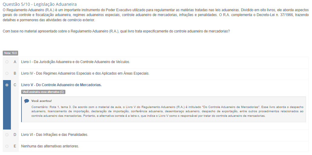 Questão 5/10 Legislação Aduaneira Regulamento Aduaneiro (R.A.) é um importante instrumento do Poder Executivo utilizado para regulamentar as matérias tratadas nas leis Dividido em oito livros, ele aborda aspectos gerais do controle e fiscalização regimes aduaneiros especiais, controle aduaneiro de mercadorias, infrações e penalidades. R.A. complementa 0 Decreto-Lei n. trazendo detalhes e pormenores das atividades de Com base no material apresentado sobre 0 Regulamento Aduaneiro qual livro trata especificamente do controle aduaneiro de mercadorias? Nota: 10.0 A Livro Da Jurisdição Aduaneira e do Controle Aduaneiro de B Livro IV Dos Regimes Aduaneiros Especiais e dos Aplicados em Áreas C Livro V Do Controle Aduaneiro de Você assinalou essa alternativa Você acertou! Comentário: Rota tema 3. De acordo com material de aula, Livro V do Regulamento Aduaneiro é intitulado "Do Controle Aduaneiro de Esse livro aborda despacho aduaneiro, licenciamento de declaração de conferência desembaraço despacho de entre outros procedimentos relacionados ao controle aduaneiro das Portanto, a alternativa correta é a letra c. que indica Livro V como responsável por tratar do controle aduaneiro de D Livro VI Das Infrações e das Penalidades E Nenhuma das alternativas