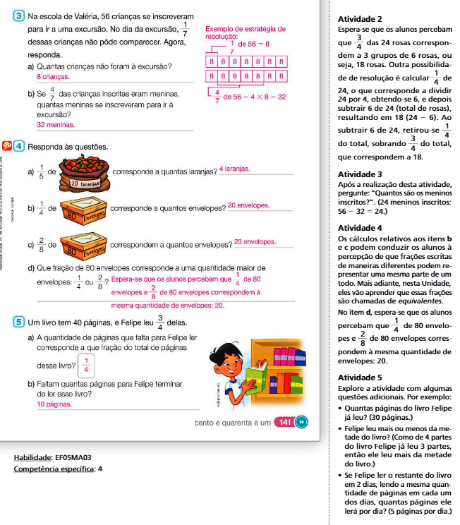 3 Na escola de 56 crianças se inscreveram Atividade 2 1 para in a uma No dia da excursão, Exemplo de estratégia de 7 Espera-se que os alunos percebam resolução: 3 dessas crianças não pôde comparecer. Agora, 1 de 56 - 8 que 4 das 24 rosas correspon- 7 responda. dem a 3 grupos de 6 rosas, ou 8 8 8 8 8 a) Quantas crianças não foram à excursão? seja, 18 rosas. Outra possibilida- 1 8 8 8 8 8 8 8 de de resolução é calcular de 4 b) Se das crianças inscritas eram 4 24, que corresponde a dividir 7 de 56 - 32 7 24 por obtendo-se 6, e depois quantas meninas se inscreveram para in à 6 de 24 (total de rosas), excursão? resultando em 32 subtrair 6 de 24, retirou-se 4 3 4 Responda às questões. do total, sobrando do total, 4 que correspondem a 18. a) 1 de corresponde a quantas laranjas? 4 laranjas. 5 Atividade 3 20 laranjas Após a realização desta atividade, pergunte: "Quantos são os meninos 1 20 (24 meninos inscritos: b) de corresponde a quantos envelopes? envelopes. 4 Atividade 4 Os cálculos relativos aos itens b c) 2 de a quantos envelopes? 20 8 e podem conduzir os alunos à percepção de que frações escritas d) Que fração de 80 envelopes corresponde a uma quantidade maior de de maneiras diferentes podem re- 1 presentar uma mesma parte de um envelopes: 1 ou 2 ? Espera-se que alunos percebam que de 80 todo. Mais adiante, nesta Unidade, 4 8 2 envelopes e de 80 envelopes correspondem à eles vão aprender que essas frações 8 são chamadas de equivalentes. mesma quantidade de envelopes: 20. No item d, espera-se que os alunos 3 5 Um livro tem 40 e Felipe leu 1 4 percebam que 4 de 80 envelo- 2 a) A quantidade de páginas que falta para Felipe ler pes e de 80 envelopes corres- 8 corresponde a que fração do total de pondem à mesma quantidade de 1 envelopes: 20. desse livro? 4 Atividade 5 b) Faltam quantas páginas para Felipe terminar Explore a atividade com algumas de livro? questões Por exemplo: 10 páginas. Quantas páginas do livro Felipe já leu? (30 páginas.) cento e quarenta e um 141 Felipe leu mais ou menos da me- tade do livro? (Como de 4 partes do livro Felipe já leu 3 partes, Habilidade: EF05MA03 então ele leu mais da metade do livro.) Competência 4 Se Felipe ler restante do livro em 2 dias, lendo a mesma quan- tidade de páginas em cada um dos dias, quantas páginas ele lerá por dia? (5 páginas por dia.)