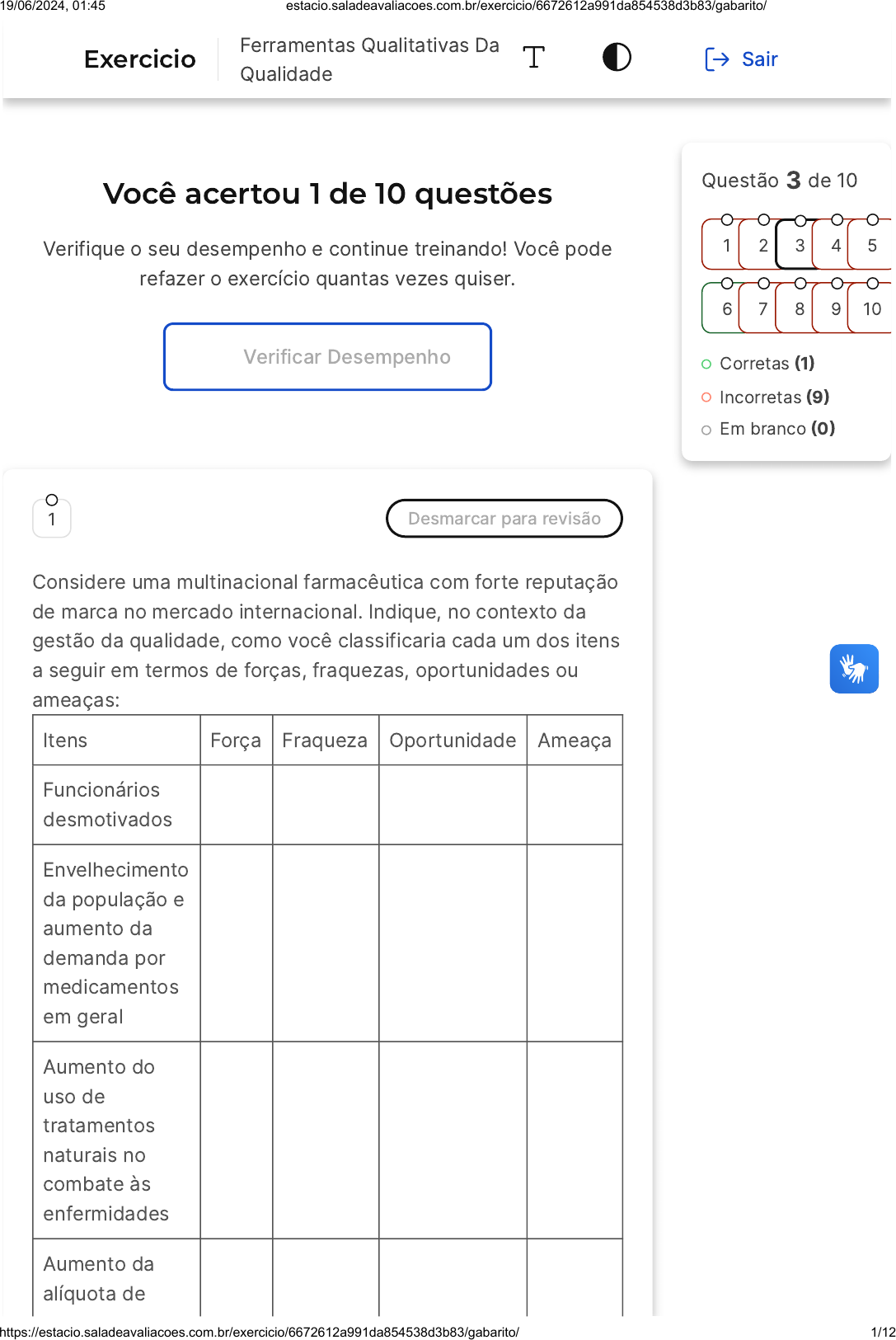 Você acertou 1 de 10 questões Verifique o seu desempenho e continue treinando! Você pode refazer o exercício quantas vezes quiser. Verificar Desempenho 1 Desmarcar para revisão Considere uma multinacional farmacêutica com forte reputação de marca no mercado internacional. Indique, no contexto da gestão da qualidade, como você classificaria cada um dos itens a seguir em termos de forças, fraquezas, oportunidades ou ameaças: Itens Força Fraqueza Oportunidade Ameaça Funcionários desmotivados Envelhecimento da população e aumento da demanda por medicamentos em geral Aumento do uso de tratamentos naturais no combate às enfermidades Aumento da alíquota de Questão 3 de 10 Corretas �1� Incorretas �9� Em branco �0� 1 2 3 4 5 6 7 8 9 10 Exercicio Ferramentas Qualitativas Da Qualidade Sair 19/06/2024, 01:45 estacio.saladeavaliacoes.com.br/exercicio/6672612a991da854538d3b83/gabarito/ https://estacio.saladeavaliacoes.com.br/exercicio/6672612a991da854538d3b83/gabarito/ 1/12 A B C D E impostos sobre a produção A marca é a mais lembrada pelos consumidores Indique a sequência correta: Ameaça; oportunidade; fraqueza; oportunidade; força. Fraqueza; oportunidade; ameaça; ameaça; força. Fraqueza; oportunidade; fraqueza; oportunidade; ameaça. Fraqueza; força; ameaça; fraqueza; força. Fraqueza; força; fraqueza; ameaça; força Resposta incorreta Opa! A alternativa correta é a letra B. Confira o gabarito comentado! Gabarito Comentado A resposta correta é: Fraqueza; oportunidade; ameaça; ameaça; força. 2 Desmarcar para revisão Um administrador, que está fazendo uma revisão das atividades realizadas em sua área visando à obtenção de mais eficiência, solicitou ao seu assistente a elaboração de um 19/06/2024, 01:45 estacio.saladeavaliacoes.com.br/exercicio/6672612a991da854538d3b83/gabarito/ https://estacio.saladeavaliacoes.com.br/exercicio/6672612a991da854538d3b83/gabarito/ 2/12 A B C D E fluxograma para que, assim, seu objetivo fosse alcançado. O fluxograma tem como objetivo primário: Demonstrar a sequência operacional de um processo, possibilitando a visualização do seu funcionamento. Estabelecer as relações de causa e efeito entre as atividades de um processo. Propor um determinado processo para a gerência da empresa. Estabelecer a quantidade de pessoas por unidade organizacional para a realização de um processo. Representar a estrutura formal da empresa para a realização de um processo. Resposta incorreta Opa! A alternativa correta é a letra A. Confira o gabarito comentado! Gabarito Comentado O fluxograma é uma ferramenta de gestão que tem como principal objetivo demonstrar a sequência operacional de um processo, permitindo a visualização clara de seu funcionamento. Ele é utilizado para entender e melhorar um processo, identificando seus pontos fortes e fracos. Portanto, a alternativa correta é a A� "Demonstrar a sequência operacional de um processo, possibilitando a visualização do seu funcionamento". 3 Desmarcar para revisão 19/06/2024, 01:45 estacio.saladeavaliacoes.com.br/exercicio/6672612a991da854538d3b83/gabarito/ https://estacio.saladeavaliacoes.com.br/exercicio/6672612a991da854538d3b83/gabarito/ 3/12 A B C D E O termo SWOT resulta da junção das iniciais das palavras inglesas Strengths (forças), Weaknesses (fraquezas), Opportunities (oportunidades) e Threats (ameaças). Para uma empresa que opera um estacionamento particular no centro da cidade de Goiânia, o aumento da fiscalização do poder público sobre os aspectos legais do estacionamento será considerado um(a): Ameaça. Oportunidade. Força. Fraqueza. Fator interno. Resposta incorreta Opa! A alternativa correta é a letra A. Confira o gabarito comentado! Gabarito Comentado Na análise SWOT, a fiscalização do poder público é considerada uma ameaça, pois é uma variável externa e não controlável que pode impactar negativamente o negócio. Neste caso, para a empresa que opera um estacionamento particular, o aumento da fiscalização pode resultar em multas ou até mesmo na suspensão das atividades, caso não esteja em conformidade com as normas legais. Portanto, é uma ameaça ao negócio. 19/06/2024, 01:45 estacio.saladeavaliacoes.com.br/exercicio/6672612a991da854538d3b83/gabarito/ https://estacio.saladeavaliacoes.com.br/exercicio/6672612a991da854538d3b83/gabarito/ 4/12 A B C D E 4 Desmarcar para revisão A técnica de geração de ideias, de modo comumente associativo, que pode, por sua vez, estimular novas ideias com a finalidade de solucionar problemas é denominada: Brainstorming Matriz GUT Diagrama de causa e efeito Benchmarking 5W2H Resposta incorreta Opa! A alternativa correta é a letra A. Confira o gabarito comentado! Gabarito Comentado A técnica descrita no enunciado é conhecida como Brainstorming. Esta é uma ferramenta de dinâmica de grupo que tem como objetivo explorar a potencialidade criativa de um indivíduo ou de um grupo - criatividade em equipe - colocando-a a serviço de objetivos pré- determinados. O termo pode ser traduzido como "tempestade de ideias". Dessa forma, o Brainstorming é uma técnica de geração de ideias de modo associativo, que pode estimular novas ideias para solucionar problemas. 19/06/2024, 01:45 estacio.saladeavaliacoes.com.br/exercicio/6672612a991da854538d3b83/gabarito/ https://estacio.saladeavaliacoes.com.br/exercicio/6672612a991da854538d3b83/gabarito/ 5/12 A B C D E 5 Desmarcar para revisão Ricardo é um gerente de um Shopping Center de grande volume de vendas e circulação de clientes. Esse shopping é considerado o melhor da cidade em qualidade no atendimento aos clientes. Na terça-feira passada, estava em sua sala de trabalho, analisando os conteúdos de desempenho que foram informados pela sua equipe de trabalho ao longo da última semana. Para melhor visualização durante a reunião semanal do shopping center, pensou e construiu com a própria classificação das letras �G�, �U� e �T