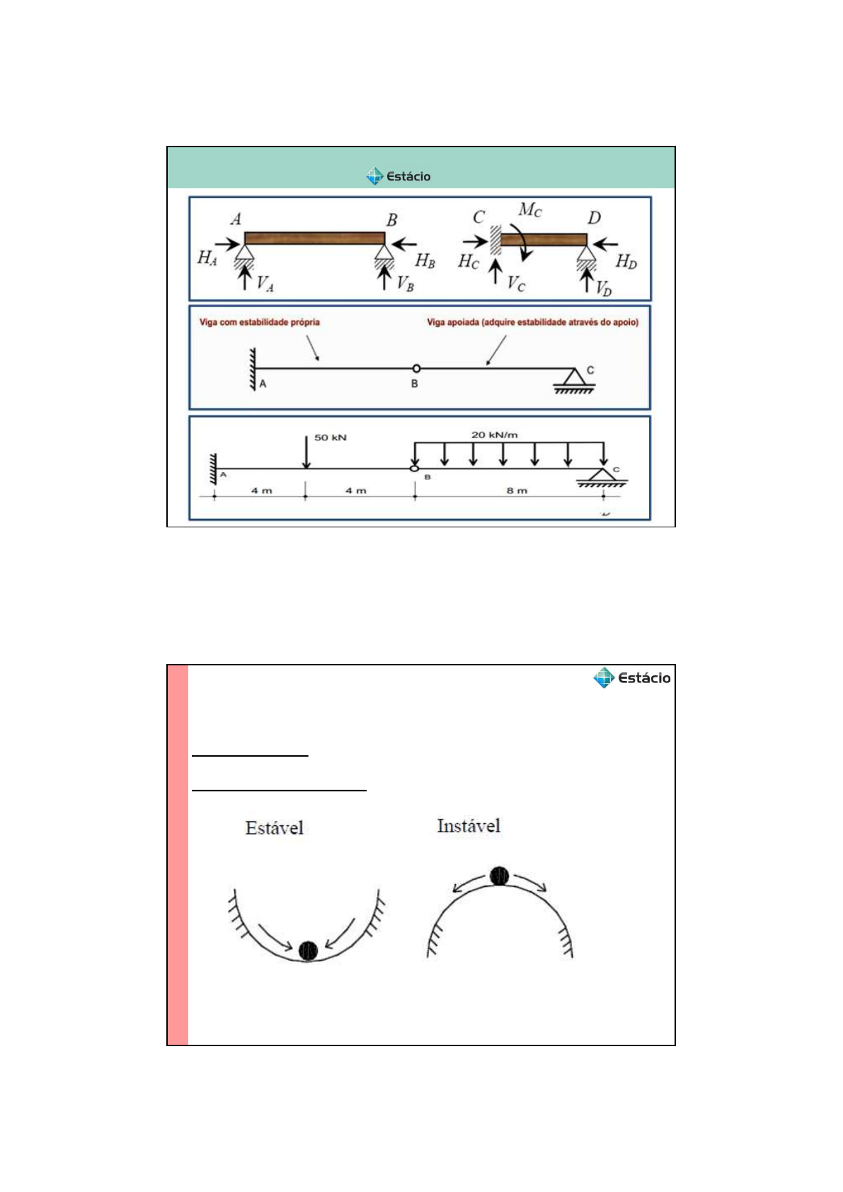 23/03/2023 TEORIA DAS ESTRUTRAS II AULA 04 Estaticidade e Estabilidade Estabilidade Tipos de Equilíbrio TE O RI A DA S ES TR U TU RA S II 23/03/2023 • Estruturas isostáticas: número de incógnitas (reações a serem determinadas) igual ao número de equações de equilíbrio distintas. Estaticidade e Estabilidade Estaticidade TE O RI A D A S ES TR U TU RA S II Estaticidade e Estabilidade Estaticidade • Estruturas hipoestáticas: número de incógnitas (reações a serem determinadas) é menor que o número de equações de equilíbrio distintas. TE O RI A DA S ES TR U TU RA S II 23/03/2023 Estaticidade e Estabilidade Estaticidade • Estruturas hiperestáticas: número de incógnitas (reações a serem determinadas) é maior que o número de equações de equilíbrio distintas. TE O RI A D A S ES TR U TU RA S II Estruturas Estaticamente Determinadas • As estruturas isostáticas – São classificadas: “Estaticamente Determinadas” • Por quê? – Porque as reações podem ser determinadas por: Condição de Equilíbrio em X 𝑅𝑥 = 𝐹𝑥= 0 Condição de Equilíbrio em Y 𝑅𝑦 = 𝐹𝑦= 0 Condição de Equilíbrio de Momentos 𝑀𝑅𝑜 = 𝑀𝑜 = 0 TE O RI A DA S ES TR U TU RA S II 23/03/2023 Cálculo: Grau de Hiperestaticidade • Calcula-se pela equação: 𝑔ℎ = 𝐶1 + 2. 𝐶2 +3. 𝐶3 −3. 𝑚 – gh: grau de hiperestaticidade • gh < 0 : hipostática • gh = 0 : isostática • gh > 0 : hiperestática – C1: vínculos que restrigem 1 grau de liberdade – C2: vínculos que restrigem 2 graus de liberdade – C3: vínculos que restrigem 3 graus de liberdade – m: número de barras do sistema TE O RI A D A S ES TR U TU RA S II Exemplo • Calcule o grau de hiperestaticidade Teoria das Estruturas I TE O RI A DA S ES TR U TU RA S II 23/03/2023 Exemplo • Calcule o grau de hiperestaticidade 𝑔ℎ = 𝐶1 + 2. 𝐶2 + 3. 𝐶3 − 3.𝑚 𝐶1 = 1 𝐶2 = 1 𝐶3 = 0 𝑚 = 1 𝑔ℎ = 1 + 2.1 + 3.0 −3.1 𝑔ℎ = 1 + 2 + 0 −3 𝑔ℎ = 0 Teoria das Estruturas I TE O RI A D A S ES TR U TU RA S II Exercício • Calcule o grau de hiperestaticidade 𝑔ℎ = 𝐶1 + 2. 𝐶2 + 3. 𝐶3 − 3.𝑚 𝐶1 = 1 𝐶2 = 1 𝐶3 = 0 𝑚 = 1 𝑔ℎ = 1 + 2.1 + 3.0 −3.1 𝑔ℎ = 1 + 2 + 0 −3 𝑔ℎ = 0 TE O RI A DA S ES TR U TU RA S II 23/03/2023 Exercício • Calcule o grau de hiperestaticidade 𝑔ℎ = 𝐶1 + 2. 𝐶2 + 3. 𝐶3 − 3.𝑚 𝐶1 = 0 𝐶2 = 2 𝐶3 = 0 𝑚 = 1 𝑔ℎ = 0 + 2.2 + 3.0 −3.1 𝑔ℎ = 0 + 4 + 0 −3 𝑔ℎ =-1 hipostática TE O RI A D A S ES TR U TU RA S II Exercício • Calcule o grau de hiperestaticidade 𝑔ℎ = 𝐶1 + 2. 𝐶2 + 3. 𝐶3 − 3.𝑚 𝐶1 = 2 𝐶2 = 1 𝐶3 = 0 𝑚 = 1 𝑔ℎ = 2 + 2.1 + 3.0 −3.1 𝑔ℎ = 2 + 2 + 0 −3 𝑔ℎ =1 hiperestática TE O RI A DA S ES TR U TU RA S II 23/03/2023 Exemplo TE O RI A D A S ES TR U TU RA S II Exemplo TE O RI A DA S ES TR U TU RA S II 23/03/2023 Exemplo TE O RI A D A S ES TR U TU RA S II Exemplo TE O RI A DA S ES TR U TU RA S II 23/03/2023 Exercício • Calcule o grau de hiperestaticidade 𝑔ℎ = 𝐶1 + 2. 𝐶2 + 3. 𝐶3 − 3.𝑚 𝐶1 = 2 𝐶2 = 2 𝐶3 = 0 𝑚 = 2 𝑔ℎ = 2 + 2.2 + 3.0 −3.2 𝑔ℎ = 2 + 4 + 0 −6 𝑔ℎ =0 isostática TE O RI A D A S ES TR U TU RA S II Exercício • Calcule o grau de hiperestaticidade 𝑔ℎ = 𝐶1 + 2. 𝐶2 + 3. 𝐶3 − 3.𝑚 𝐶1 = 1 𝐶2 = 2 𝐶3 = 0 𝑚 = 3 𝑔ℎ = 1 + 2.2 + 3.0 −3.3 𝑔ℎ = 1 + 4 + 0 −9 𝑔ℎ =-4 isostática TE O RI A DA S ES TR U TU RA S II 23/03/2023 VIGAS GERBER São vigas formadas pela associação de vigas simples isostáticas com alguma delas apoiadas em outras que lhes dão apoio. Vigas em balanço Vigas simplesmente apoiadas Vigas simplesmente apoiadas com balanços TE O RI A D A S ES TR U TU RA S II VIGAS GERBER Viga com estabilidade própria dará suporte a viga que não tiver estabilidade. Associação de vigas formando um conjunto com estabilidade. As ligações entre as partes se dá por articulações (fixas ou móveis). TE O RI A DA S ES TR U TU RA S II 23/03/2023 VIGAS GERBER Associação de vigas com estabilidade própria com outras sem estabilidade própria. As vigas com estabilidade própria suprem as demais dos vínculos que lhes faltam, ficando o conjunto estável. A ligação entre as partes se dá por meio de articulações (fixas ou móveis). Utilizado em pré-fabricados e montagem de estruturas. Motivos que justificam o “conjunto geral” da OBRA!!! TE O RI A D A S ES TR U TU RA S II VIGAS GERBER Tendência fabricados. TE O RI A DA S ES TR U TU RA S II 23/03/2023 VIGAS GERBER As vigas que dão suporte são acrescidas de cargas que lhes são transmitidas pelas rótulas. TE O RI A D A S ES TR U TU RA S II DECOMPOSIÇÃO VIGAS GERBER Para determinar cargas, precisa-se decompor a viga, isolando os seus vários trechos separando-as pelas articulações internas. A B C A B B C TE O RI A DA S ES TR U TU RA S II 23/03/2023 DECOMPOSIÇÃO VIGAS GERBER A B C VIGA SIMPLESMENTE APOIADA AB: se apoia na articulação fixa A e na viga em balanço BC por meio da articulação móvel B. VIGA em BALANÇO BC: dá apoio para a viga AB e se apoia apenas no engastamento C. TE O RI A D A S ES TR U TU RA S II TE O RI A DA S ES TR U TU RA S II 23/03/2023 A disposição das articulações ao longo da viga obedece a critérios que garantam que as vigas Gerber são sistemas geometricamente estáveis. TE O RI A D A S ES TR U TU RA S II TE O RI A DA S ES TR U TU RA S II 23/03/2023 TE O RI A D A S ES TR U TU RA S II TE O RI A DA S ES TR U TU RA S II 23/03/2023 TE O RI A D A S ES TR U TU RA S II TE O RI A DA S ES TR U TU RA S II 23/03/2023 Exemplo 03 TE O RI A D A S ES TR U TU RA S II TE O RI A DA S ES TR U TU RA S II 23/03/2023 Exemplo 04 TE O RI A D A S ES TR U TU RA S II Exemplo 04 TE O RI A DA S ES TR U TU RA S II 23/03/2023 TE O RI A D A S ES TR U TU RA S II TE O RI A DA S ES TR U TU RA S II 23/03/2023 TE O RI A D A S ES TR U TU RA S II TE O RI