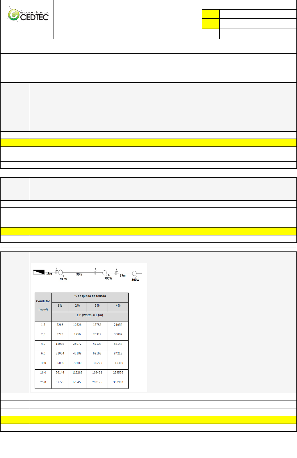 Pincel Atômico - 15/04/2024 12:22:16 1/2 MARCELA NASCIMENTO SOUTO Exercício Caminho do Conhecimento - Etapa 12 (24857) Atividade finalizada em 05/04/2024 13:44:30 (1821425 / 1) LEGENDA Resposta correta na questão # Resposta correta - Questão Anulada X Resposta selecionada pelo Aluno Disciplina: INSTALAÇÕES ELÉTRICAS PREDIAIS [1029161] - Avaliação com 4 questões, com o peso total de 4,33 pontos [capítulos - 116] Turma: Curso Técnico: Eletrotécnica - Grupo: EAD - 02/24 - EAD ELE [113127] Aluno(a): 91577545 - MARCELA NASCIMENTO SOUTO - Respondeu 4 questões corretas, obtendo um total de 4,33 pontos como nota [350082_1687 79] Questão 001 Com relação ao que estabelece a NBR 5410 — Instalações elétricas de baixa tensão —, sobre os critérios básicos para o dimensionamento mínimo do condutor neutro, marque V para verdadeiro e F para falso. Em seguida, assinale a alternativa com a sequência correta. ( ) O condutor neutro pode ser comum a mais de 1 (um) circuito. ( ) Em circuitos monofásicos, a seção do condutor neutro deve ser igual à do condutor fase. ( ) Quando a seção dos condutores fase de um circuito trifásico com neutro for superior a 25mm2, a seção do condutor neutro pode ser superior à seção dos condutores fase. ( ) A seção do condutor neutro em circuito com duas fases e neutro não deve ser inferior à dos condutores fases, podendo ser igual se a taxa de terceira harmônica e seus múltiplos for superior a 33%. F - F - V - V X F - V - F - V V - V - V - F V - F - F - F F - F - F - F [350081_1687 83] Questão 002 Sobre as conexões de condutores elétricos entre si e com outros componentes da instalação, é CORRETO afirmar que: A pressão de contato de uma conexão depende do material isolante. A solda a estanho pode ser utilizada na terminação dos condutores, para conectá-los a bornes ou terminais de dispositivos ou equipamentos elétricos. Em condutores de alumínio, não são permitidas as emendas por meio de conectores por compressão. X A conexão entre cobre e alumínio deve ser realizada exclusivamente por meio de conectores adequados a este fim. Emendas de cabos enterrados devem ser acessíveis para verificação, ensaio e manutenção. [350081_1687 78] Questão 003 Com base na tabela abaixo, de queda de tensão para uma carga ligada em 110V, determine a seção para o condutor do circuito 1 do diagrama unifilar para uma queda de tensão na carga de 2%. 4 mm2 10 mm2 6 mm2 X 16 mm2 25 mm2 Pincel Atômico - 15/04/2024 12:22:16 2/2 [350083_1687 80] Questão 004 A figura a seguir representa um esquema ilustrativo de um dos tipos de linhas elétricas utilizadas em baixa tensão. De acordo com a NBR 5410, a descrição deste esquema é a seguinte X Cabos unipolares ou cabo multipolar em eletroduto de seção não-circular ou eletrocalha em espaço de construção. Condutores isolados em eletroduto de seção não-circular ou eletrocalha em espaço de construção. Condutores isolados ou cabos unipolares em eletrocalha sobre parede em percurso horizontal ou vertical. Condutores isolados em eletroduto de seção circular embutido em alvenaria. Condutores isolados em eletroduto de seção não-circular embutido em alvenaria.