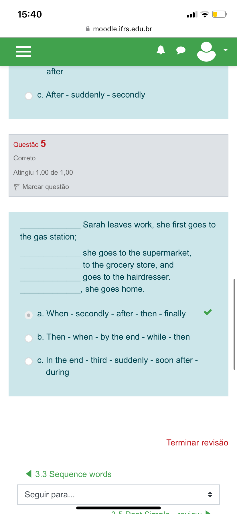 15:40 moodle.ifrs.edu.br after C. After - suddenly - secondly Questão 5 Correto Atingiu 1,00 de 1,00 Marcar questão Sarah leaves work, she first goes to the gas station; she goes to the supermarket, to the grocery store, and goes to the hairdresser. , she goes home. a. When - secondly - after - then - finally b. Then - when - by the end - while - then C. In the end - third - suddenly - soon after - during Terminar revisão 3.3 Sequence words Seguir para...