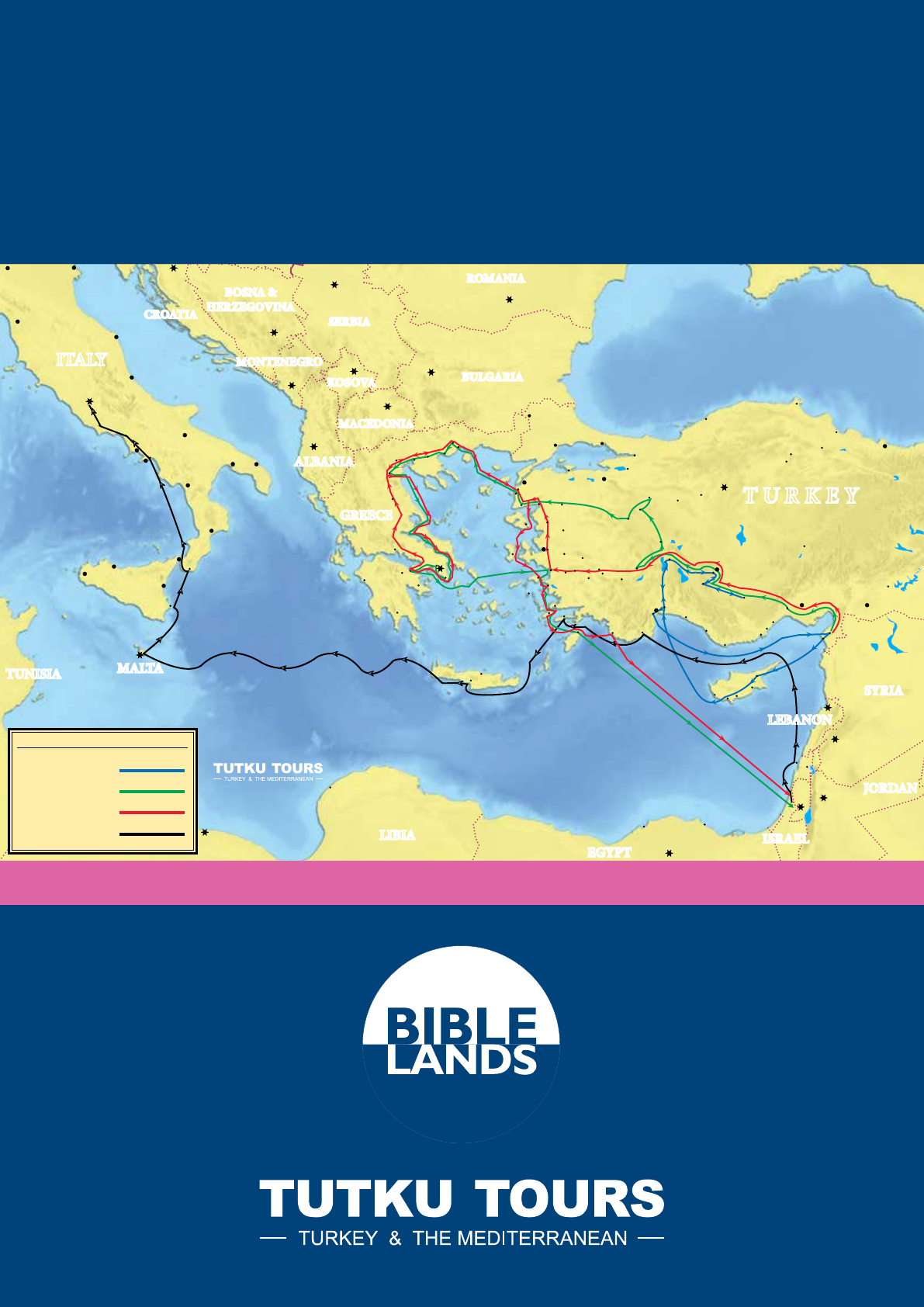 ISRAEL • JORDAN • LEBANON • EGYPT • TURKEY • GREECE • ITALY • SICILY • MALTA info@tutkutours.com • www.tutkutours.com E G Y P T • JO R D A N • C Y P R U S • M A L T A IS R A E L • T U R K E Y • G R E E C E • I T A L Y Tutku Tours MAPS of the BIBLICAL WORLD PAUL’S MISSIONARY JOURNEYS FIRST JOURNEY : SECOND JOURNEY: THIRD JOURNEY: FOURTH JOURNEY: T U R K E Y MACEDONIA MONTENEGRO BOSNA & HERZEGOVINA SICILY PONTUS GALATIA BITHYNIA GREECE ITALY CAPPADOCIA COMMOGENE MYSIA ASIA CRETE CILICIA SYRIA CARIA Salamis Kourion Amathous Kition Perge SideCos Smyrna Philadelphia Colossae Dorylaion Kyzikos Delphi Mycenae Epidaurus Olympia SpartaSiracuse Rhegium Puteoli Forum of Appius Three Taverns Malta Paphos LystraMiletus Mytilene Tralles Apamea Cotiaeum Pessinous Mazaka Prymnessus Sinope SAMSUN ORDU AMASYA SINOP Amisos Amaseia Amastris Gordion Hattusa Tavium Athens Antioch Arsameia Iconium Patmos Adramytteum Hadrianuthera Halicarnassus Nysa Antioch Pisidia Aizanoi Corinth Sounion Seleucia Pieria Attalia Mira Samos Pergamon Laodicea Byzantium Apollonia Neapolis ROME NAPLES VENICE MILAN PISA BRINDISI TARANTO PESCARA ANCONA FOGGIA SAPRI ISTANBULTEKIRDAG EDIRNE IZMIR ANTALYA PALERMO CATANIA TRAPANI MESSINA CATANZARO SORRENTO Tarsus Patara Korykos Soli Fair Haven Knosos Cnidus Alexandria Benghazi Port Said Nazareth Dead Sea Caesarea Sidon Ephesus Thyatira Aphrodisias Korakesion Anemurion Seleucia Nicomedia Beroea Pella Amphipolis Philippi Derbe Rhodes Chios Sardis Assos Troas Troy Hierapolis Nicaea Larissa Thessalonica CYPRUS LYCIA TUNISIA MALTA PHRYGIA LEBANON JORDAN ISRAEL EGYPT LIBIA BULGARIA ROMANIA ALBANIA SERBIA KOSOVA CROATIA ANKARA TIRANA SKOPJE PRISTINA BUCHAREST SAARAJEVO PODGORICA BELGRADE ZAGREB SOFIA Mediterranean Sea Black Sea Ionian Sea Marmara Sea Aegean Sea Adriatic Sea Tyrrhenian Sea ADANA GAZIANTEP KONYA DAMASCUS JERUSALEM TRIPOLI BEIRUT CAIRO AMMAN BURSA CANAKKALE PAUL’S MISSIONARY JOURNEYS Prepared by BIBLICAL PASSPORT Tutku Tours grants the bearer of this Passport the rights of knowledge, the privileges of pilgrimage, and the joy of discovery as you enter into the “World of the Bible.” We hope that you will take advantage of multiple entries and return again and again to deepen your understanding of these ancient and beautiful lands that have given birth to civilization and to sacred texts. May your journeys bring you enlightenment, wisdom, and peace. Gaziosmanpaşa Bulvarı 3/303 Izmir 35210 TURKEY Phone: +90-232 441-8635 / 441-8676 / 441-8677 Fax: +90-232 441-8636 E-mail: info@tutkutours.com • www.tutkutours.com DISCOVER THE BIBLE LANDS with TEAM LEVENT ORAL PRESIDENT ERIN DAILEY DIRECTOR OF OPERATIONS M e d i t e r r a n e a n S e a Golan Galilee Samaria Judea Negev Desert LEBANON GAZA S TR IP Dead Sea Sea of Galilee Gulf of Aqaba Netanya revi R nadroJ Amman Khorazin Magdala Ein Gedi Tiberias Caesarea Masada Capernaum Jerusalem Tel Aviv Kursi Betlehem Eliat Megiddo Qumran Nazareth Mt. Ebal Mt. Gerizim I S R A E L J O R D A N E G Y P T Medaba Machaerus Arnon Kerak Petra Dimona Mount Nebo Gerasa (Jerash) Ajlun Mount Hermon Belvoir Athlit Kadesh Herodium Kalat Nimrod Dan Arad Haifa Yarkon Beth Gubrin Appollonia Ein Karem Judyn Tyre Beer Sheva Rosh Hanikra Mukhraka Jacob’s Well Nablus Emmaus Acre Baram Hebron Caeserea Philippi Ashdod Beth Alpha Hamat Gader Beth Shean Antipatrus Bethel Ashkelon Archiv Safed Lachish Cana Ramla Aphek Bethel Shiloh Montfort Gamla Mar Saba Dor Modiin Pella Bethany Jerico Araba Border Crossing Allenby Bridge (King Hussein) Border Crossing Sheikh Hussein Border Crossing Nahariyya Hazor Gaza Nain Lod Yotvata Al’Aqabah N S EW 1. ARAD 2. BEERSHEBA 3. BEIT SHE’AN 4. BETHLEHEM 5. CAESAREA MARITIMA 6. CAESAREA PHILIPPI 7. CANA 8. CHORAZIN AND BETHSAIDA 9. DEAD SEA 10. JERICHO 11. JERUSALEM 12. MEGIDDO 13. MOUNT CARMEL 14. MOUNT OF OLIVES 15. MOUNT ZION 16. NAZARETH 17. POOL OF SILOAM 18. SEA OF GALILEE 19. ST. PETER IN GALLICANTU 20. TABOR 21. VIA DOLOROSA HOLY SEPULCHRE BIBLICAL SITES IN ISRAEL (21) ISRAEL MAP Herod’s Gate Dome of the Rock El Aqsa Mosque Via Dolorosa Via Dolorosa El Wad Road Hezekiah’s Tunnel Jaffa Gate Teddy Park New Gate Zion Gate Dung Gate Golden Gate Wadi el-Joz Damascus Gate Church of St. Stephen Islamic Museum Lions Gate JERICHO ROAD DERECH JERICHO SULTAN SULEIMAN H ahandasa R d. Salah el-Din Hanevi’im St. Nablus St. St . G eo rg e S t. Abu Bekr es-Sadia W ad i e l-J oz Ihvan es-Safa Sh iv te i Is ra ’e l S t. Ibn Tulun El M uq ad as i HATZANCHANIM SULTAN SULEIMAN Ben Yehuda St. King George V. Ki ng G eo rg e V . Hanevi’im St. Yafo St. Malchei Yisra’el St. Sam uel Hanavi St. Me’a She’arim St. Yafo St. Morasha Ha-Nevi’im St. Derech Aza (G aza) S t. Gershon Agron St. Ha at iv at Y er us ha la yi m S t. Ma’a leh H as ha lom Karen Hayesod St. Ze’ev Jabotinsky St. David Ham elech St. David Ham elech St. Jewish Agency Old Muslim CemeteryMamilla Pool Hanas St. Yitzhak Kariv St. President’s Residence National Academy of Sciences Van Leer Institute Gan Ha’atzma’ut Zichron Moshe OLD CITYCHRISTIAN QUARTER ARMENIAN QUARTER MUSLIM QUARTER Garden of Gethsamane Church of St. Peter Carmelite Monastery Mt. Olives Cemetery The Gihon Spring Church of the Flagellation Church of St. Anne Pool of Siloam Tower of David Domition Abbey King David’s Tomb Pillar of Absalom Zacharia Tomb Western Wall Tunnel Holy Sepulchre RASS EL-AMUDMOUNT ZION MOUNT OF OLIVES MOUNT SCOPUS Pater Noster Church Dominus Flevit Jesus’ Agony KIDRON VALLEY JEWISH QUARTER N S EW Chapel of the Ascensio Russian Cathedral Monastery of Notre Dame Prima Royale Hotel Leonardo Jerusalem Olive Tree Hotel Grand Court Hotel Ambassador Hotel The American Colony Hotel Jerusalem Hotel Mamilla Hotel David Citadel Hotel The King David Hotel Prima Kings Hotel Waldrof Astoria Hotel JERUSALEM MAP Diros Caverns ALBANIA BULGARIA GREECE TURKEY Izmir KırklareliEdirne Tekirdağ ALEXANDROUPOLIS KAVALA SERRES DRAMA XANTHI KOMOTINI THESSALON