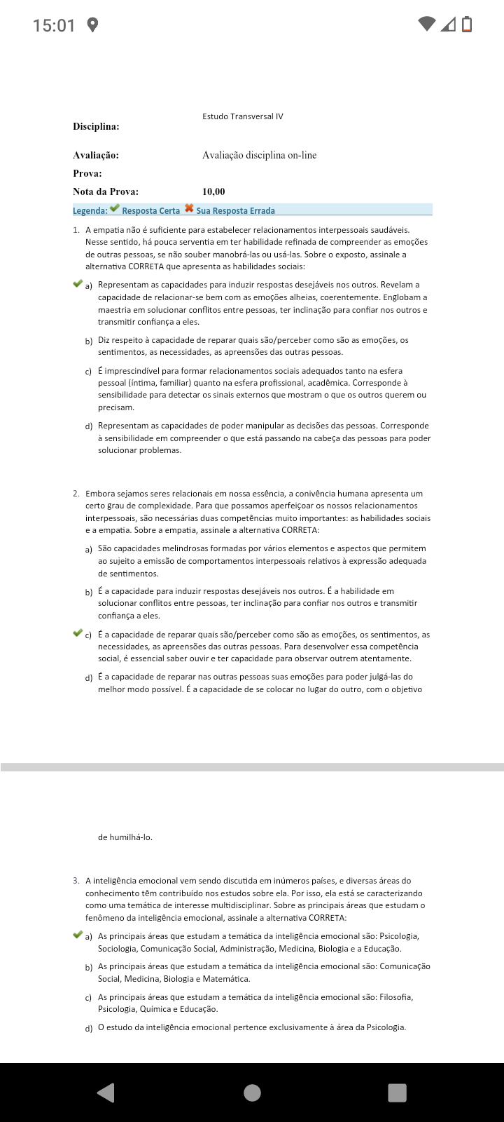 15:01 Estudo Transversal IV Disciplina: Avaliação: Avaliação disciplina on-line Prova: Nota da Prova: 10,00 Legenda: Resposta Certa Sua Resposta Errada A empatia não é suficiente para estabelecer relacionamentos interpessoais Nesse sentido, há pouca serventia em ter habilidade refinada de compreender as emoções de outras pessoas, se não souber manobrá-las ou Sobre o exposto, assinale a alternativa CORRETA que apresenta as habilidades sociais: a) Representam as capacidades para induzir respostas desejáveis nos outros. Revelam a capacidade de relacionar-se bem com as emoções alheias, Englobam a maestria em solucionar conflitos entre pessoas, ter inclinação para confiar nos outros e transmitir confiança a eles. b) Diz respeito à capacidade de reparar quais são/perceber como são as emoções, os sentimentos, as necessidades, as apreensões das outras pessoas. c) É imprescindível para formar relacionamentos sociais adequados tanto na esfera pessoal familiar) quanto na esfera profissional, Corresponde à sensibilidade para detectar os sinais externos que mostram o que os outros querem ou precisam. d) Representam as capacidades de poder manipular as decisões das pessoas. Corresponde à sensibilidade em compreender que está passando na cabeça das pessoas para poder solucionar 2. Embora sejamos seres relacionais em nossa essência, a conivência humana apresenta um certo grau de complexidade. Para que possamos aperfeiçoar os nossos relacionamentos interpessoais, são necessárias duas competências muito importantes: as habilidades sociais e a empatia. Sobre a empatia, assinale a alternativa CORRETA: a) São capacidades melindrosas formadas por vários elementos e aspectos que permitem ao sujeito a emissão de comportamentos interpessoais relativos à expressão adequada de b) É a capacidade para induzir respostas desejáveis nos É a habilidade em solucionar conflitos entre pessoas, ter inclinação para confiar nos outros e transmitir confiança eles. c) É a capacidade de reparar quais como são as emoções, os sentimentos, as necessidades, as apreensões das outras pessoas. Para desenvolver essa competência social, é essencial saber ouvir e ter capacidade para observar outrem d) É a capacidade de reparar nas outras pessoas suas emoções para poder julgá-las do melhor modo possível. E a capacidade de se colocar no lugar do outro, com objetivo de 3. A inteligência emocional vem sendo discutida em inúmeros países, e diversas do conhecimento têm contribuído nos estudos sobre ela. Por isso, ela está se caracterizando como uma temática de interesse multidisciplinar. Sobre as principais que estudam o fenômeno da inteligência emocional, assinale a alternativa CORRETA: a) As principais áreas que estudam a temática da inteligência emocional são: Psicologia, Sociologia, Comunicação Social, Administração, Medicina, Biologia e a Educação. b) As principais áreas que estudam a temática da inteligência emocional são: Comunicação Social, Medicina, Biologia e c) As principais áreas que estudam a temática da inteligência emocional são: Filosofia, Psicologia, Química e d) o estudo da inteligência emocional pertence exclusivamente à área da