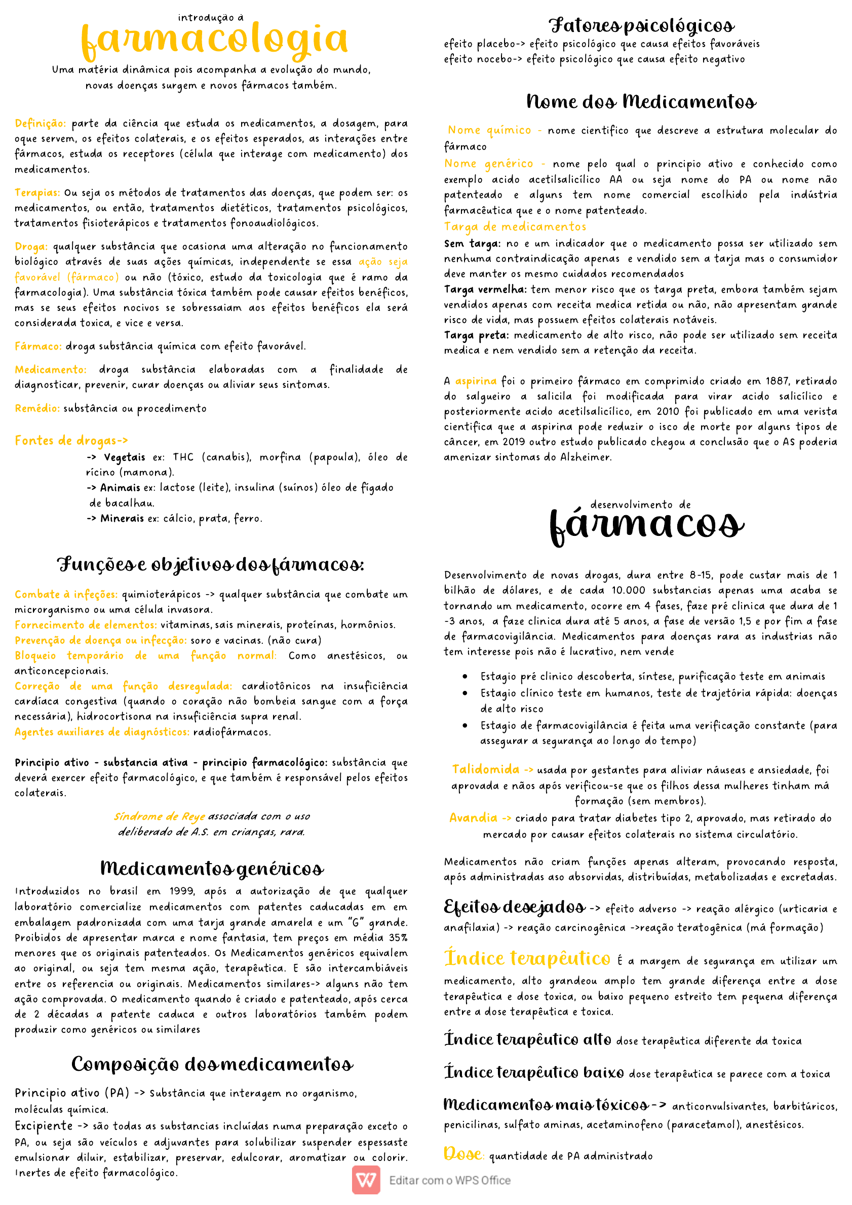 introdução à ������������ Uma matéria dinâmica pois acompanha a evolução do mundo, novas doenças surgem e novos fármacos também. Definição: parte da ciência que estuda os medicamentos, a dosagem, para oque servem, os efeitos colaterais, e os efeitos esperados, as interações entre fármacos, estuda os receptores (célula que interage com medicamento) dos medicamentos. Terapias: Ou seja os métodos de tratamentos das doenças, que podem ser: os medicamentos, ou então, tratamentos dietéticos, tratamentos psicológicos, tratamentos fisioterápicos e tratamentos fonoaudiológicos. Droga: qualquer substância que ocasiona uma alteração no funcionamento biológico através de suas ações químicas, independente se essa ação seja favorável (fármaco) ou não (tóxico, estudo da toxicologia que é ramo da farmacologia). Uma substância tóxica também pode causar efeitos benéficos, mas se seus efeitos nocivos se sobressaiam aos efeitos benéficos ela será considerada toxica, e vice e versa. Fármaco: droga substância química com efeito favorável. Medicamento: droga substância elaboradas com a finalidade de diagnosticar, prevenir, curar doenças ou aliviar seus sintomas. Remédio: substância ou procedimento Fontes de drogas-> -> Vegetais ex: THC (canabis), morfina (papoula), óleo de rícino (mamona). -> Animais ex: lactose (leite), insulina (suínos) óleo de fígado de bacalhau. -> Minerais ex: cálcio, prata, ferro. F������ � ������������ ��������: Combate à infeções: quimioterápicos -> qualquer substância que combate um microrganismo ou uma célula invasora. Fornecimento de elementos: vitaminas, sais minerais, proteínas, hormônios. Prevenção de doença ou infecção: soro e vacinas. (não cura) Bloqueio temporário de uma função normal: Como anestésicos, ou anticoncepcionais. Correção de uma função desregulada: cardiotônicos na insuficiência cardíaca congestiva (quando o coração não bombeia sangue com a força necessária), hidrocortisona na insuficiência supra renal. Agentes auxiliares de diagnósticos: radiofármacos. Principio ativo - substancia ativa - principio farmacológico: substância que deverá exercer efeito farmacológico, e que também é responsável pelos efeitos colaterais. Síndrome de Reye associada com o uso deliberado de A.S. em crianças, rara. M����������� ��������� Introduzidos no brasil em 1999, após a autorização de que qualquer laboratório comercialize medicamentos com patentes caducadas em em embalagem padronizada com uma tarja grande amarela e um “G” grande. Proibidos de apresentar marca e nome fantasia, tem preços em média 35% menores que os originais patenteados. Os Medicamentos genéricos equivalem ao original, ou seja tem mesma ação, terapêutica. E são intercambiáveis entre os referencia ou originais. Medicamentos similares-> alguns não tem ação comprovada. O medicamento quando é criado e patenteado, após cerca de 2 décadas a patente caduca e outros laboratórios também podem produzir como genéricos ou similares C��������� ��������������� Principio ativo (PA) -> Substância que interagem no organismo, moléculas química. Excipiente -> são todas as substancias incluídas numa preparação exceto o PA, ou seja são veículos e adjuvantes para solubilizar suspender espessaste emulsionar diluir, estabilizar, preservar, edulcorar, aromatizar ou colorir. Inertes de efeito farmacológico. F������������������ efeito placebo-> efeito psicológico que causa efeitos favoráveis efeito nocebo-> efeito psicológico que causa efeito negativo N��� ��� M����������� Nome químico - nome cientifico que descreve a estrutura molecular do fármaco Nome genérico - nome pelo qual o principio ativo e conhecido como exemplo acido acetilsalicílico AA ou seja nome do PA ou nome não patenteado e alguns tem nome comercial escolhido pela indústria farmacêutica que e o nome patenteado. Targa de medicamentos Sem targa: no e um indicador que o medicamento possa ser utilizado sem nenhuma contraindicação apenas e vendido sem a tarja mas o consumidor deve manter os mesmo cuidados recomendados Targa vermelha: tem menor risco que os targa preta, embora também sejam vendidos apenas com receita medica retida ou não, não apresentam grande risco de vida, mas possuem efeitos colaterais notáveis. Targa preta: medicamento de alto risco, não pode ser utilizado sem receita medica e nem vendido sem a retenção da receita. A aspirina foi o primeiro fármaco em comprimido criado em 1887, retirado do salgueiro a salicila foi modificada para virar acido salicílico e posteriormente acido acetilsalicílico, em 2010 foi publicado em uma verista cientifica que a aspirina pode reduzir o isco de morte por alguns tipos de câncer, em 2019 outro estudo publicado chegou a conclusão que o AS poderia amenizar sintomas do Alzheimer. desenvolvimento de �������� Desenvolvimento de novas drogas, dura entre 8-15, pode custar mais de 1 bilhão de dólares, e de cada 10.000 substancias apenas uma acaba se tornando um medicamento, ocorre em 4 fases, faze pré clinica que dura de 1 -3 anos, a faze clinica dura até 5 anos, a fase de versão 1,5 e por fim a fase de farmacovigilância. Medicamentos para doenças rara as industrias não tem interesse pois não é lucrativo, nem vende Estagio pré clinico descoberta, síntese, purificação teste em animais Estagio clínico teste em humanos, teste de trajetória rápida: doenças de alto risco Estagio de farmacovigilância é feita uma verificação constante (para assegurar a segurança ao longo do tempo) Talidomida -> usada por gestantes para aliviar náuseas e ansiedade, foi aprovada e nãos após verificou-se que os filhos dessa mulheres tinha