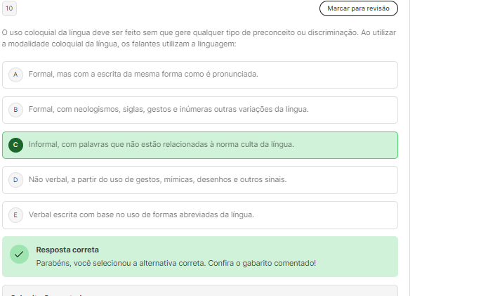 10 Marcar para revisão coloquial da deve ser feito sem que gere qualquer tipo de preconceito ou discriminação. Ao utilizar a modalidade coloquial da lingua, os falantes utilizam a linguagem: A mas com a escrita da mesma forma como é pronunciada. B com neologismos, siglas, gestos e inúmeras outras variações da c Informal, com palavras que não estão relacionadas à norma culta da lingua. D Não verbal, a partir do uso de gestos, desenhos e outros E Verbal escrita com base no uso de formas abreviadas da lingua. Resposta correta você selecionou a alternativa correta. Confira gabarito comentado!