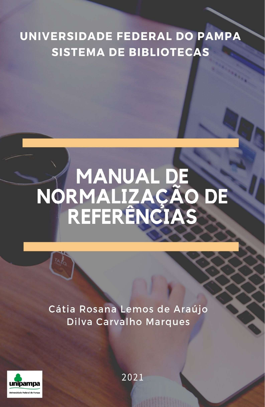 SISTEMA DE BIBLIOTECAS DA UNIVERSIDADE FEDERAL DO PAMPA – UNIPAMPA MANUAL DE NORMALIZAÇÃO DE REFERÊNCIAS Cátia Rosana Lemos de Araújo Dilva Carvalho Marques Bagé 2021 Reitor Roberlaine Ribeiro Jorje Vice-Reitor Marcos Vinicius Morini Querol Pró-Reitor de Graduação Pedro Daniel da Cunha Kemerich Pró-Reitora de Extensão e Cultura Paulo Rodinei Soares Lopes Pró-Reitor de Pesquisa, Pós-Graduação e Inovação Fábio Gallas Leivas Pró-Reitora de Planejamento e Infraestrutura Viviane Kanitz Gentil Chefia do Sistema de Bibliotecas Cátia Rosana Lemos de Araújo A663 Araújo, Cátia Rosana L. de Manual de normalização de referências / Cátia Rosana Lemos de Araújo, Dilva Carvalho Marques. – Bagé: Universidade Federal do Pampa, 2021. 64 p. : il. 1. Metodologia científica. 2. Normalização – Manuais, guias. 3. Referências. I. Marques, Dilva Carvalho. II. Universidade Federal do Pampa. Sistema de Bibliotecas. III. Título. CDU: 001.89(035) SUMÁRIO 1 INTRODUÇÃO ........................................................................................................ 7 2 NORMALIZAÇÃO DE REFERÊNCIAS .............................................................. 8 2.1 Elementos de referências.......................................................................................... 8 2.1.1 Elementos essencias .................................................................................................. 8 2.1.2 Elementos complementares ..................................................................................... 8 2.2 Localização ................................................................................................................ 9 2.3 Regras de apresentação ............................................................................................ 9 3 ORDENAÇÃO DAS REFERÊNCIAS ................................................................. 10 3.1 Sistema alfabético ................................................................................................... 10 3.2 Sistema numérico .................................................................................................... 10 4 TRANSCRIÇÃO DOS ELEMENTOS ................................................................. 12 4.1 Autoria ..................................................................................................................... 12 4.1.1 Pessoa física ............................................................................................................. 12 4.1.1.1 Obras de um só autor ............................................................................................. 12 4.1.1.2 Obras com até três autores .................................................................................... 12 4.1.1.3 Obras de quatro ou mais autores .......................................................................... 13 4.1.1.4 Coletâneas ............................................................................................................... 13 4.1.1.5 Pseudônimo ............................................................................................................. 13 4.1.1.6 Outros tipos de responsabilidade .......................................................................... 14 4.1.1.7 Obras psicografadas ............................................................................................... 14 4.1.1.8 Obras adaptadas ..................................................................................................... 14 4.1.1.9 Entrevistas ............................................................................................................... 14 4.1.1.10 Nomes hispânicos, compostos, grau de parentesco e com prefixos .................... 15 4.1.2 Pessoa jurídica ........................................................................................................ 15 4.1.2.1 Obras com mais de uma pessoa jurídica .............................................................. 16 4.1.2.2 Instituição governamental ..................................................................................... 16 4.1.2.3 Estados e municípios .............................................................................................. 16 4.1.2.4 Entidade com denominação específica ................................................................. 17 4.1.3 Eventos ..................................................................................................................... 17 4.1.3.1 Eventos com mais de um autor .............................................................................. 18 4.1.4 Autoria desconhecida ............................................................................................. 18 4.2 Título e subtítulo ..................................................................................................... 18 4.2.1 Títulos longos .......................................................................................................... 18 4.2.2 Entrada pelo título .................................................................................................. 19 4.2.3 Título em mais de um idioma ................................................................................ 19 4.2.4 Título de periódicos ................................................................................................ 19 4.2.5 Abreviatura de título de periódicos ...................................................................... 20 4.2.6 Publicações periódicas com título genérico .......................................................... 20 4.2.7 Documentos sem título ........................................................................................... 20 4.3 Edição ...................................................................................................................... 20 4.3.1 Acréscimos à edição .........................................................