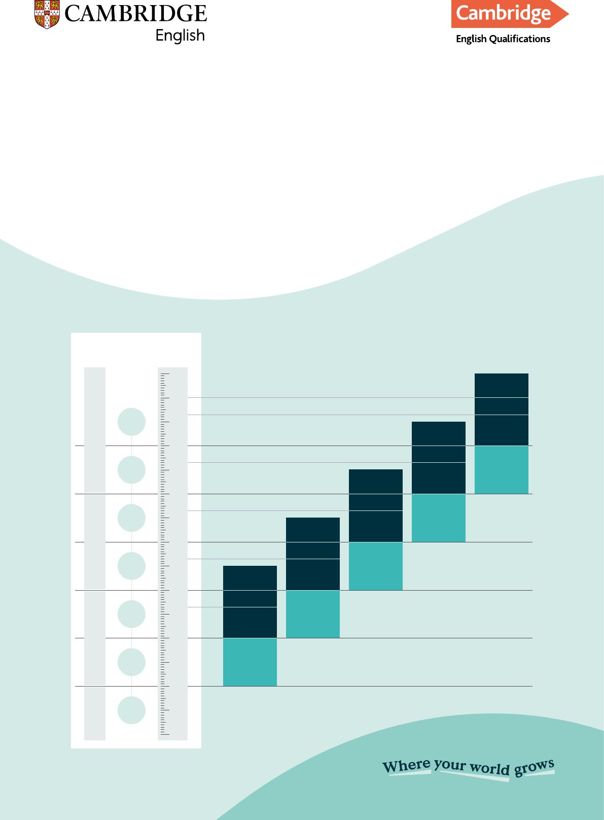 Common European Framework of Reference (CEFR) Cambridge English Scale A2 Key for Schools/ A2 Key B1 Preliminary for Schools/ B1 Preliminary B2 First for Schools/ B2 First C1 Advanced C2 Pro ciency Ba si c In de pe nd en t Pr o ci en t C2 C1 B2 B1 A2 A1 A1 Pre 230 220 210 200 190 180 170 160 150 140 130 120 110 100 90 80 Level C1 Grade B Grade C Grade A Level B2 Grade C Grade B Grade A Level B1 Grade C Grade B Grade A Level A2 Grade C Grade B Grade A Level A1 Grade C Grade B Grade A The Cambridge English Scale explained A guide to converting practice test scores to Cambridge English Scale scores All Cambridge English Qualifications from A2 Key for Schools/A2 Key to C2 Proficiency report results on the Cambridge English Scale. For B2 First, B2 First for Schools, C1 Advanced and C2 Proficiency, candidates receive an individual score for each of the four skills – reading, writing, listening, speaking – and Use of English. In the live exams, each of the skills and Use of English are equally weighted, and a candidate’s overall score is calculated by adding all of the individual scores together and dividing by five (and then rounding to the nearest whole number). For A2 Key, A2 Key for Schools, B1 Preliminary and B1 Preliminary for Schools, candidates receive an individual score for the four skills – reading, writing, listening and speaking. In the live exams, each skill is equally weighted, and a candidate’s overall score is calculated by adding all of the individual scores together and dividing by four (and then rounding to the nearest whole number). A candidate’s grade and Common European Framework of Reference (CEFR) level are based on their performance across the whole qualification, and there is no requirement to achieve a minimum score in each paper. The following tables can be used as guidance to help you convert practice test scores to Cambridge English Scale scores. Please note that these only apply when using official Cambridge English practice tests. The conversion tables are intended to help you provide an indication of your students’ readiness to take the relevant qualification. The scores you provide may not always reflect the results the students may achieve in a Cambridge English live exam. They should not be used to try to predict precise scores in the live exam, but can be a useful diagnostic tool, indicating areas of relative strength and weakness. The scores needed on any given exam to achieve the scores on the Cambridge English Scale shown in the tables below will vary due to a number of factors, so scores close to CEFR boundaries need to be reviewed carefully. We recommend that this is approximately three Cambridge English Scale score points above and below the score needed to achieve the level, e.g. 157–163 for Level B2. Students who achieve only slightly higher than the Cambridge English Scale score for a given level on a practice test may not achieve that level in the live exam, and we recommend that they continue working to improve so that they reach the desired level. A2 Key and A2 Key for Schools Reading The Reading section consists of Parts 1–5 of the Reading and Writing paper. Correct answers in Parts 1–5 are worth 1 mark each. There are 30 possible marks in the Reading section. Writing The Writing section consists of Parts 6 and 7 of the Reading and Writing paper. Candidates’ answers in the Writing paper are marked using assessment scales which are linked to the CEFR. 0–5 marks are given for each of the following criteria: Content; Organisation; and Language. There are a possible 15 marks for Part 6 and 15 possible marks for Part 7. Whole marks only are awarded; there are no half marks given. Marks for each of the criteria are combined to give 15 possible marks for each part. In total, there are 30 possible marks in the Writing paper. Listening Correct answers in the Listening paper are worth 1 mark each. There are 25 possible marks in the Listening paper. Speaking Candidates take the test in pairs, or occasionally in groups of three, but are assessed on their individual performance by trained examiners certificated to examine at the level. Candidate speaking performances are assessed using scales which are linked to the CEFR. The assessor gives 0–5 marks for each of the following criteria: Grammar and Vocabulary; Pronunciation; and Interactive Communication. Marks for each of these criteria are doubled. The interlocutor gives a mark of 0–5 for Global Achievement. This mark is then multiplied by three. Examiners may award half marks. Marks for all criteria are then combined, meaning there are 45 marks available in the Speaking test. Practice test score Cambridge English Scale score CEFR level 28 140 B1 20 120 A2 13 100 A1 7 82* – *minimum score reported for A2 Key Practice test score Cambridge English Scale score CEFR level 26 140 B1 18 120 A2 12 100 A1 8 82* – *minimum score reported for A2 Key Practice test score Cambridge English Scale score CEFR level 23 140 B1 17 120 A2 11 100 A1 6 82* – *minimum score reported for A2 Key Practice test score Cambridge English Scale score CEFR level 41 140 B1 27 120 A2 18 100 A1 10 82* – *minimum score reported for A2 Key B1 Preliminary and B1 Preliminary for Schools Reading The Reading paper consists of six parts. Correct answers in Parts 1–6 are worth 1 mark each. There are 32 possible marks in the Reading paper. Writing The Writing paper consists of two parts. Candidates’ answers in the Writing paper are marked using assessment scales which are linked to the CEFR. 0–5 marks are given for each of the following criteria: Content; Communicative Achievement; Organisation; and Language. Whole marks only are awarded; there are no half marks given. Part 1 is worth 20 marks and Part 2 is worth 20 marks. There are 40 possible marks in the Writing paper. Listening Correct answers in the Listening paper are worth 1 mark each. There are 25 possible marks in the Listening paper. Speaking Candid