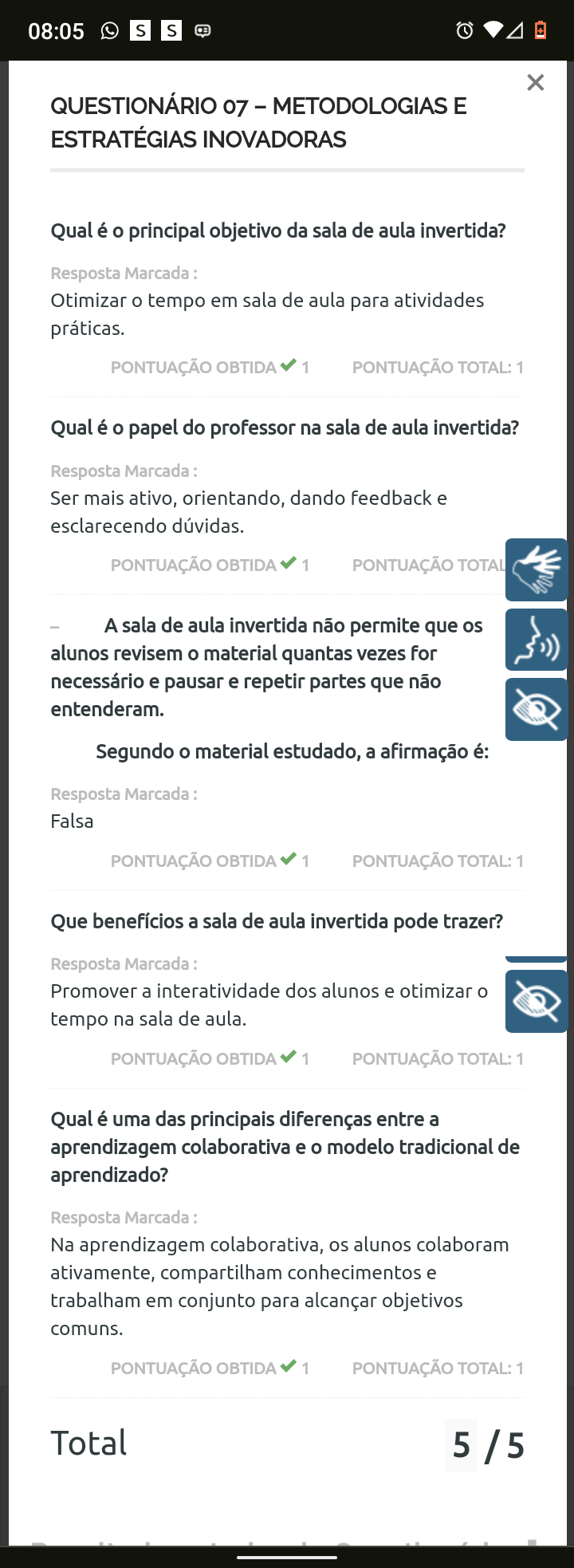 08:05 S S QUESTIONÁRIO 07 - METODOLOGIAS E ESTRATÉGIAS INOVADORAS Qual é o principal objetivo da sala de aula invertida? Resposta Marcada : Otimizar o tempo em sala de aula para atividades práticas. PONTUAÇÃO OBTIDA 1 PONTUAÇÃO TOTAL: 1 Qual é o papel do professor na sala de aula invertida? Resposta Marcada : Ser mais ativo, orientando, dando feedback e esclarecendo dúvidas. PONTUAÇÃO OBTIDA 1 PONTUAÇÃO TOTAL A sala de aula invertida não permite que os alunos revisem o material quantas vezes for necessário e pausar e repetir partes que não entenderam. Segundo o material estudado, a afirmação é: Resposta Marcada : Falsa PONTUAÇÃO OBTIDA 1 PONTUAÇÃO TOTAL: 1 Que benefícios a sala de aula invertida pode trazer? Resposta Marcada : Promover a interatividade dos alunos e otimizar o tempo na sala de aula. PONTUAÇÃO OBTIDA 1 PONTUAÇÃO TOTAL: 1 Qual é uma das principais diferenças entre a aprendizagem colaborativa e o modelo tradicional de aprendizado? Resposta Marcada : Na aprendizagem colaborativa, os alunos colaboram ativamente, compartilham conhecimentos e trabalham em conjunto para alcançar objetivos comuns. PONTUAÇÃO OBTIDA 1 PONTUAÇÃO TOTAL: 1 Total 5 /5