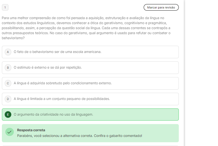 1 Marcar para revisão Para uma melhor compreensão de como foi pensada a aquisição, estruturação e avaliação da no contexto dos estudos linguísticos, devemos conhecer a do gerativismo, cognitivismo e possibilitando, assim, a percepção da questão social da lingua. Cada uma dessas correntes se contrapôs a outros pressupostos No caso do gerativismo, qual argumento é usado para refutar ou combater behaviorismo? A fato de behaviorismo ser de uma escola americana B estímulo é externo e se dá por repetição. A lingua é adquirida sobretudo pelo condicionamento externo. D A lingua é limitada a um conjunto pequeno de E argumento da criatividade no uso da linguagem. Resposta correta você selecionou a alternativa correta. Confira gabarito comentado!