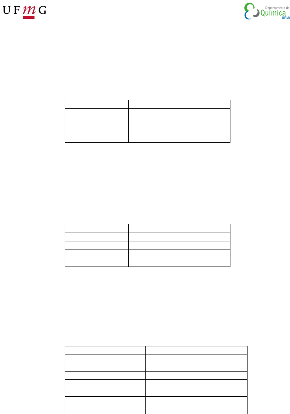 UNIVERSIDADE FEDERAL DE MINAS GERAIS – UFMG INSTITUTO DE CIÊNCIAS EXATAS – ICEx Departamento de Química 4ª Lista de Exercícios – Química Geral (QUI616) Questão 01. Considere o composto hipotético CaF(s). a) Calcule a sua energia de rede. Suponha a estrutura do NaCl e uma distância internuclear de 2,67 × 10 -10 m. b) Faça o ciclo de Born-Haber para o CaF indicando todas as etapas. c) Calcule a entalpia padrão de formação para o CaF utilizando a resposta do item (a) e os dados termoquímicos contidos no quadro abaixo. Comente sobre o valor obtido. Espécie Química Dado Experimental (kJ mol -1 ) Ca(g) H 0 f = + 177,8 Ca + (g) 1 a EI = + 589,8 F(g) H 0 f = + 79,4 F ‒ (g) AE = 328,1 Questão 02. Considere o composto hipotético Ca + O(s). a) Calcule a sua energia de rede. Suponha a estrutura do NaCl e uma distância internuclear de 2,40 × 10 -10 m. b) Faça o ciclo de Born-Haber para o Ca + O indicando todas as etapas. c) Calcule a entalpia padrão de formação para o Ca + O - , utilizando a resposta do item (a) e os dados termoquímicos contidos no quadro abaixo. Compare o H o f calculado com o valor experimental de 634,9 kJ mol -1 . Parece razoável o valor obtido para a formulação Ca + O? Espécie Química Dado Experimental (kJ mol -1 ) Ca(g) H 0 f = + 177,8 Ca + (g) 1 a EI = + 589,8 O(g) H 0 f = + 249,2 O ‒ (g) AE = 141,0 Questão 03. Coloque os compostos seguintes em ordem crescente de energia de rede: RaI2, CsI, LiF e AgI. Justifique a sua resposta. Questão 04. Considerando os seguintes compostos iônicos: MgF2 e BaF2, indique qual deles apresenta maior energia de rede. Explique por que a temperatura de fusão do BaF2 é maior do que a do MgF2. Questão 05. Construa o Ciclo de Born-Haber para o sólido iônico AlI3, indicando todas as etapas. A partir dos dados contidos no quadro abaixo, determine o valor da energia de rede para esse composto. Espécie Química Dado Experimental (kJ mol -1 ) Al(g) H 0 f = + 330,0 Al + (g) 1 a EI = + 577,5 Al 2+ (g) 2 a EI = + 1817 Al 3+ (g) 3 a EI = + 2745 I(g) H 0 f = + 106,8 I - (g) AE = 295,0 AlI3(s) H 0 f = 313,8 Questão 06. Explique o que é a polarizabilidade. Dê exemplos de dois compostos iônicos que apresentem diferenças quanto ao caráter covalente da ligação. Questão 07. Considere o composto hipotético CsF2(s), em que estaria presente o íon Cs 2+ . a) Calcule a sua energia de rede. Suponha a estrutura da fluorita e uma distância internuclear de 2,78 × 10 -10 m. b) Considerando o valor obtido para a energia de rede do CsF2, é possível explicar porque esse composto não existe? Justifique. c) Calcule, por meio do ciclo de Born-Haber, a entalpia padrão de formação para o CsF2. Para isso considere os dados apresentados no quadro abaixo. d) A julgar pelo valor de H 0 f (CsF2,s) obtido, esse composto seria estável? Justifique. Espécie Química Dado Experimental (kJ mol -1 ) Cs(g) H 0 f = + 76,50 Cs + (g) 1 a EI = + 375,7 Cs 2+ (g) 2 a EI = + 2234 F(g) H 0 f = + 79,40 F ‒ (g) AE = 328,1 Questão 08. A figura abaixo mostra parte do ciclo de Born-Haber para a formação do NaCl(s) a partir de seus constituintes. Sabendo que a seta menor indica um consumo de 496 kJ mol -1 de energia e, a seta maior, a liberação de 787 kJ mol -1 de energia, responda: a) A que processo corresponde os valores de energia indicados pelas setas no ciclo? Escreva a equação química correspondente a essas duas transformações, indicando os estados físicos de reagentes e produtos. b) Calcule a entalpia padrão de formação para o NaCl, utilizando os dados termoquímicos apresentados no quadro abaixo. c) Os sólidos iônicos NaCl e KCl formam o mesmo tipo de estrutura cristalina, logo eles tem o mesmo valor para a constante de Madelung. Em qual composto as interações entre os íons são mais fortes? Justifique. Espécie Química Dado Experimental (kJ mol -1 ) Na(g) H 0 f = + 107,5 Cl(g) H 0 f = + 121,3 Cl ‒ (g) AE = 348,6 Questão 09. O óxido de magnésio, MgO, é um sólido branco usado, dentre outras coisas, como isolante em cabos industriais, como material básico para cadinhos refratários e como ingrediente principal para materiais de construção. a) Faça o ciclo de Born-Haber para o MgO indicando todas as etapas. b) Utilizando o ciclo de Born-Haber calcule a energia de rede para o MgO. Considere os dados apresentados no quadro abaixo. c) Explique porque o MgO consiste de íons Mg 2+ e O 2 ao invés de íons Mg + e O. Não é necessário realizar cálculos. Espécie Química Dado Experimental (kJ mol -1 ) Mg(g) H 0 f = + 147,1 Mg + (g) 1 a EI = + 737,7 Mg 2+ (g) 2 a EI = + 1451 O(g) H 0 f = + 249,2 O ‒ (g) 1 a AE = 141,0 O 2‒ (g) 2 a AE = + 844,0 MgO(s) H 0 f = ‒ 601,6 Questão 10. Construa o Ciclo de Born-Haber para o sólido iônico MgBr2, indicando todas as etapas. A partir dos dados contidos no quadro abaixo, determine o valor da energia de rede para esse composto. Nas condições padrão o bromo (Br2) é líquido e o magnésio (Mg) é sólido. Espécie Química Dado Experimental (kJ mol -1 ) Mg(g) H 0 f = + 147,1 Mg + (g) 1 a EI = + 737,7 Mg 2+ (g) 2 a EI = + 1451 Br(g) H 0 f = + 111,9 Br ‒ (g) AE = 324,5 MgBr2(s) H 0 f = 524,3 Questão 11. Represente através de um número adequado de formas de ressonância o íon SO4 2- e diga qual é a ordem da ligação enxofre-oxigênio. Questão 12. A acroleína, usada na fabricação de plásticos, pode ser obtida por meio da reação entre etileno e monóxido de carbono, conforme representado na equação abaixo: C C H H H H C O C C C O H HH H + a) Indique qual é a ligação carbono-carbono mais forte na molécula de acroleína. Justifique. b) Indique qual é a ligação carbono-carbono mais longa na molécula de acroleína. Justifique. c) As moléculas de etileno e acroleína são apolares? Justifique. Questão 13. O comprimento médio da ligação simples carbono-oxigênio é de 143 pm. No íon carbonato, CO3 2‒, a separação entre esses átomos é de 1