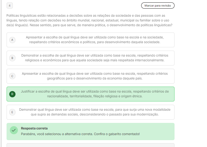 4 Marcar para revisão Políticas linguísticas estão relacionadas a decisões sobre as relações da sociedade e das pessoas com as tendo relação com decisões no âmbito mundial, nacional, estadual, municipal ou familiar sobre uso da(s) Nesse sentido, para que serve, de maneira prática, desenvolvimento de Apresentar a escolha de qual língua deve ser utilizada como base na escola e na sociedade, A respeitando critérios econômicos e políticos, para desenvolvimento daquela Demonstrar a escolha de qual língua deve ser utilizada como base na escola, respeitando critérios B religiosos e econômicos para que aquela sociedade seja mais respeitada Apresentar a escolha de qual deve ser utilizada como base na escola, respeitando critérios para desenvolvimento da economia daquele país. Justificar a escolha de qual deve ser utilizada como base na escola, respeitando critérios de D nacionalidade, territorialidade, filiação religiosa e origem Demonstrar qual língua deve ser utilizada como base na escola, para que surja uma nova modalidade E que supra as demandas sociais, desconsiderando passado para sua modernização. Resposta correta Parabéns, você selecionou a alternativa correta. Confira gabarito comentado!