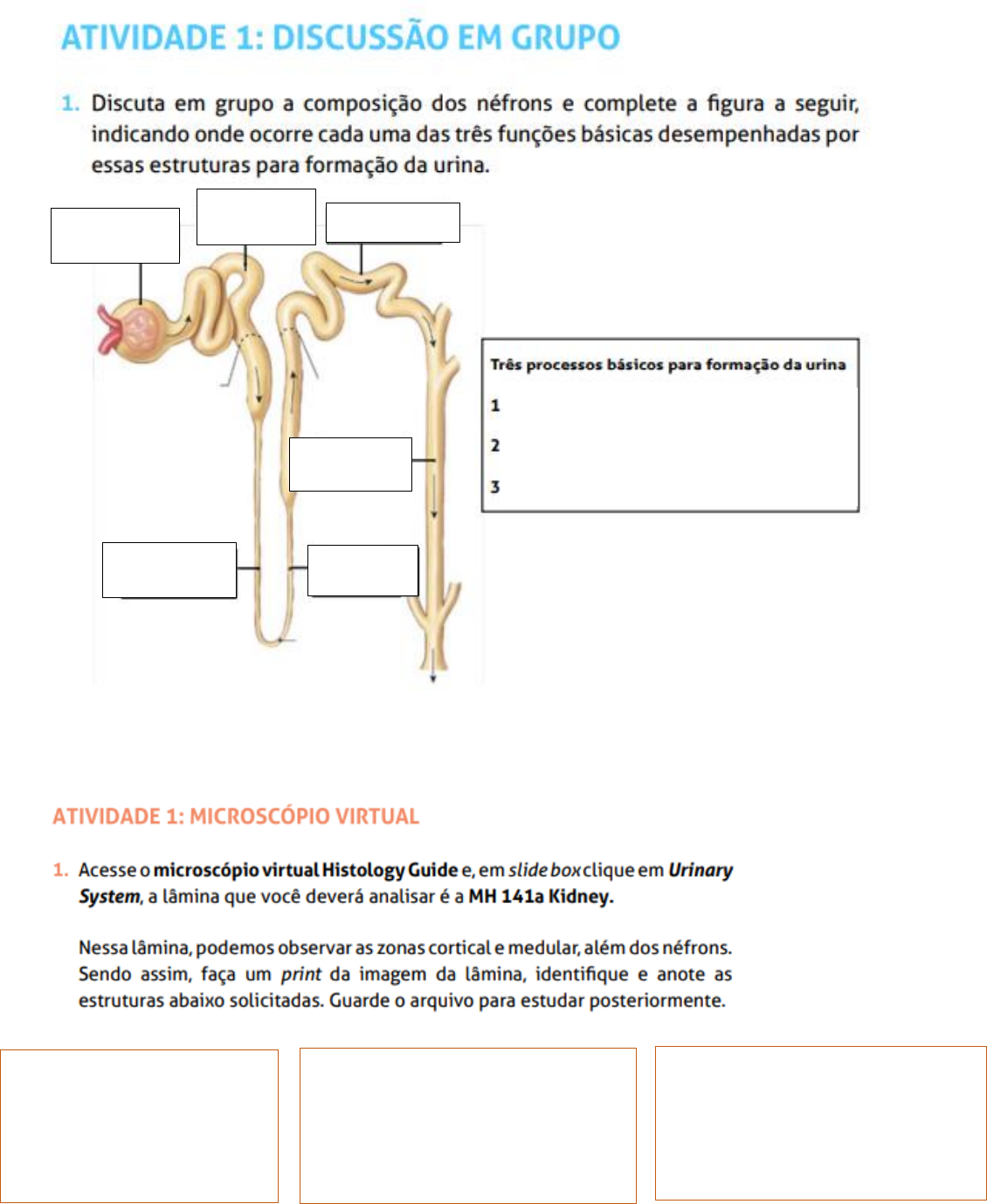 Roteiro 1.5 Abertura de sessão Aspectos histológicos dos rins 1- Capsula de Bowman 2- Túbulo proximal 5- Túbulo distal 3- Ramo descendente 6- Ducto coletor 4- Ramo ascendente Filtração Reabsorção Secreção • Folheto parietal da capsula de Bowman • Podócitos (folheto visceral da capsula de Bowman) • Túbulo contorcido proximal • Ramo delgado da alça de Henle • Túbulo contorcido distal • Túbulo e ducto coletor • Aparelho justaglomerular • Zona medular • Zona cortical • Corpúsculo renal • Espaço capsular • Capilar glomerular Roteiro 1.5 O folheto parietal da cápsula de Bowman é constituído de um epitélio simples pavimentoso, que se apoia sobre uma lâmina basal envolvida externamente por uma fina camada de fibras reticulares, e ambos constituem uma membrana basal bem visível ao microscópio de luz. O epitélio, a lâmina basal e as fibras formam a parede do corpúsculo. As células do folheto visceral adquirem características muito peculiares durante o desenvolvimento embrionário. Chamadas de podócitos, colocam-se sobre os capilares glomerulares. Os podócitos são formados por um corpo celular de onde partem diversos prolongamentos primários que dão origem a prolongamentos secundários. Os prolongamentos abraçam os capilares, colocando-se sobre a lâmina basal dos capilares e aderindo a ela por meio de várias proteínas, entre as quais se destacam as integrinas A microscopia eletrônica revelou que entre os prolongamentos secundários dos podócitos há delgados espaços denominados fendas de filtração. As fendas são obstruídas por uma membrana muito delgada que faz parte da barreira de filtração. A membrana é constituída de um conjunto de proteínas (p. ex., a nefrina) e tem cerca de 6 nm de espessura. As proteínas da membrana atravessam a membrana plasmática dos podócitos e se ligam a filamentos de actina do citoplasma. Os rins recebem sangue por intermédio das artérias renais, ramos diretos da aorta abdominal. As artérias renais dividem-se, penetram no órgão pelo seu hilo e se ramificam nas artérias interlobares, com trajeto entre as pirâmides renais em direção à cápsula. Na altura da junção corticomedular (nas bases das pirâmides), as artérias interlobares originam as artérias arciformes, em forma de arcos, no trajeto entre medula e córtex. As arciformes dão origem às artérias interlobulares, perpendiculares à cápsula do rim, com trajeto entre os raios medulares (lembrando que os raios medulares e o parênquima cortical adjacente formam os lóbulos do rim) Em seu trajeto em direção à capsula, as artérias interlobulares originam as arteríolas aferentes dos glomérulos que se ramificam nas alças dos capilares glomerulares, as quais se reúnem nas arteríolas eferentes. Trata-se de uma situação pouco comum no corpo: uma arteríola se capilariza e os capilares se reúnem em uma arteríola em vez de se reunir em uma vênula. Roteiro 1.5 As arteríolas eferentes originam capilares. Nos néfrons intermediários e superficiais (situados próximo à cápsula), esses capilares formam as redes de capilares peritubulares, dispostas em torno dos túbulos, responsáveis pela nutrição e pela oxigenação das células da cortical. Em outro tipo de arranjo, as arteríolas eferentes dos glomérulos de néfrons justamedulares – situados próximo da medula – originam vasos longos e retilíneos – os vasos retos –, que se dirigem para a medula ao longo das alças de Henle. Na extremidade dessas, formam alças que retornam para a cortical sob a forma de delgadas vênulas. O endotélio do ramo descendente dessas alças é do tipo contínuo, porém as células endoteliais do ramo ascendente são fenestradas. O sangue dos vasos retos fornece nutrientes e oxigênio à medular do rim. Esses vasos participam do importante sistema contracorrente multiplicador do rim. Roteiro 1.5 Anatomia do rim Os rins são órgãos de cor vermelho escuro, em forma de feijão. Em humanos adultos, cada rim tem 10-15 cm de comprimento, cerca de 6 cm de largura e pesa cerca de 150 g. Juntos, os rins representam cerca de 0,5% do peso corporal, mas recebem cerca de 20% do débito cardíaco em repouso. As pessoas podem nascer com uma condição chamada rim em ferradura (também chamada de fusão renal ou super rim). Isso significa que os rins se fundiram durante o desenvolvimento. Pessoas com essa condição podem não ter sintomas e talvez nunca percebam que a possuem. No entanto, elas têm maior risco de alguns distúrbios renais, como infecção ou obstrução, e cálculos renais. Agenesia renal é uma condição em que um ou ambos os rins não conseguem se desenvolver no feto. A agenesia renal bilateral (de ambos os lados) é fatal, enquanto pessoas com agenesia unilateral (apenas de um lado) geralmente são saudáveis. Posição dos rins Os rins estão localizados na parte posterior da cavidade abdominal, atrás do peritônio, de cada lado da coluna. Eles ficam logo abaixo do diafragma, com o rim direito localizado atrás do fígado e o rim esquerdo, atrás do baço [+]. Acima de cada rim há uma glândula adrenal. Roteiro 1.5 Vista coronal posterior do abdômen Porque o rim transplantado foi colocado na parte inferior do abdômen? As razões pelas quais esta é a melhor localização para o rim transplantado: • Geralmente, os rins doentes do paciente não são removidos, a menos que estejam infectados ou causem dor • Há espaço na cavidade abdominal inferior • A pelve protege o rim de traumas • Oferece fácil para exames de ultrassonografia, doppler e biópsia para monitoramento de refeição Anatomia do rim Cada rim é confinado em uma cápsula renal. Identifique o revestimento da cápsula das estruturas a seguir: • Córtex renal: uma área externa mais clara. • Medula renal: uma área interna mais escura. As medulas têm uma alta concentração de sal, que é importante na função do rim. • Pirâmides renais: oito