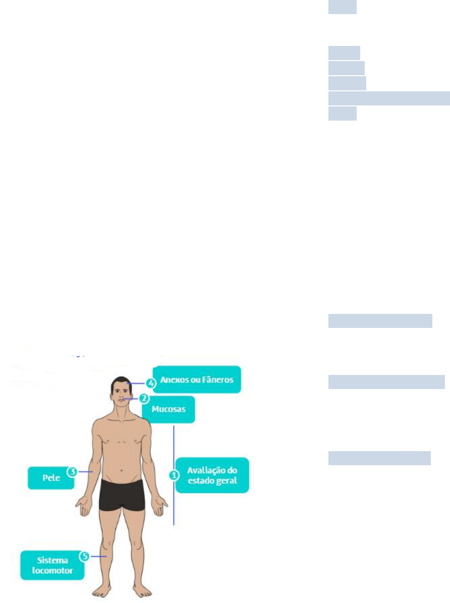 Exame físico geral qualitativo Visão geral O exame físico geral é a primeira etapa do exame clínico e além de complementar a anamnese, fornece uma visão do paciente como um todo, não segmentada. O exame é dividido em duas partes: qualitativo e quantitativo Características 1- Avalia um aspecto mais subjetivo do paciente 2- Gradua os parâmetros em graus, medidos de uma a quatro cruzes, onde uma é o nível mínimo e quatro o nível máximo (situações mais graves) Recomendações 1- Estar com o paciente em ambiente calmo e com menor barulho possível 2- Apresentar-se e informar a pessoa quais exames serão realizados e o motivo 3- Higienizar as mãos 4- Seguir uma sequência céfalo-caudal 5- Informar à pessoa o resultado do exame Aspectos importantes É necessário avaliar alguns aspectos importantes como o nível de consciência, atitude e marcha Roteiro Estado geral O estado geral é a avaliação subjetiva do paciente aparenta em sua totalidade e inclui: 1- Nível de consciência e orientação 2- Estado nutricional: 3- Fácies 4- Atitude 5- Humor 6- Marcha 7- Fâneros. 8- Mucosas. 9- Extremidade (+rever pulsos) 10- Tugor. Observação: o estado nutricional pode ser objetivamente avaliado pela relação entre a altura e o peso, contudo, durante o exame físico, diferentes aspectos que refletem o estado nutricional podem ser observados, como: • Tela subcutânea (hipoderme, apresenta alta quantidade de adipócitos) • Trofismo muscular Classificações O paciente pode estar em: 1- Bom estado geral (BEG): paciente que, mesmo sendo portador de uma doença, mantem o aspecto físico, intelectual e emocional compatível com sua idade e condição social 2- Regular estado geral (REG): paciente que manifesta sinais de doença, mas não se encontra prostado, nem teve sua condição nutricional e consciente significativamente alteradas 3- Mal estado geral (MEG): paciente com manifestações inequívocas de doença, com evidências clínicas de perda de peso (desnutrição) e/ou desidratação, o qual pode ainda ter alteração do nível de consciência e confusão mental Estado de consciência O estado de consciência e de lucidez do paciente deve ser registrado de maneira sucinta e clara na descrição do estado geral, mesmo que o exame neurológico posterior venha detalhar as alterações do nível de consciência e os testes que levaram a essa conclusão. Um paciente poderá ser classificado de diferentes formas: Orientação Capacidade de situar-se quanto a si mesmo e quanto ao ambiente. É elemento básico da atividade mental e sua avaliação é um instrumento valioso para a verificação de perturbações do nível de consciência. Podemos realizar perguntas como: • Qual o seu nome? • Qual a sua profissão? • Em que ano estamos? • Em que estado estamos? Capacidade de orientar-se é classificada em: 1. Orientação autopsíquica: orientação do individuo em relação a si mesmo. Revela se o sujeito sabe que ele é, idade, data de nascimento, profissão, estado civil etc. 2. Orientação alopsíquica: capacidade de orientar- se em relação ao mundo, isto é, quanto ao espaço (orientação espacial) e quanto ao tempo (orientação temporal) Atitudes Indiferentes ou ativas: correspondem ao padrão normal, no qual o paciente poderá assumir qualquer posição, de acordo com a sua vontade Forçadas: são consideradas como impostas pelo distúrbio que lhe acomete, ou seja, nessa atitude o paciente obterá alívio de seu sintoma ocupando determinada posição • Exemplo: ortopneica, genupeitoral ou prece maometana Passiva: o indivíduo mante a posição que é colocado no leito • Exemplos: pacientes inconscientes ou em estado de coma Exemplos Fácies É uma expressão facial distinta ou aparência associada às condições médicas específicas. • Procure descrever o que está vendo ao examinar estas pessoas, antes de tentar pensar em um diagnostico Exemplos Marchas Marcha é um conjunto de movimentos, mais ou menos rítmicos, dos membros inferiores que promovem o deslocamento do indivíduo Exemplos • Marcha em tesoura: paciente com paraparesia espástica genética ou adquirida • Marcha cerebelosa: paciente com acidente vascular encefálico e disfunção dos centros cerebelares • Marcha em escarvante ou steppage: paciente com polineurites • Marcha parkisoniana ou festinante: paciente portadores de doença de Parkinson Mucosas São tecidos epiteliais de revestimento interno das cavidades do corpo que têm contato com o meio externo. • Também significa o conjunto formado por epitélio e o tecido conjuntivo que reveste as cavidades úmidas do corpo, em contraste com a pele onde a superfície é seca Exame físico Durante o exame físico, o examinador devera avaliar as: 1- Conjuntivas oculares 2- Mucosas lábios-bucal, 3- Mucosa lingual 4- Mucosa gengival Observando características de coloração, umidade e eventuais lesões. Em geral, as mucosas apresentam coloração róseo-avermelhada • Graus de palidez: pode estar corado ou descorado (classificar o grau em cruzes) • Grau de hidratação: pode estar hidratado ou desidratado (classificar o grau em cruzes) • Presença de icterícia: se caracteriza por um tom amarelado nessas regiões. O paciente pode ser estar anictérico ou ictérico (classificar o grau em cruzes) • Presença de cianose: é indicativa de redução da oxigenação do sangue ou de redução da perfusão sanguínea (coloração mais azulada). O paciente pode estar cianótico ou acianótico Observação: especialmente ao manipular mucosas oculares, lembrar de estar com as mãos devidamente higienizadas e que após o exame, elas devem ser novamente limpas Pele e anexos O exame físico da pele e anexos fornece importantes informações que podem traduzir tanto afecções locais quanto processo sistêmicos. Todo o tegumento deve ser examinado, inclusive o couro cabeludo, as áreas genitais, a região palmoplantar e anexos Anexos 1- Cabelo