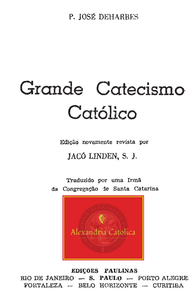 P. JOSÉ DEHARBES Gr.ande Catecismo-· Católico Edição novamente revista por JACó LINDEN, S. J. Traduzido por uma Irmã da Congregação 1.e Santa Catarina EDIÇÕES PAULINAS RIO DE ,JANEIRO - S. PAULO - PORTO ALEGRE FORTALEZA -- BELO HORIZONTE ~- CURITIBA https://alexandriacatolica.blogspot.com/ https://alexandriacatolica.blogspot.com.br NIHIL OBSTAT 16 de novembro de 1945 P. José Danti S. J. IMPRIMATUR São Paulo, 20-Xf-1945 Carlos Cardeal Arceb. Metrop. Todos os direitos reservados https://alexandriacatolica.blogspot.com.br Primeiras orações e fórmulas que o cristão deve saber de cor Medi.ta este.is coisas., ocupa-te ne- 1.a.~ a fim à.e que o te,u aproveita- 1ncnto seja manifesto a todos .•.. 1 Timot., IV., 15. 1. O Sü1a1 da Cruz Pelo sinal da santa cruz, livre-nos Deus, nosso Senhor, dos nossos inimigos. Em nome do Padre e do Filho e do Espírito Santo. Amem. 2. Credo, ou Símbolo dos ApóstoJos Creio em Deus, Padre Todo-Poderoso. Criador do céu e da terra; e em Jesus Cristo um só seu Filho, Nosso Se nhor: o qual foi concebido" do Espírito Santo, nasceu de Maria Virgem, padeceu sob o poder de Pôncio Pilatos, foi crucificado, morto e sepultado; desceu aos infernos; ao ter ceiro dia ressurgju dos mortos; subiu aos céus estâ sentado à mão direita de Deus Padre Todo-Poderoso, donde hâ de vir a julgar os vjvos e os mortos; creio no Espírito Santo, a Santa Igreja Católica a Comunhão dos Santos, a remis são dos p~cados, a ressurreição da carne, a vida eter na. Amém. 3. Padre-Nosso, ou Oração Domínícal Padre-Nosso, que estais no cêu, santificado sejo o vosso nome; venha a nós o vosso reino, seja feita a vossa vonta&t, ass1m na terra como no céu; o pão nosso de cada https://alexandriacatolica.blogspot.com.br -6 dfa nos daj hoje; e perdoai-nos as nossas dividas assim co~ mo nós pcrdoamt1s a.os nossos devedores, e não nos deixeis cair em tentação, mas livrai•nos do mnl. Amém. 4. Gloria Patri Glôr.ia ao Padre e ao F'ilho e ao Espírito Santo . .Assim como era no princípio e agora e sempre e por todos os se. culos dos séculos. Amém. 5. Ave-Nlaria, ou Saudação Angélica Ave, Maria, cheia de g1·aça o S~nhor é convosco. Ben- dita sois vós entre as mulheres, bendito e o fruto do vos.3o ventre, Jesus. Santa Maria, Mãe de Deus, rogai por nós pe~ -cadores, agota e na hora de nossa morte. Amém. 6. Salve Rainha Salve Rainha> 1-Iãe de misericórdia, vida, doçura, espe rança nossa, salve. A vós bradamos os degredados filhos de Eva; a vós suspiramos, gemendo e chorando neste vale de lágrimas, Eia, pois, advogada nossa, esses vossos olhos mi• sericordíosos a nós volvei. E depois deste desterro lllOS· trai-nos Jesus, bendito fruto do vosso ventre, ó clemc21te, 6 pjedosa, ó doce- sempre Vfrgcm Marfa. Rogai por nós, santa Mãe de Deus. para que sejamos dignos das promes sas de Cristo. Amém. 7. «Santo Anjo do Senhor» Santo Anjo do Senhor, meu zeloso guardador se a tí me confiou a piedade divina, sempre me rege, guarda, go verna e ilumina. Amém. 8. «Réquiem aetcrnam>>, pelos fiéis defuntos Daí-lhes, Senhor, o eterno descanso: entre os rcsplen dores da 1uz perpétua. Descansem em paz. Amém. 9. Ato de fé Eu creio firmemente que há um só Deus, em três Pea coas iguais realm~nte distintas, Padn\ Filho e Espírito Santo; 9ue dá o céu aos bons e o inferno aos maus para .scmpl"c. Creio que o filho de Deus se fez homem, padeceu e morr~u na cruz para nos salvar e que ao terceiro dia res-• https://alexandriacatolica.blogspot.com.br suscitou. Creio tudo o mais Q\le crê e ensina a Santa Igre ~~ CatóHca, A110stólica, Romana, porque Deus, verdade infalível, lho revelou. E nesta crcn~a quero viver e morrer. 1 O. Ato de esperànça Eu espero, tneu Deus, com firme confiança, que, pelos merecimentos de meu Senhor Jesus Cristo, me dareis a saJ .. vação eterna e as graças necessárias para consegui~la, por .. que Vós, sumamente bom e poderoso, o haveis prometido a quem observar fielmente os vossos mandamentos, como eu. proponho fazer com o vosso auxílio. 11. Ato de caridade Eu vos amo, meu Deus, de todo o meu coração e sobre todas as coisas, porque sois infinitamente bom e amável, e antes quero perder tudo que vos ofender. Por amor de Vós amo a meu próximo como a mim mesmo. 12. Ato de contrição Senho1· meu Jesus Cristo, Deus e Homem verdadeiro,. Criador e Redentor meu por serdes vós quem sois suma mente bom e digno de ser amado e porque vos amo e estimo sobre todas as coisas, pesa-me, Senhor, de todo o meu cora cão de vos ter ofendido, pesa-me também por ter penlido o céu e merecido o inferno; proponho firmementet ajudado corn os auxílios de vossa divina graça, emendar-me e nun ca mais vos tornar ofender; espero alcançar o perdão das. minhas culpas. pela vossa infinita misericórdia. Amém. 13. Os dois mistérios prjncipajs da fé 1) Unidade e Trindade de Deus; 2) Incarnação, Paixão e Morte de Nosso Senhor Jesus: Cristo. 14. Os dois mandamentos da caridade 1 ° Amarás ao Senhor teu Deus de todo o coração, de to da a tua alma e de toda a tua mente. 201 Amarás ao teu próximo como a ti mesmo. https://alexandriacatolica.blogspot.com.br ...... l5.t Os dez mandamentos da lei de Deus, 1 ou o Decálogo Os mandamentos da lei de Deus são dez: os três pri meiros perlencen1 à honra d~ Deus, t:! os outros sete ao pro veito do próximo: 1" Amar a Deus sobre todas as coisas. 2° Não tomar seu santo nome em vão. 31;1 Guardar os domingos e festas de guarda. 49 Honrar pai e mãe. 5v Não matar. 6,;, Não pecar contra a castidade. 79 Não furtar. 89 Não levantar falso testemunho. 9,;, Não desejar a mulher do próximo. 10,;, Não cubiçar as coisas alheias Estes dez mandamentos se encerrám em dois: Amar a Deus sobre todas as coisas e ao próximo como a nós mes mos por amor de Deus. 16. Os cinco rnandamentos da santa madre I~reja 1·1 Ouvir Missa inteira todos os domingos e festas de guarda. 2'., Confessar-se ao menos uma vez