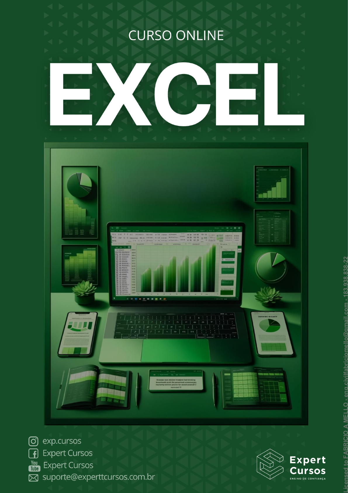 L ic en se d t o F A B R IC IO A M E L L O - e n g .c iv ilf ab ri ci o m el lo @ g m ai l.c o m - 1 83 .9 38 .8 38 -2 2 https://experttcursos.com.br/ SUMÁRIO Seja bem-vindo(a) Excel Expert...........................................................................4 Área de trabalho do Excel.....................................................................................5 Movimentando-se pelo Excel................................................................................6 Teclas de Atalho....................................................................................................6 Inserindo dados....................................................................................................7 Entrada de fórmulas na barra de fórmulas..........................................................7 Alteração do conteúdo de uma célula..................................................................9 Formatação de textos e números.........................................................................9 Formatação numérica em uma célula..................................................................9 Alinhamento e posicionamento..........................................................................10 Mesclar e centralizar...........................................................................................10 Alterando a altura de uma linha ou a largura de uma coluna...........................11 Salvando o seu arquivo.......................................................................................12 As funções básicas mais utilizadas.....................................................................12 Criando planilhas e tabelas.................................................................................13 Inserindo imagens no Excel................................................................................15 Validação de dados..............................................................................................16 Formatação condicional......................................................................................18 Criando diferentes tipos de gráficos...................................................................19 Travamento de células........................................................................................21 Funções SOMASE e SOMASES.............................................................................22 Função SE.............................................................................................................23 Funções E/OU......................................................................................................23 Função para descobrir a média ponderada........................................................24 Função de arredondamento de casas decimais.................................................25 Função PROCV.....................................................................................................26 Função PROCH.....................................................................................................26 Função PROCX.....................................................................................................26 Funções ÍNDICE e CORRESP...............................................................................27 Funções financeiras............................................................................................27 Função SEERRO..................................................................................................28 L ic en se d t o F A B R IC IO A M E L L O - e n g .c iv ilf ab ri ci o m el lo @ g m ai l.c o m - 1 83 .9 38 .8 38 -2 2 https://experttcursos.com.br/ https://experttcursos.com.br/ Proteção de arquivos e planilhas no Excel.........................................................28 Criando macros no Excel.....................................................................................30 Power Query........................................................................................................31 Power Pivot..........................................................................................................32 Tabelas e gráficos dinâmicos..............................................................................33 Criação de Dashboards........................................................................................34 Agradecimentos...................................................................................................36 L ic en se d t o F A B R IC IO A M E L L O - e n g .c iv ilf ab ri ci o m el lo @ g m ai l.c o m - 1 83 .9 38 .8 38 -2 2 https://experttcursos.com.br/ https://experttcursos.com.br/ SEJA BEM-VINDO(A) AO EXCEL EXPERT O E-book Excel Expert tem por objetivo fazer você dominar o Microsoft Office Excel do básico ao avançado, independente da sua formação ou área de atuação, estamos falando do programa mais utilizado e requisitado em milhares de empresas no Brasil e no mundo. Mesmo quem já usa o Excel pode ter interesse pelo e-book, porque pode usá-lo para revisar o que já sabe e aprender novos conteúdos, como aprender funções mais avançadas, formatações e criação de excelentes Dashboards. Você vai aprender como funciona o Excel, diferentes tipos de funções, atalhos, criação de planilhas, tabelas, gráficos e diversos recursos para você trabalhar de maneira inteligente. L ic en se d t o F A B R IC IO A M E L L O - e n g .c iv ilf ab ri ci o m el lo @ g m ai l.c o m - 1 83 .9 38 .8 38 -2 2 https://experttcursos.com.br/ https://experttcursos.com.br/ ÁREA DE TRABALHO DO EXCEL Ao ser carregado, o Excel exibe sua tela de trabalho mostrando uma planilha em branco com o nome de Pasta 1. A tela de trabalho do Excel é composta por diversos elementos, ícones e botões, entre eles podemos destacar: Células: Uma tabela ou uma planilha é composta por células. Uma célula é o encontro de uma coluna com uma li