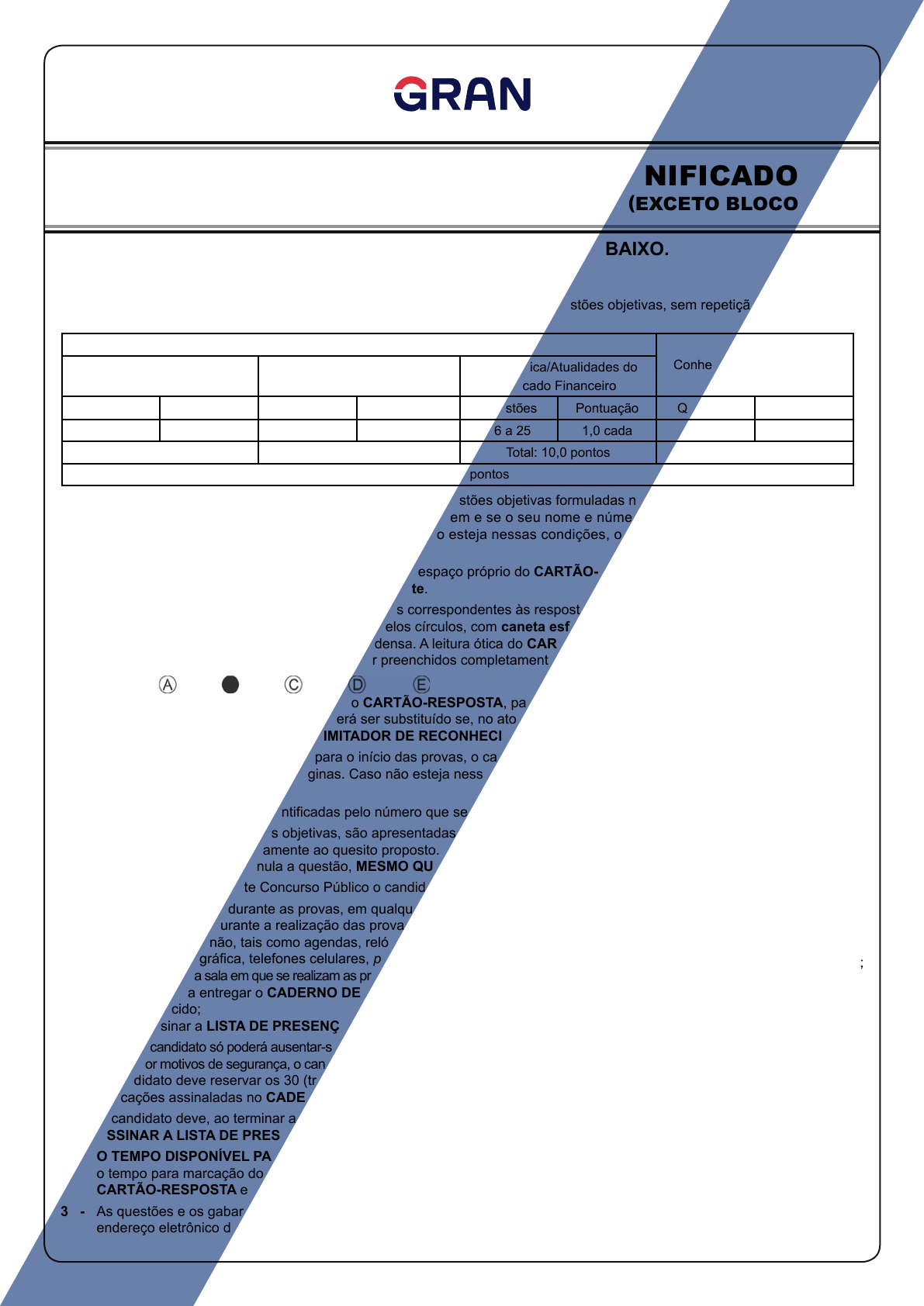 CONCURSO PÚBLICO NACIONAL UNIFICADO CONHECIMENTOS GERAIS PARA TODOS OS BLOCOS (EXCETO BLOCO 8) LEIA ATENTAMENTE AS INSTRUÇÕES ABAIXO. 01 - O candidato recebeu do fiscal o seguinte material: a) este CADERNO DE QUESTÕES, com o enunciado das 70 (setenta) questões objetivas, sem repetição ou falha, com a seguinte distribuição: Conhecimentos Básicos Conhecimentos Específicos Língua Portuguesa Língua Inglesa Matemática/Atualidades do Mercado Financeiro Questões Pontuação Questões Pontuação Questões Pontuação Questões Pontuação 1 a 10 1,0 cada 11 a 15 1,0 cada 16 a 25 1,0 cada 26 a 70 1,0 cada Total: 10,0 pontos Total: 5,0 pontos Total: 10,0 pontos Total: 45,0 pontos Total: 70,0 pontos b) CARTÃO-RESPOSTA destinado às respostas das questões objetivas formuladas nas provas. 02 - O candidato deve verificar se este material está em ordem e se o seu nome e número de inscrição conferem com os que aparecem no CARTÃO-RESPOSTA. Caso não esteja nessas condições, o fato deve ser IMEDIATAMENTE notificado ao fiscal. 03 - Após a conferência, o candidato deverá assinar, no espaço próprio do CARTÃO-RESPOSTA, com caneta esferográfica de tinta preta, fabricada em material transparente. 04 - No CARTÃO-RESPOSTA, a marcação das letras correspondentes às respostas certas deve ser feita cobrindo a letra e preenchendo todo o espaço compreendido pelos círculos, com caneta esferográfica de tinta preta, fabricada em material transparente, de forma contínua e densa. A leitura ótica do CARTÃO-RESPOSTA é sensível a marcas escuras; portanto, os campos de marcação devem ser preenchidos completamente, sem deixar claros. Exemplo: 05 - O candidato deve ter muito cuidado com o CARTÃO-RESPOSTA, para não o DOBRAR, AMASSAR ou MANCHAR. O CARTÃO-RESPOSTA SOMENTE poderá ser substituído se, no ato da entrega ao candidato, já estiver danificado em suas margens superior e/ou inferior - DELIMITADOR DE RECONHECIMENTO PARA LEITURA ÓTICA. 06 - Imediatamente após a autorização para o início das provas, o candidato deve conferir se este CADERNO DE QUESTÕES está em ordem e com todas as páginas. Caso não esteja nessas condições, o fato deve ser IMEDIATAMENTE notificado ao fiscal. 07 - As questões objetivas são identificadas pelo número que se situa acima de seu enunciado. 08 - Para cada uma das questões objetivas, são apresentadas 5 alternativas classificadas com as letras (A), (B), (C), (D) e (E); só uma responde adequadamente ao quesito proposto. O candidato só deve assinalar UMA RESPOSTA: a marcação em mais de uma alternativa anula a questão, MESMO QUE UMA DAS RESPOSTAS ESTEJA CORRETA. 09 - SERÁ ELIMINADO deste Concurso Público o candidato que: a) for surpreendido, durante as provas, em qualquer tipo de comunicação com outro candidato; b) portar ou usar, durante a realização das provas, aparelhos sonoros, fonográficos, de comunicação ou de registro, eletrônicos ou não, tais como agendas, relógios de qualquer natureza, notebook, transmissor de dados e mensagens, máquina fotográfica, telefones celulares, pagers, microcomputadores portáteis e/ou similares; c) se ausentar da sala em que se realizam as provas levando consigo o CADERNO DE QUESTÕES e/ou o CARTÃO-RESPOSTA; d) se recusar a entregar o CADERNO DE QUESTÕES e/ou o CARTÃO-RESPOSTA, quando terminar o tempo estabelecido; e) não assinar a LISTA DE PRESENÇA e/ou o CARTÃO-RESPOSTA. Obs. O candidato só poderá ausentar-se do recinto das provas após 2 (duas) horas contadas a partir do efetivo início das mesmas. Por motivos de segurança, o candidato NÃO PODERÁ LEVAR O CADERNO DE QUESTÕES, a qualquer momento. 10 - O candidato deve reservar os 30 (trinta) minutos finais para marcar seu CARTÃO-RESPOSTA. Os rascunhos e as marcações assinaladas no CADERNO DE QUESTÕES NÃO SERÃO LEVADOS EM CONTA. 11 - O candidato deve, ao terminar as provas, entregar ao fiscal o CADERNO DE QUESTÕES e o CARTÃO-RESPOSTA e ASSINAR A LISTA DE PRESENÇA. 12 - O TEMPO DISPONÍVEL PARA ESTAS PROVAS DE QUESTÕES OBJETIVAS É DE 4 (QUATRO) HORAS, já incluído o tempo para marcação do seu CARTÃO-RESPOSTA, findo o qual o candidato deverá, obrigatoriamente, entregar o CARTÃO-RESPOSTA e o CADERNO DE QUESTÕES. 13 - As questões e os gabaritos das Provas Objetivas serão divulgados a partir do primeiro dia útil após sua realização, no endereço eletrônico da FUNDAÇÃO CESGRANRIO (http://www.cesgranrio.org.br). 13º SIMULADO Bas ea do n o fo rm at o de p ro va ap lic ad o pe la b an ca C es gr an rio FOLHA DE ROSTO ORIENTATIVA PARA PROVA OBJETIVA LEIA AS ORIENTAÇÕES COM CALMA E ATENÇÃO! INSTRUÇÕES GERAIS ● Atenção ao tempo de duração da prova, que já inclui o preenchimento da folha de respostas. ● Cada uma das questões da prova objetiva está vinculada ao comando que imediatamente a antecede e contém orientação necessária para resposta. Para cada questão, existe apenas UMA resposta válida e de acordo com o gabarito. ● Faltando uma hora para o término do simulado, você receberá um e-mail para preencher o cartão-resposta, a fim de avaliar sua posição no ranking. Basta clicar no botão vermelho de PREENCHER GABARITO, que estará no e-mail, ou acessar a página de download da prova. Você deve fazer o cadastro em nossa plataforma para participar do ranking. Não se preocupe: o cadastro é grátis e muito simples de ser realizado. – Se a sua prova for estilo Certo ou Errado (CESPE/CEBRASPE): marque o campo designado com o código C, caso julgue o item CERTO; ou o campo designado com o código E, caso julgue o item ERRADO. Se optar por não responder a uma determinada questão, marque o campo “EM BRANCO”. Lembrando que, neste estilo de banca, uma resposta errada anula uma resposta certa. Obs.: Se não houver sinalização quanto à prova ser estilo Cespe/Cebraspe, apesar de ser no estilo CERTO e ERRADO, você não terá questões anuladas no cartão-resposta em caso de respos