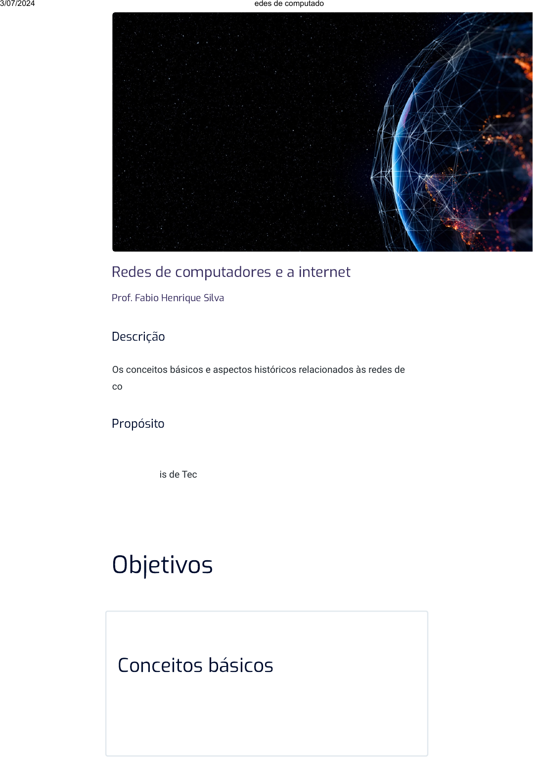 Redes de computadores e a internet Prof. Fabio Henrique Silva Descrição Os conceitos básicos e aspectos históricos relacionados às redes de computadores e à internet. Propósito A organização das redes de computadores é essencial para os profissionais de Tecnologia da Informação (TI) utilizarem os serviços oferecidos por uma ou mais camadas de um modelo de arquitetura de redes. Objetivos Módulo 1 Conceitos básicos Reconhecer os conceitos básicos de redes de computadores e a internet. 23/07/2024, 12:58 Redes de computadores e a internet https://stecine.azureedge.net/repositorio//00212ti/07397/index.html?brand=estacio# 1/53 Módulo 2 Parâmetros de avaliação Descrever os parâmetros de avaliação das redes. Módulo 3 Camadas de protocolo e modelos de serviço Identificar a arquitetura de redes de computadores como um modelo em camadas. Módulo 4 Histórico da internet Descrever os aspectos da evolução das redes e a internet. Introdução A internet, nos moldes atuais, possui bilhões de usuários conectados, dispositivos e enlaces de comunicação, além de uma quantidade enorme de computadores. Os usuários podem conectar uma alta gama de dispositivos, tais como: notebooks, smart TVs, smartphones, sensores, webcams, console para jogos e utensílios domésticos. Nesses diversos dispositivos, são executadas diversas aplicações de redes que revolucionaram a forma como vivemos, 23/07/2024, 12:58 Redes de computadores e a internet https://stecine.azureedge.net/repositorio//00212ti/07397/index.html?brand=estacio# 2/53 seja no trabalho, no comércio, nas relações interpessoais, como também na forma como nos divertimos. Não tem como negarmos a importância da internet para todos nós, mas para quem estuda computação vai muito além do simples uso. É importante compreender os conceitos de organização das redes de computadores e internet, necessários para utilização nas redes de hoje e do futuro. 1 - Conceitos básicos Ao �nal deste módulo, você será capaz de reconhecer os conceitos básicos de redes de computadores e a internet. O que é a internet? Confira agora as principais reflexões sobre o que, de fato, é a internet. 23/07/2024, 12:58 Redes de computadores e a internet https://stecine.azureedge.net/repositorio//00212ti/07397/index.html?brand=estacio# 3/53 As redes de computadores podem ser definidas como um conjunto de módulos processadores interligados por um sistema de comunicação, capazes de trocar informações e compartilhar recursos. Já a internet pode ser definida como um conjunto de rede de computadores que opera, basicamente, utilizando os protocolos TCP e IP, e interconecta bilhões de dispositivos de computação ao redor do mundo. No entanto, a internet não é apenas um conjunto de redes interligadas. Há diversas formas de utilização para definir o que é a internet e como ela está organizada. Por exemplo, podemos defini-la de acordo com os componentes de software e hardware básicos que a formam. Podemos considerar que a internet é formada por três grandes partes: Sistemas �nais Núcleo da rede Redes de acesso A junção dessas três partes permite que você use seu smartphone, acesse um aplicativo e utilize um serviço hospedado em qualquer datacenter no mundo. Outra forma de enxergar a internet é como uma infraestrutura de redes que fornece diversos serviços para que as aplicações de rede possam trocar informações. Alguns dos serviços oferecidos pela internet são: definir o caminho da origem até o destino; corrigir os erros que possam ocorrer no trajeto; evitar que haja sobrecarga dos componentes. Os serviços fornecidos pela internet permitem que os desenvolvedores das aplicações possam se preocupar com suas funcionalidades apenas, não somente com diversos detalhes de como a informação será propagada. Basta o aplicativo enviar os dados para essa infraestrutura 23/07/2024, 12:58 Redes de computadores e a internet https://stecine.azureedge.net/repositorio//00212ti/07397/index.html?brand=estacio# 4/53 de serviços que ela fará o maior esforço para que a informação seja entregue ao destino. Vamos agora conhecer esses componentes? O entorno da internet A borda da rede Confira agora os principais pontos sobre a borda da rede. Os dispositivos que utilizamos e que estão conectados à internet são chamados de sistemas finais, ou hosts (hospedeiros), pois se encontram no entorno, ou periferia, da internet e são nesses dispositivos que executamos as aplicações de rede. De uma forma geral, eles podem ser divididos em duas grandes categorias: Clientes São os desktops, notebooks, smartphones e tablets, dispositivos que, normalmente, estão de posse de algum usuário. 23/07/2024, 12:58 Redes de computadores e a internet https://stecine.azureedge.net/repositorio//00212ti/07397/index.html?brand=estacio# 5/53 Servidores São as máquinas mais poderosas, que armazenam e distribuem páginas web, vídeo em tempo real, retransmissão de e-mails etc. Sobre os servidores, é comum chamarmos de máquinas grandes, poderosas, mas, na realidade, o que define a máquina ser servidora não é o hardware, e sim o software executado por ela. Como o nome diz, o servidor será o dispositivo que contém o software, servindo alguma coisa ou algum serviço para um cliente que faz um pedido ou requisição. A imagem a seguir ilustra a localização dos sistemas finais em uma infraestrutura de redes de computadores. Confira! 23/07/2024, 12:58 Redes de computadores e a internet https://stecine.azureedge.net/repositorio//00212ti/07397/index.html?brand=estacio# 6/53 Interação entre sistemas finais. Redes de acesso Confira agora os principais pontos sobre as famosas redes de acesso. A rede de acesso é uma rede física que conecta os sistemas finais ao primeiro roteador (conhecido como “roteador de borda”) de um caminho partindo de um sistema final até outro qualquer. Podemos dizer que a rede de acesso é o meio físico, ou enlace, q