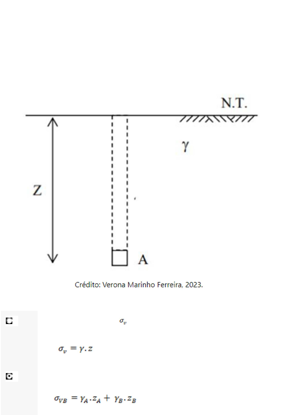 ste gabarito é para uso exclusivo do aluno e não deve ser publicado ou compartilhado em redes sociais ou grupo de mensagens. O seu compartilhamento infringe as políticas do Centro Universitário UNINTER e poderá implicar sanções disciplinares, com possibilidade de desligamento do quadro de alunos do Centro Universitário, bem como responder ações judiciais no âmbito cível e criminal. Questão 1/10 - Mecânica dos Solos As tensões totais do solo são representadas pelo peso próprio do solo, na condição em que se encontra, e ocorrem no interior de uma amostra de solo ou maciço caracterizadas em geral por um ponto. Dessa forma, basta saber a profundidade e as condições em que o maciço se encontra para determinar o valor do peso específico. Sobre as tensões totais de um solo, podemos afirmar que: A A tensão total horizontal ( ) no ponto A é a expressão: B Tendo dois tipos de solos e dois pontos de referência em cada um deles, a tensão vertical em B será calculada como: Você assinalou essa alternativa (B) C A tensão cisalhante acontecerá nos solos úmidos pois a água resiste a estas tensões. D As tensões horizontais ( ) são perpendiculares à superfície, anulando as resultantes, dando somente atenção às tensões verticais. Questão 2/10 - Mecânica dos Solos As curvas que ligam cada ponto das tensões verticais, na estrutura interna do solo, são chamadas de isóbaras. O desenho de várias camadas de linhas, sendo quase círculos, são as isóbaras, que formam o bulbo de “tensões”, como indicado nas figuras a seguir para uma carga concentrada. Os bulbos de pressão receberam esse nome em razão da sua forma. Sobre este assunto, é correto afirmar que: A Os bulbos de tensões são as pressões no solo, que apresentam a distribuição conforme o carregamento aplicado na superfície do da base de uma fundação. Você assinalou essa alternativa (A) B Os bulbos de tensões não interferem, na prática, na transmissão da carga da construção ao solo (fundação). C Para bulbo de tensões correspondentes a cálculos para pontos fora do carregamento, não existe D Os bulbos de tensões apresentam a distribuição independente do carregamento aplicado na superfície do terreno. Questão 3/10 - Mecânica dos Solos A PERMEABILIDADE é capacidade de um material transmitir seus fluidos por meio dos vazios do solo. Para prevenir os possíveis impactos no comportamento do solo, no estudo do fluxo da água será adotado o permeâmetro como um modelo para exemplificar o caminho que a água percorre. Sobre este assunto, assinale a alternativa correta: A Permeâmetro é um dispositivo, normalmente em formato de um cubo, adotado para a medição da quantidade de permeabilidade eletromagnética de substâncias naturais. B A relação entre a razão da perda de carga (h) e a distância ao longo da carga (L) é denominada C O coeficiente de permeabilidade (k) foi desenvolvido pelo Darcy (1850), que, pela Lei de Darcy resultando que a velocidade de percolação é diretamente proporcional ao gradiente hidráulico, tendo como expressão da vazão: Você assinalou essa alternativa (C) D De acordo com Caputo (2022), é mais conveniente trabalhar com a área média (A) da seção transversal da amostra do solo do que área total de seus vazios. Questão 4/10 - Mecânica dos Solos Em se tratando de um carregamento não linear, considerado a aplicação de uma carga uniformemente distribuída como uma placa retangular, em que as dimensões possam ter grandezas tendendo ao comprimento infinito e largura constante, os esforços podem ser alcançados por meio da solução desenvolvida por Terzaghi e Carothers. Considerando a figura acima, em um ponto (M) que esteja na profundidade (z), com localização em ângulos e radianos, as tensões nesse ponto se darão pelas expressões: A B C Você assinalou essa alternativa (C) D Questão 5/10 - Mecânica dos Solos A tensão no solo é transmitida por meio do contato entre as partículas, grão a grão, alterando seu volume e forma inicial. O grau de deformação depende das propriedades mecânicas do solo, como seu peso próprio, e da carga aplicada sobre ele. Na Figura a seguir, há grãos e linhas imaginárias representadas pela área de contato (Ac) e pela área total (A). Como é inviável e não há expressões e modelos matemáticos para calcular a área de contato Ac, os valores de tensões podem ser considerados pela linha plana, que é representada pela área total A. Em se tratando de uma visão macroscópica, Marangon (2018) explica que a tensão pode ser tratada como um meio contínuo. Assim, as tensões normal e cisalhante deverão adotar o somatório das forças atuantes pela área. Como é inviável e não há expressões e modelos matemáticos para calcular a área de contato ( ) Assinale a alternativa correta: A Tensão normal é a somatória dos componentes de forças normais ao plano, dividida pela área total conforme a equação: Você assinalou essa alternativa (A) B Tensão cisalhante é a somatória das forças tangenciais, dividida pela área total conforme a equação: C Tensão normal é a somatória dos componentes das forças tangenciais, dividida pela área total D Tensão cisalhante é a somatória das forças normais, dividida pela área total conforme a equação: Questão 6/10 - Mecânica dos Solos As pressões de contato são pressões normais entre a estrutura da fundação e o solo. A distribuição no solo depende de diversos fatores: do tipo de fundação (que pode ser deduzida pelo módulo de elasticidade, o produto (E.I), em que E é o módulo de elasticidade e I é o momento de inércia), da natureza do solo, do tipo de carga e da profundidade. Sobre este assunto, assinale a alternativa correta: A O tipo de estrutura da fundação resulta em deformações similares. B Uma fundação rígida fornece alguma resistência à flexão e se deforma uniformemente, assumindo uma forma mais plana. Você a