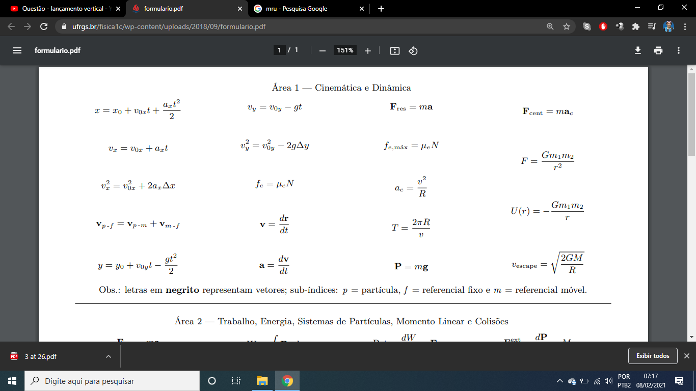 Questão - lançamento vertical x formulario.pdf G mru Pesquisa Google x + - X C Q formulario.pdf 1 / 1 - 151% + Área 1 - Cinemática e Dinâmica r dv P=mg = R Obs.: letras em negrito representam vetores; sub-índices: = partícula, f = referencial fixo e m = referencial Área 2 - Trabalho, Energia, Sistemas de Partículas, Momento Linear e Colisões dW dP next 3 at 26.pdf Exibir todos POR 07:17 Digite aqui para pesquisar O PTB2 08/02/2021