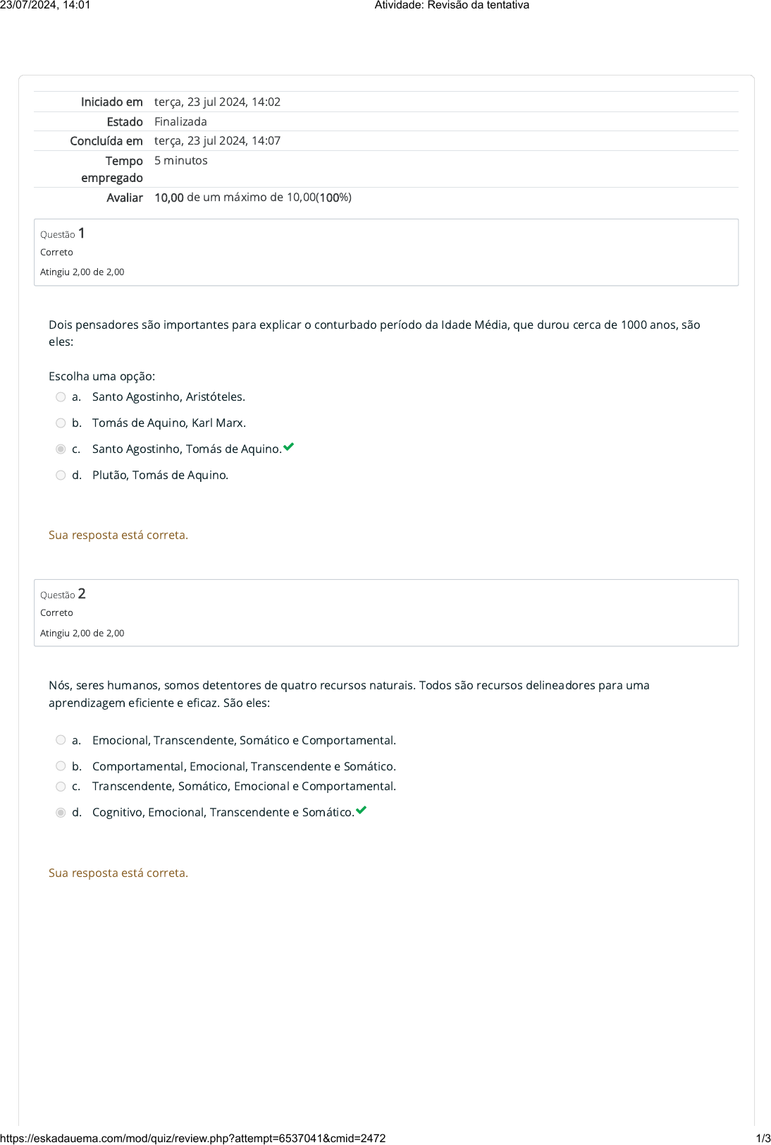 Iniciado em terça, 23 jul 2024, 14:02 Estado Finalizada Concluída em terça, 23 jul 2024, 14:07 Tempo empregado 5 minutos Avaliar 10,00 de um máximo de 10,00(100%) Questão 1 Correto Atingiu 2,00 de 2,00 Questão 2 Correto Atingiu 2,00 de 2,00 Dois pensadores são importantes para explicar o conturbado período da Idade Média, que durou cerca de 1000 anos, são eles: Escolha uma opção: a. Santo Agostinho, Aristóteles. b. Tomás de Aquino, Karl Marx. c. Santo Agostinho, Tomás de Aquino. d. Plutão, Tomás de Aquino. Sua resposta está correta. Nós, seres humanos, somos detentores de quatro recursos naturais. Todos são recursos delineadores para uma aprendizagem e�ciente e e�caz. São eles: a. Emocional, Transcendente, Somático e Comportamental. b. Comportamental, Emocional, Transcendente e Somático. c. Transcendente, Somático, Emocional e Comportamental. d. Cognitivo, Emocional, Transcendente e Somático. Sua resposta está correta. 23/07/2024, 14:01 Atividade: Revisão da tentativa https://eskadauema.com/mod/quiz/review.php?attempt=6537041&cmid=2472 1/3 Questão 3 Correto Atingiu 2,00 de 2,00 Questão 4 Correto Atingiu 2,00 de 2,00 Questão 5 Correto Atingiu 2,00 de 2,00 Os romanos, após a cristianização do Império, têm suas análises comportamentais e transcendentais a partir do cristianismo. A percepção do ser humano e do mundo eram norteadas pelos aspectos religiosos. Fala-se de uma visão ___________, vale dizer, Deus é tudo e tudo é Deus. Escolha uma opção: a. Panteísta b. Politeísta c. Ateísta d. Deísta Sua resposta está correta. A Psicologia tem uma identidade própria, isto é, estuda os fenômenos psicológicos para uma profunda compreensão da totalidade da vida humana. Assim, marque a opção que caracterize o objeto de estudo da Psicologia. a. Comportamento humano e a in�uência do meio sobre o indivíduo. b. Comportamento humano e seus aspectos biológicos. c. O ser humano, seu comportamento e sua vida, a partir de si e a partir do outro. d. O ser humano e suas relações sociais, seu comportamento e sua vida. Sua resposta está correta. A história do pensamento humano, em regra, perpassa pelo pensamento dos gregos. Os gregos não se dedicaram apenas a política, a matemática, a mitologia, a arte e a �loso�a, mas também ao comportamento humano. Além de Sócrates, Platão e Aristóteles também se dedicaram a compreender o espírito grego, por meio da �loso�a, visando compreender a interioridade do homem. Acerca das contribuições dos gregos para a Psicologia, marque a opção correta. a. Para Aristóteles, a alma é a causa de todos os processos do corpo. Aqui temos a relação entre razão e percepção humana, considerado o primeiro tratado de Psicologia, propriamente dito. b. Sócrates conseguiu diferenciar o animal racional e o irracional. Para o renomado �lósofo, o homem e os animais domesticáveis são detentores da razão. c. Para Sócrates, apenas o homem é detentor da razão. Em outras palavras, apenas o homem tem consciência de ser homem, diferentemente de uma criança de 07 anos, por exemplo, que não tem consciência de ser uma criança. d. Aristóteles e Sócrates conseguiram diferenciar o animal racional e o irracional. Para os �lósofos, o homem e os animais domesticáveis são detentores da razão, mas não de emoção. Sua resposta está correta. 23/07/2024, 14:01 Atividade: Revisão da tentativa https://eskadauema.com/mod/quiz/review.php?attempt=6537041&cmid=2472 2/3 Termos de uso Política de privacidade 23/07/2024, 14:01 Atividade: Revisão da tentativa https://eskadauema.com/mod/quiz/review.php?attempt=6537041&cmid=2472 3/3 https://eskadauema.com/admin/tool/policy/view.php?policyid=1&versionid=3 https://eskadauema.com/admin/tool/policy/view.php?policyid=2&versionid=2