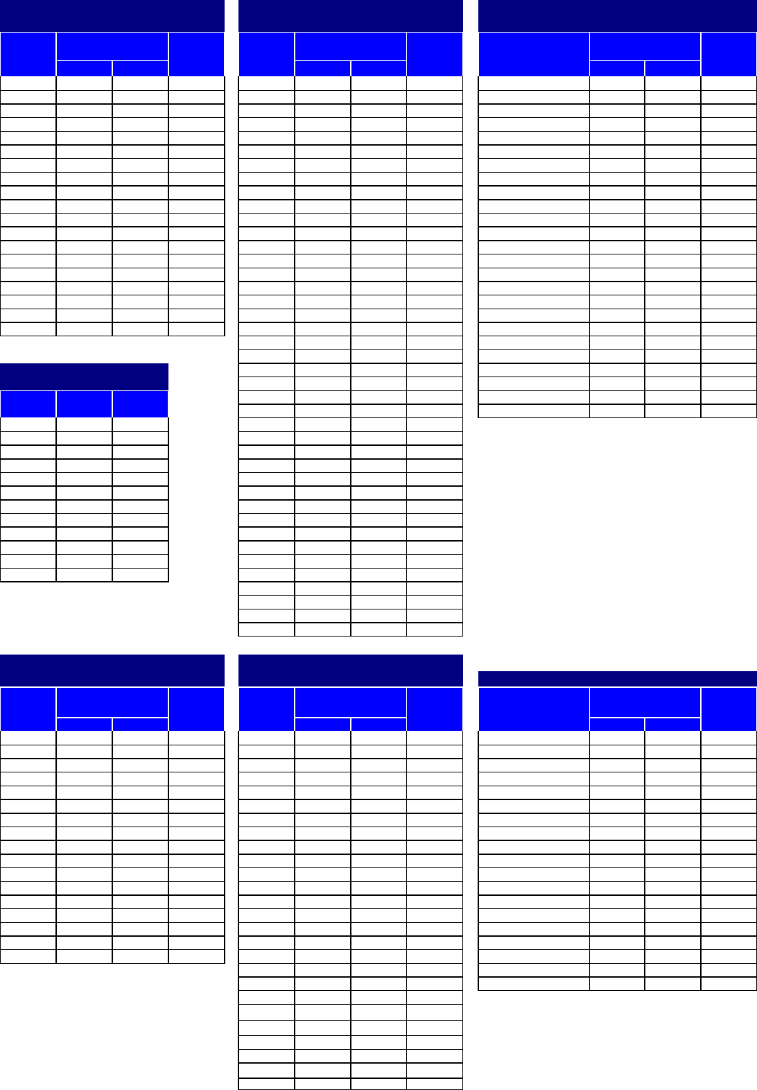 D x passo D x passo mm máximo minimo mm máximo minimo máximo minimo 3x0.50 2.599 2.459 2.5 3x0.35 2.721 2.621 2.65 2.697 2.593 2.6 3,5x0.60 3.010 2.850 2.9 3.5x0.35 3.221 3.121 3.15 2.895 2.768 2.85 4x0.70 3.422 3.242 3.3 4x0.50 3.599 3.459 3.5 3.530 3.403 3.5 4,5x0.75 3.878 3.688 3.7 5x0.50 4.599 4.459 4.5 3.962 3.810 3.9 5x0.80 4.334 4.134 4.2 6x0.75 5.378 5.188 5.2 4.597 4.470 4.5 6x1.00 5.153 4.917 5.0 7x0.75 6.378 6.188 6.2 5.257 5.130 5.2 7x1.00 6.153 5.917 6.0 8x0.75 7.378 7.188 7.2 6.731 6.578 6.6 8x1.25 6.912 6.647 6.8 8x1.00 7.153 6.917 7.0 8.153 7.975 8.0 9x1.25 7.912 7.647 7.8 9x0.75 8.378 8.188 8.2 9.550 9.347 9.4 10x1.50 8.676 8.376 8.5 9x1.00 8.153 7.917 8.0 10.871 10.515 10.8 12x1.75 10.441 10.106 10.2 10x0.75 9.378 9.188 9.2 12.446 12.090 12.2 14x2.00 12.210 11.835 12.0 10x1.00 9.153 8.917 9.0 13.868 13.614 13.5 16x2.00 14.210 13.835 14.0 10x1.25 8.912 8.647 8.8 16.840 16.586 16.5 18x2.50 15.744 15.294 15.5 12x1.00 11.153 10.917 11.0 19.761 19.481 19.5 20x2.50 17.744 17.294 17.5 12x1.25 10.912 10.647 10.8 22.606 22.301 22.25 22x2.50 19.744 19.294 19.5 12x1.50 10.676 10.376 10.5 25.350 24.993 25.0 24x3.00 21.252 20.752 21.0 14x1.00 13.153 12.917 13.0 28.524 28.168 28.25 27x3.00 24,252 23,752 24,0 14x1.25 12.912 12.647 12.8 31.115 30.734 30.75 30x3.50 26.771 26.211 26.5 14x1.50 12.676 12.376 12.5 34.300 33.910 34.0 16x1.00 15.153 14.917 15.0 39.827 39.395 39.5 16x1.50 14.676 14.376 14.5 45.593 45.136 45.0 18x1.00 17.153 16.917 17.0 51.943 51.485 51.5 18x1.50 16.676 16.376 16.6 57.581 57.099 57.25 Fios por Diâmetro 18x2.00 16.210 15.853 16.0 63.931 63.450 63.5 Polegadas da Broca 20x1.00 19.153 18.917 19.0 70.281 69.800 70.0 1/16 27 6.3 20x1.50 18.676 18.376 18.5 1/8 27 8.5 20x2.00 18.210 17.835 18.0 1/4 18 11.2 22x1.00 21.153 20.917 21.0 3/8 18 14.5 22x1.50 20.676 20.376 20.5 1/2 14 18.0 22x2.00 20.210 19.835 20.0 3/4 14 23.0 24x1.00 23.153 22.917 23.0 1" 11.1/2 29.0 24x1.50 22.676 22.376 22.5 1.1/4 11.1/2 38.0 24x2.00 22.210 21.835 22.0 1.1/2 11.1/2 44.0 26x1.50 24.676 24.376 24.5 2" 11.1/2 56.0 28x1.00 27.153 26.917 27.0 2.1/2 8 67.0 28x1.50 26.676 26.376 26.5 3" 8 83.0 28x2.00 26.210 25.835 26.0 30x1.00 29.153 28.917 29.0 30x1.50 28.676 28.376 28.5 30x2.00 28.210 27.835 28.0 30x3.00 27.252 26.752 27.0 D(pol) D (pol) fios/pol máximo minimo fios / pol máximo minimo máximo minimo 1/8-28 8.848 8.673 8.7 1/8-40 2.590 2.468 2.5 2.741 2.646 2.7 1/4-19 11.890 11.633 11.75 5/32-32 3.211 3.058 3.1 3.022 2.921 3.0 3/8-19 15.395 15.138 15.25 3/16-24 3.744 3.540 3.6 3.606 3.505 3.5 1/2-14 19.172 18.823 19.0 7/32-24 4.538 4.334 4.4 4.166 4.064 4.1 5/8-14 21.128 20.779 21.0 1/4-20 5.224 4.980 5.1 4.724 4.623 4.7 3/4-14 24.658 24.310 24.5 5/16-18 6.661 6.389 6.5 5.588 5.486 5.5 7/8-14 28.418 28.069 28.2 3/8-16 8.052 7.747 7.9 7.036 6.908 6.9 1"-11 30.931 30.487 30.5 7/16-14 9.379 9.030 9.2 8.636 8.510 8.5 1.1/8-11 35.579 35.135 35.4 1/2-12 10.610 10.203 10.5 10.033 9.880 9.9 1.1/4-11 39.592 39148 39.5 9/16-12 12.176 11.769 12.0 11.607 11.480 11.5 1.3/8-11 42.005 41.561 41.8 5/8-11 13.598 13.154 13.4 13.081 12.930 12.9 1.1/2-11 45.485 45.041 45.2 3/4-10 16.538 16.050 16.4 14.681 14.530 14.5 1.3/4-11 51.428 50.984 51.2 7/8-9 19.411 18.868 19.25 17.678 17.500 17.5 2"-11 57.296 56.852 57.0 1"-8 22.185 21.575 22.0 20.675 20.472 20.5 2.1/2-11 72.866 72.422 72.7 1.1/8-7 24.879 24.182 24.7 23.571 23.342 23.25 2.3/4-11 79.216 78.772 79.0 1.1/4-7 28.054 27.357 27.75 26.746 26.517 26.5 3"-11 85.566 85.122 85.3 1.3/8-6 30.555 29.741 30.2 29.921 29.692 29.5 1.1/2-6 33.730 32.916 33.5 33.096 32.687 32.75 1.5/8-5 35.921 34.945 35.5 36.271 36.042 36.0 1.3/4-5 39.096 38.120 38.5 1.7/8-4.1/2 41.648 40.563 41.5 2"-4.1/2 44.823 43.738 44.5 2.1/4-4 50.420 49.200 50.0 2.1/2-4 56.770 55.550 56.6 2.3/4-3.1/2 62.108 60.714 62.0 3-3.1/2 68.459 67.065 68.0 MA (M) Rosca Métrica Grossa 60º Diâmetro do núcleo (mm) Diâmetro da broca (mm) Diâmetro do núcleo (mm) Diâmetro da broca (mm) TABELA DE ROSCA E PASSO fios / pol BSP-Rosca Whitworth Paralela p/ Tubos 55º Diâmetro do núcleo (mm) Diâmetro da broca (mm) Diâmetro do núcleo (mm) N5(1/8)-40 N6(9/64)-32 N8(5/32)-32 N10(3/16)-24 Diâmetro do núcleo (mm) Diâmetro da broca (mm) UNC Rosca Unificada Grossa 60º MB (MF) Rosca Métrica Fina 60º D (pol) NPT- Rosca Americana Cônica p/ Tubos 60º Rosca BSW Rosca Whitworth Grossa 55º Diâmetro da broca (mm) N12(7/32)-24 1/4-20 5/16-18 3/8-16 7/16-14 1/2-13 9/16-12 5/8-11 3/4-10 7/8-9 1"-8 1.1/8-7 1.1/4-7 1.3/8-6 1.1/2-6 1.3/4-5 2"-4.1/2 2.1/4-4.1/2 2.1/2-4 2.3/4-4 3"-4 N5(1/8)-44 N6(9/64)-40 N8(5/32)-36 UNF-Rosca Unificada Fina 60º D Fio/Pol Diâmetro do núcleo (mm) 7/8-14 Diâmetro da broca (mm) N10(3/16)-32 N12(7/32)-28 1/4-28 5/16-24 3/8-24 1"-12 1. 1/8-12 1.1/4-12 1.3/8-12 1.1/2-12 7/16-20 1/2-20 9/16-18 5/8-18 3/4-16 Medidas em milímetros paralela com vedação DIN 3869 cônica paralela cônica NPT cônica fios por polegada 27 18 18 14 14 11,5 11,5 11,5 11,5 8 8 NPT cônica 1/8 NPT 1/4 NPT 3/8 NPT 1/2 NPT 3/4 NPT 1 NPT 1.1/4 NPT 1.1/2 NPT 2 NPT 2.1/2 NPT 3 NPT A 10 14,2 14,2 19 19 24 25 25,5 26 38,5 40 B 9 12,5 13,5 16,5 17,5 20,5 21 21 22 30 32 D 10,4 13,9 17,3 21,6 27 33,7 42,5 48,7 60,7 73,5 89,4 D2 9 11,7 15,2 18,8 24 30 38,8 45 57 68 84 com vedação DIN 3869 D 9,6 13 16,5 20,8 26,3 33 41,8 47,7 59,5 75 87,7 B 10 13 15 16 17 20 22 22 24 26 28 A 8 12 12 14 16 18 20 22 24 26 28 fios por pol 28 19 19 14 14 11 11 11 11 11 11 BSP paralela 1/8BSP 1/4BSP 3/8BSP 1/2BSP 3/4BSP 1 BSP 1.1/4BSP 1.1/2BSP 2 BSP 2.1/2BSP 3 BSP BSP c/ved. 1/8BSP 1/4BSP 3/8BSP 1/2BSP 3/4BSP 1 BSP 1.1/4BSP 1.1/2BSP — — — BSPT cônica 1/8BSPT 1/4BSPT 3/8BSPT 1/2BSPT 3/4BSPT 1 BSPT 1.1/4BSPT 1.1/2BSPT 2 BSPT 2.1/2BSPT 3 BSPT D1 14 18 22 26 32 39 49 55 68 87 103 D2 8,8 11,8 15,3 19 24,5 30,7 39.6 45.4 57,2 72,7 85,5 D4 10,1 13,7 17,2 21,6 27 34,1 42,7 48,6 60 75,5 89 D3 13,9 18,9 21,9 26,9 31,9 39,9 49,9 54,9 — — — UNF paralela A 7,5 7,5 9,2 9,2 10 11 11,1 11 12,7 13 15 15 15 15 15 15 15 15 fios por polegada 24 24 20