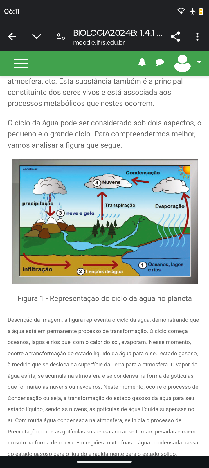 06:11 BIOLOGIA2024B: 1.4.1 V moodle.ifrs.edu.br atmosfera, etc. Esta substância também é a principal constituinte dos seres vivos e está associada aos processos metabólicos que nestes ocorrem. o ciclo da água pode ser considerado sob dois aspectos, o pequeno e o grande ciclo. Para compreendermos melhor, vamos analisar a figura que segue. Condensação 4 Nuvens precipitação Transpiração Evaporação 3 neve e gelo 1 Oceanos, lagos infiltração 2 de água e rios Figura 1 - Representação do ciclo da água no planeta Descrição da imagem: a figura representa o ciclo da água, demonstrando que a água está em permanente processo de transformação. o ciclo começa oceanos, lagos e rios que, com calor do sol, evaporam. Nesse momento, ocorre a transformação do estado líquido da água para seu estado gasoso, à medida que se desloca da superfície da Terra para a atmosfera. o vapor da água esfria, se acumula na atmosfera e se condensa na forma de que formarão as nuvens ou nevoeiros. Neste momento, ocorre o processo de Condensação ou seja, a transformação do estado gasoso da água para seu estado líquido, sendo as nuvens, as de água líquida suspensas no ar. Com muita água condensada na atmosfera, se inicia processo de Precipitação, onde as suspensas no ar se tornam pesadas e caem no solo na forma de chuva. Em regiões muito frias a água condensada passa do estado gasoso para líquido e rapidamente para estado sólido.
