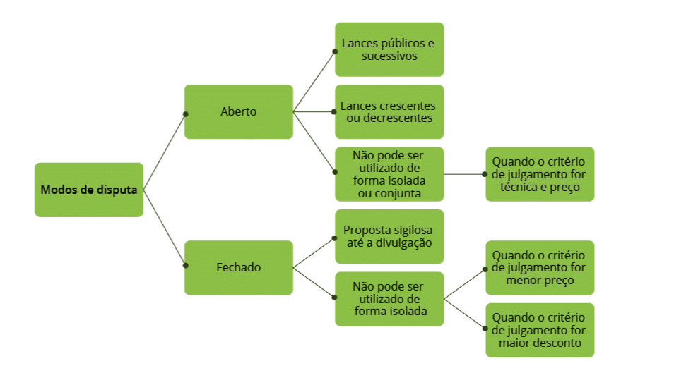 Lances públicos e sucessivos Aberto Lances crescentes ou decrescentes Não pode ser utilizado de Quando o critério forma isolada de julgamento for Modos de disputa ou conjunta técnica e preço Proposta sigilosa até a divulgação Quando o critério Fechado de julgamento for Não pode ser menor preço utilizado de forma isolada Quando o critério de julgamento for maior desconto
