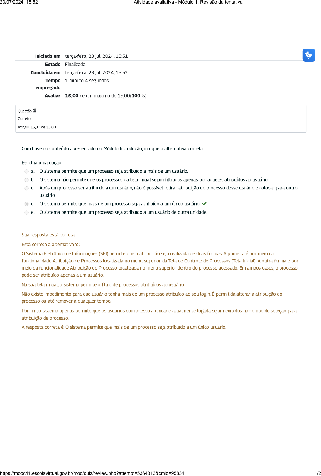 Iniciado em terça-feira, 23 jul. 2024, 15:51 Estado Finalizada Concluída em terça-feira, 23 jul. 2024, 15:52 Tempo empregado 1 minuto 4 segundos Avaliar 15,00 de um máximo de 15,00(100%) Questão 1 Correto Atingiu 15,00 de 15,00 Com base no conteúdo apresentado no Módulo Introdução, marque a alternativa correta: Escolha uma opção: a. O sistema permite que um processo seja atribuído a mais de um usuário. b. O sistema não permite que os processos da tela inicial sejam �ltrados apenas por aqueles atribuídos ao usuário. c. Após um processo ser atribuído a um usuário, não é possível retirar atribuição do processo desse usuário e colocar para outro usuário. d. O sistema permite que mais de um processo seja atribuído a um único usuário. e. O sistema permite que um processo seja atribuído a um usuário de outra unidade. Sua resposta está correta. Está correta a alternativa ‘d’. O Sistema Eletrônico de Informações (SEI) permite que a atribuição seja realizada de duas formas. A primeira é por meio da funcionalidade Atribuição de Processos localizada no menu superior da Tela de Controle de Processos (Tela Inicial). A outra forma é por meio da funcionalidade Atribuição de Processo localizada no menu superior dentro do processo acessado. Em ambos casos, o processo pode ser atribuído apenas a um usuário. Na sua tela inicial, o sistema permite o �ltro de processos atribuídos ao usuário. Não existe impedimento para que usuário tenha mais de um processo atribuído ao seu login. É permitida alterar a atribuição do processo ou até remover a qualquer tempo. Por �m, o sistema apenas permite que os usuários com acesso a unidade atualmente logada sejam exibidos na combo de seleção para atribuição de processo. A resposta correta é: O sistema permite que mais de um processo seja atribuído a um único usuário. 23/07/2024, 15:52 Atividade avaliativa - Módulo 1: Revisão da tentativa https://mooc41.escolavirtual.gov.br/mod/quiz/review.php?attempt=5364313&cmid=95834 1/2 23/07/2024, 15:52 Atividade avaliativa - Módulo 1: Revisão da tentativa https://mooc41.escolavirtual.gov.br/mod/quiz/review.php?attempt=5364313&cmid=95834 2/2