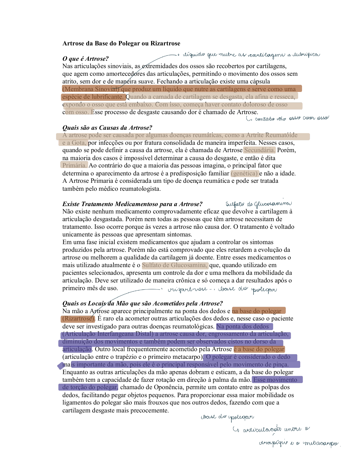 Artrose da Base do Polegar ou Rizartrose O que é Artrose? Nas articulações sinoviais, as extremidades dos ossos são recobertos por cartilagens, que agem como amortecedores das articulações, permitindo o movimento dos ossos sem atrito, sem dor e de maneira suave. Fechando a articulação existe uma cápsula (Membrana Sinovial) que produz um líquido que nutre as cartilagens e serve como uma espécie de lubrificante. Quando a camada de cartilagem se desgasta, ela afina e resseca, expondo o osso que está embaixo. Com isso, começa haver contato doloroso de osso com osso. Esse processo de desgaste causando dor é chamado de Artrose. Quais são as Causas da Artrose? A artrose pode ser causada por algumas doenças reumáticas, como a Artrite Reumatóide e a Gota, por infecções ou por fratura consolidada de maneira imperfeita. Nesses casos, quando se pode definir a causa da artrose, ela é chamada de Artrose Secundária. Porém, na maioria dos casos é impossível determinar a causa do desgaste, e então é dita Primária. Ao contrário do que a maioria das pessoas imagina, o principal fator que determina o aparecimento da artrose é a predisposição familiar (genética) e não a idade. A Artrose Primaria é considerada um tipo de doença reumática e pode ser tratada também pelo médico reumatologista. Existe Tratamento Medicamentoso para a Artrose? Não existe nenhum medicamento comprovadamente eficaz que devolve a cartilagem à articulação desgastada. Porém nem todas as pessoas que têm artrose necessitam de tratamento. Isso ocorre porque às vezes a artrose não causa dor. O tratamento é voltado unicamente às pessoas que apresentam sintomas. Em uma fase inicial existem medicamentos que ajudam a controlar os sintomas produzidos pela artrose. Porém não está comprovado que eles retardem a evolução da artrose ou melhorem a qualidade da cartilagem já doente. Entre esses medicamentos o mais utilizado atualmente é o Sulfato de Glucosamina, que, quando utilizado em pacientes selecionados, apresenta um controle da dor e uma melhora da mobilidade da articulação. Deve ser utilizado de maneira crônica e só começa a dar resultados após o primeiro mês de uso. Quais os Locais da Mão que são Acometidos pela Artrose? Na mão a Artrose aparece principalmente na ponta dos dedos e na base do polegar (Rizartrose). É raro ela acometer outras articulações dos dedos e, nesse caso o paciente deve ser investigado para outras doenças reumatológicas. Na ponta dos dedos (Articulação Interfangeana Distal) a artrose causa dor, engrossamento da articulação, diminuição dos movimentos e também podem ser observados cistos no dorso da articulação. Outro local frequentemente acometido pela Artrose é a base do polegar (articulação entre o trapézio e o primeiro metacarpo). O polegar é considerado o dedo mais importante da mão, pois ele é o principal responsável pelo movimento de pinça. Enquanto as outras articulações da mão apenas dobram e esticam, a da base do polegar também tem a capacidade de fazer rotação em direção à palma da mão. Esse movimento de torção do polegar, chamado de Oponência, permite um contato entre as polpas dos dedos, facilitando pegar objetos pequenos. Para proporcionar essa maior mobilidade os ligamentos do polegar são mais frouxos que nos outros dedos, fazendo com que a cartilagem desgaste mais precocemente. Como é a Anatomia da Base do Polegar? A articulação entre o osso Trapézio o primeiro Metacarpo tem uma forma de sela, permitindo uma maior mobilidade. Tal articulação é estabilizada por vários ligamentos, sendo os principais o Oblíquo Anterior e o Intermetacárpico (entre o primeiro e segundo metacarpos). O afrouxamento desses ligamentos, causado pela ação hormonal e pelos músculos que abrem o polegar, faz com que a articulação tenha uma tendência a deslocar para fora (subluxação), favorecendo o processo de desgaste. Quem são as Pessoas mais Atingidas pela Rizartrose? A artrose da base do polegar é mais comum em mulheres, principalmente após os 40 anos. Suspeita-se que os ligamentos nas mulheres sejam mais elásticos e frouxos, proporcionando uma maior instabilidade articular. Não está comprovado que as pessoas que utilizam de maneira exagerada, com movimentos repetitivos a base do polegar tenham uma incidência maior de artrose. O que se sabe é que a utilização em demasia desse local pode aumentar os sintomas em uma articulação já atingida pela artrose. Quais são os principais sintomas? O sintoma mais comum é a dor, localizada principalmente na porção dorsal e lateral da base do polegar. Ela piora com atividades que exijam o movimento de pinça com os dedos, como por exemplo, para abrir uma garrafa de refrigerante, uma jarra térmica, uma fechadura ou até escrever. Numa fase inicial a dor ocorre apenas num período após acordar pela manhã, porém quando a doença progride, pode haver dor no repouso e até durante a noite. Nos casos severos, a articulação fica deformada, aparecendo como uma proeminência óssea no local, que é decorrente do escorregamento do primeiro metacarpo sobre o trapézio. Quando isso ocorre, a deformidade limita o movimento do polegar e estreita o espaço dele com o indicador, dificultando o movimento de pinça. Para compensar, a articulação seguinte, entre o metacarpo e a falange aumenta a sua mobilidade podendo esticar mais que o normal, o que causa a deformidade em “Zig Zag” . Como e feito o diagnóstico? O diagnostico é clínico. A história detalhada do tipo de dor e a aparência da mão sugerem o diagnóstico. Algumas manobras que causam desconforto no local, também levam ao diagnóstico, tal como comprimir o polegar longitudinalmente, fazer movimentos de rotação ou a simples palpação da base do polegar. Exames de imagem, como os Raio-X, confirmam a suspeita clínica. Entretanto, em alguns casos, não há correlação direta entre a aparência das radiogr
