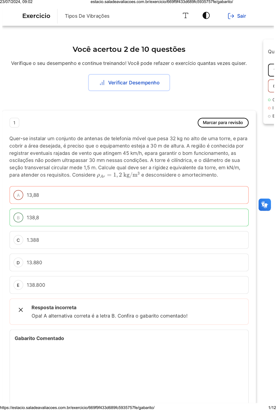 Você acertou 2 de 10 questões Verifique o seu desempenho e continue treinando! Você pode refazer o exercício quantas vezes quiser. Verificar Desempenho A B C D E 1 Marcar para revisão Quer-se instalar um conjunto de antenas de telefonia móvel que pesa 32 kg no alto de uma torre, e para cobrir a área desejada, é preciso que o equipamento esteja a 30 m de altura. A região é conhecida por registrar eventuais rajadas de vento que atingem 45 km/h, epara garantir o bom funcionamento, as oscilaçốes não podem ultrapassar 30 mm nessas condições. A torre é cilíndrica, e o diâmetro de sua seção transversal circular mede 1,5 m. Calcule qual deve ser a rigidez equivalente da torre, em kN/m, para atender os requisitos. Considere e desconsidere o amortecimento.ρAr = 1, 2 kg/m3 13,88 138,8 1.388 13.880 138.800 Resposta incorreta Opa! A alternativa correta é a letra B. Confira o gabarito comentado! Gabarito Comentado Qu C I E 1 6 Exercicio Tipos De Vibrações Sair 23/07/2024, 09:02 estacio.saladeavaliacoes.com.br/exercicio/669f9f433d689fc5935757fe/gabarito/ https://estacio.saladeavaliacoes.com.br/exercicio/669f9f433d689fc5935757fe/gabarito/ 1/12 A B A expressãoo para o cálculo da amplitude de oscilação é: A constante é igual a: Entâo: Afrequência de excitação a depende da velocidade do vento: Daí, tem-se que: A rigidez equivalente do postée, então: X = ( )[ ] ( ) = [ ]⇒ (ω/ωn) 2 = [1 − (ω/ωn) 2]( ) (ω/ωn) 2 [1 + ( )] = ( )⇒ (ω/ωn) 2 = Φ ml (ω/ωn) 2 1 − (ω/ωn) 2 Xml Φ (ω/ωn) 2 1 − (ω/ωn) 2 Xml Φ Xml Φ Xml Φ (Xml/Φ) 1 + (Xml/Φ) Φ Φ = 0, 317ρArHD3 Φ = 0, 317(1, 20)(30)(1, 50)3 = 38, 52 (ω/ωn) 2 = = 2, 43 × 10−2 ω/ωn =√2, 43 × 10−2 = 0, 156 (30 × 10−3) (32)/(38, 52) 1 + [(30 × 10−3) (32)/(38, 52)] ω = v = ( ) = 10, 47rad/s0,4π D 0,4π (1,50) 45 3,6 ω/ωn = 0, 156 ⇒ ωn = = = 65, 86rad/sω 0,156 10,47 0,156 kθq = m2ω 2 n = (32) (65, 862) = 138, 81kN/m 2 Marcar para revisão O rotor de cauda de um velho helicóptero tem cinco pás, todas de massa igual a . 0 centro de massa de cada pá dista do eixo de giro. conjunto redutor tem uma massa igual a . A cauda do helicóptero é considerada uma viga com rigidez equivalente e fração de amortecimento , e apresenta ressonância na frequência igual a . Imediatamente antes da decolagem, quando o rotor girava a , uma pá se desprende, produzindo desbalanceamento. Calcule a amplitude de oscilação, em milím etros, nessas condições. 1, 8 kg 220 mm O 34, 8 kg ζ = 0, 08 30 Hz 1080rpm 4 9 23/07/2024, 09:02 estacio.saladeavaliacoes.com.br/exercicio/669f9f433d689fc5935757fe/gabarito/ https://estacio.saladeavaliacoes.com.br/exercicio/669f9f433d689fc5935757fe/gabarito/ 2/12 C D E 15 22 34 Resposta correta Parabéns, você selecionou a alternativa correta. Confira o gabarito comentado! Gabarito Comentado A rigidez equivalente é: desbalanceamento produzido pela pá que se solta é: Afrequência natural sem a pá é: A razão entre as frequências é: A amplitude de oscilação é: kV = mcjω 2 n = (mcj−rθ + 5 ×mpa)ω2n kV = (34, 8 + 5 × 1, 8)(2π× 30)2 = 1, 56 × 106 N/m mparCM = (1, 8)(0, 22) = 0, 396 kg m ωn =√ =√ = 192, 72rad/skV mCJ−mpa 1,56×106 42 = = 0, 586ω ωn (1.080)(2π)/(60) 192,72 X = [ ] X = [ ] = 4 mm mparCM (mCj −mpa) (ω/ωn) 2 √[1 − (ω/ωn) 2] 2 + [2ζ (ω/ωn)] 2 (1, 8)(0, 220) (42) (0, 586)2 √[1 − (0, 586)2]2 + [2(0, 08)(0, 586)]2 3 Marcar para revisão Um ventilador de apresentando desbalanceamento rotativo igual a , preso a uma haste de comprimento medindo , confeccionada em liga de alumínio ( ) com e comportamento de amortecimento viscoso com , quando gira a uma velocidadede 800 rpm émostrado na figura abaixo. Calcule qual deves er o valor da máxima velocidade de operação em rpm para que a amplitude de oscilação do ventilador fique abaixo de . Desconsidere o amortecimento viscoso. 30 kg 0, 18 kg m 1, 2 m E = 70GPa I = 2, 2 × 10−6 m4 ζ = 0, 07 2 mm 23/07/2024, 09:02 estacio.saladeavaliacoes.com.br/exercicio/669f9f433d689fc5935757fe/gabarito/ https://estacio.saladeavaliacoes.com.br/exercicio/669f9f433d689fc5935757fe/gabarito/ 3/12 A B C D E 320 450 580 600 900 Resposta incorreta Opa! A alternativa correta é a letra B. Confira o gabarito comentado! Gabarito Comentado Substituindo na expressão da amplitude de oscilação, tem-se: Sendo φ = ω/ωn ∈ H = ( ) k = = = 267, 36 × 103 N/m ωn =√ =√ = 94, 4rad/s m0 m 3EI L3 3 (70 × 109) (2, 2 × 10−6) 1, 23 k m 267, 36 × 103 30 X = ( ) = H ⇒ φ2 =m0e m (ω/ωn) 2 1−(ω/ωn) 2 φ2 1−φ2 X X+H φ2 = = 0, 25 ⇒ φ = 0, 5 φ = ω/ωn ⇒ ω = φωn = 0, 5ωn = (0, 5)(94, 4) = 47, 2rad/s N = ω = 450rpm 2 × 10−3 (2 × 10−3)+ ( )0,18 30 60 2π 4 Marcar para revisão Um motor elétrico de desbalanceado, opera a em um suporte de comprimento igual a , onde , conforme a figura abaixo. Calcule a amplitude máxima de oscilação, em milímetros, sabendo que o suporte é considerado uma viga bi engastada com e . A massa de desbalanceamento do motor é g, er . 92 kg N = 1.800rpm 4, 8 m L1 = 2L2 I = 2, 0 × 10−6 m4 E = 72GPa m = 18 = 25, 0 × 10−2 m 23/07/2024, 09:02 estacio.saladeavaliacoes.com.br/exercicio/669f9f433d689fc5935757fe/gabarito/ https://estacio.saladeavaliacoes.com.br/exercicio/669f9f433d689fc5935757fe/gabarito/ 4/12 A B C D E 15 1,5 0,15 0,015 0,0015 Resposta incorreta Opa! A alternativa correta é a letra D. Confira o gabarito comentado! Gabarito Comentado A rigidez equivalente é: Afrequência natural é: A frequência de operaçăo é: A amplitude de oscilação é: kV = = = = EI kV = (72 × 109) (2 × 10−6) = 356kN/m 3EIL3 L3 1L 3 2 3EIL3 (2L/3)3(L/3)3 3EIL3 (8/27)(1/27)(L)6 2.187 8L3 2.187 8 (4, 83) ωn =√ =√ = 62, 2rad/s kV M 356×103 92 ω = = 30rad/s1.800 60 x = ( )[ ] x = [ ] = 1,5× 10−2mm mr M (ω/ωn) 2 1 − (ω/ωn) 2 (18 × 10−3) (25, 0 × 10−2) 92 (30/62, 2)2 1 − (30/62, 2)2 23/07/2024, 09:02 estacio.saladeavaliacoes.co