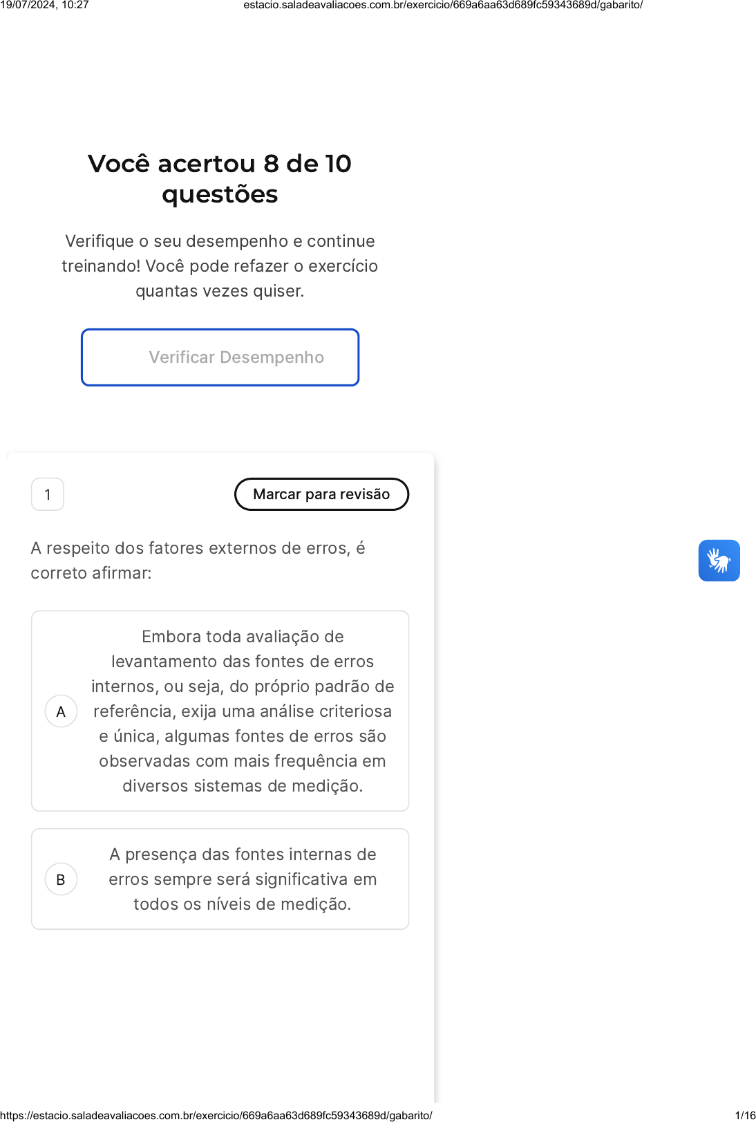Você acertou 8 de 10 questões Verifique o seu desempenho e continue treinando! Você pode refazer o exercício quantas vezes quiser. Verificar Desempenho A B 1 Marcar para revisão A respeito dos fatores externos de erros, é correto afirmar: Embora toda avaliação de levantamento das fontes de erros internos, ou seja, do próprio padrão de referência, exija uma análise criteriosa e única, algumas fontes de erros são observadas com mais frequência em diversos sistemas de medição. A presença das fontes internas de erros sempre será significativa em todos os níveis de medição. 19/07/2024, 10:27 estacio.saladeavaliacoes.com.br/exercicio/669a6aa63d689fc59343689d/gabarito/ https://estacio.saladeavaliacoes.com.br/exercicio/669a6aa63d689fc59343689d/gabarito/ 1/16 C D E O efeito das fontes internas de erros deve ser, pelo menos, considerado ao estimar a incerteza total da medição, em função de sua participação, em maior ou menor grau. Algumas fontes de erros são observadas com mais frequência em diversos sistemas de medição, como o erro de paralaxe. As fontes internas de erro refletem todas as possíveis falhas internas ao laboratório, como operador, padrões e umidade. Resposta correta Parabéns, você selecionou a alternativa correta. Confira o gabarito comentado! Gabarito Comentado A alternativa correta é a letra C. Ela afirma que o efeito das fontes internas de erros deve ser, pelo menos, considerado ao estimar a incerteza total da medição, em função de sua participação, em maior ou menor grau. Isso significa que, ao realizar uma medição, é importante levar em conta os possíveis erros internos que podem ocorrer. Esses erros podem variar em grau de influência na medição total, mas, independentemente disso, eles devem ser considerados para garantir a precisão e a confiabilidade dos resultados. 19/07/2024, 10:27 estacio.saladeavaliacoes.com.br/exercicio/669a6aa63d689fc59343689d/gabarito/ https://estacio.saladeavaliacoes.com.br/exercicio/669a6aa63d689fc59343689d/gabarito/ 2/16 A B C D E 2 Marcar para revisão Quanto à deriva, é correto afirmar: É um efeito que deve ser considerado em relação ao histórico apenas das calibrações dos padrões de referência. É a propriedade decorrente da variação lenta, contínua ou incremental, das características metrológicas atribuídas. É necessário levar em consideração a provável mudança no valor de incerteza declarado do padrão de referência, desde sua fabricação. A deriva pode ser estimada, a partir dos resultados de sucessivas calibrações dos padrões de chão de fábrica. A deriva, igualmente à histerese, ocorre apenas em instrumentos mecânicos. Resposta correta Parabéns, você selecionou a alternativa correta. Confira o gabarito comentado! Gabarito Comentado A alternativa correta é a B, que define a deriva como a propriedade decorrente da variação lenta, contínua ou incremental, Questão 3 de 10 Corretas �8� Incorretas �2� Em branco �0� 1 2 3 4 5 6 7 8 9 10 Exercicio Erro De Medição Sair 19/07/2024, 10:27 estacio.saladeavaliacoes.com.br/exercicio/669a6aa63d689fc59343689d/gabarito/ https://estacio.saladeavaliacoes.com.br/exercicio/669a6aa63d689fc59343689d/gabarito/ 3/16 A B das características metrológicas atribuídas. Isso significa que a deriva é uma mudança gradual e contínua nas características metrológicas de um instrumento ou sistema, que pode ocorrer ao longo do tempo devido a vários fatores, como desgaste, envelhecimento, uso contínuo, entre outros. Essa variação pode afetar a precisão e a confiabilidade das medições realizadas pelo instrumento ou sistema. 3 Marcar para revisão Indicar o valor mais provável, estatisticamente, significa utilizar uma medida de tendência destes resultados. Marque a opção correta a respeito de medidas de tendência: As medidas de tendência mais comuns são: média, mediana, moda e desvio padrão da média. A média é uma medida de tendência central de uma distribuição de valores que ordena um grupo de dados, separando igualitariamente uma amostra, população ou distribuição de probabilidade em dois subconjuntos e cujo valor é igual ao valor do termo que divide os dois subconjuntos de dados. 19/07/2024, 10:27 estacio.saladeavaliacoes.com.br/exercicio/669a6aa63d689fc59343689d/gabarito/ https://estacio.saladeavaliacoes.com.br/exercicio/669a6aa63d689fc59343689d/gabarito/ 4/16 C D E A mediana é o valor que aponta para onde mais se concentram os dados de uma distribuição ou o ponto de equilíbrio das frequências de determinado processo estatístico. A moda é o valor que se apresenta com mais frequência em uma dada distribuição de valores. A variância é o valor que detém o maior número de observações, ou ainda o valor que ocorre com mais frequência em um conjunto de dados, sendo o valor mais comum entre eles. Resposta correta Parabéns, você selecionou a alternativa correta. Confira o gabarito comentado! Gabarito Comentado A alternativa correta é a letra D, que afirma que a moda é o valor que se apresenta com mais frequência em uma dada distribuição de valores. Isso significa que, em um conjunto de dados, a moda é o valor que aparece com maior frequência. Por exemplo, se tivermos os números 1, 2, 2, 3, 4, a moda será 2, pois é o número que aparece mais vezes. Portanto, a moda é uma medida de tendência central que indica o valor mais comum em um conjunto de dados. 19/07/2024, 10:27 estacio.saladeavaliacoes.com.br/exercicio/669a6aa63d689fc59343689d/gabarito/ https://estacio.saladeavaliacoes.com.br/exercicio/669a6aa63d689fc59343689d/gabarito/ 5/16 A B C D E 4 Marcar para revisão A respeito de fatores de erros externos e internos, é correto afirmar: Os sistemas de medição possuem correções e os erros podem decorrer exclusivamente do operador. O comportamento metrológico do sistema de medição é influenciado por perturbações exclusivamente internas. Fatores externos podem prov