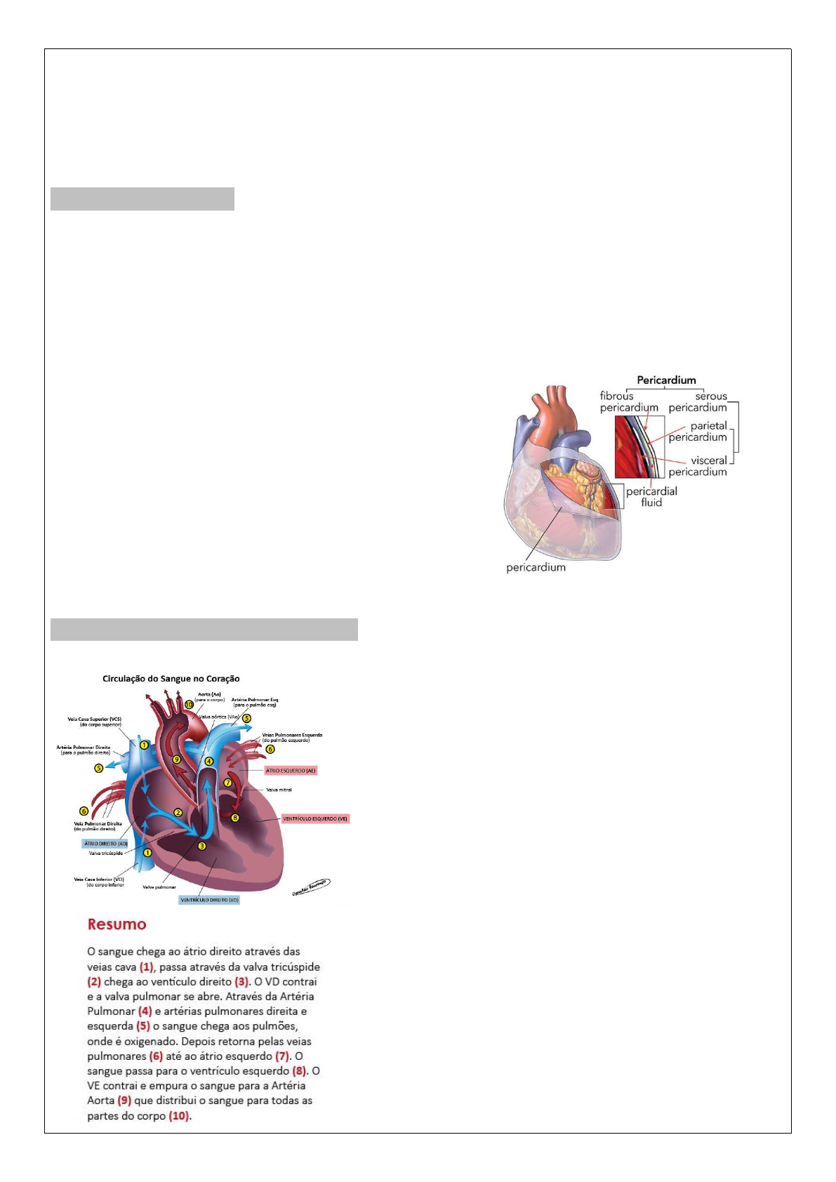 Caso 3 Fisiologia do sist. cardiovascular Principais funções Transporte de nutrientes absorvidos pelo TGI para o resto do corpo. Transporte de gases (O2 e CO2, principalmente). Transporte de hormônios. Regulação da temperatura corporal, transferindo calor das partes mais internas para a superfície, onde o mesmo pode ser dissipado. Defesa contra agentes patógenos ao auxiliar o transporte das células de defesa, permitindo a ação do sistema imune e promovendo coagulação sanguínea. Transporte de dejetos metabólicos para excreção. Anatomofisiologia do coração O coração não está fixo à cavidade toráxica, mas trabalha livre deslizando entre duas membranas de tecido fibroso-seroso chamada de pericárdio. → Há o pericárdio fibroso e o seroso, sendo este último dividido em parietal (mais externo, maior contato com o líquido pericárdico) e visceral (reveste externamente o coração, também chamado de epicárdio). Entre os dois pericárdios encontra-se o líquido pericárdico, que tem a função de lubrificar as faces do coração para reduzir o atrito durante os movimentos. O coração é suspenso na cavidade toráxica pelo conjunto de vasos que chegam ou saem. Abaixo do epicárdio, há omiocárdio, cuja principal função é a contração. Logo, vem a última camada do coração, o endocárdio, que reveste internamente as câmaras cardíacas. → O suprimento sanguíneo para o próprio coração não é feito diretamente pelas câmaras cardíacas através do endocárdio, uma vez que apenas uma parte minúscula é feita dessa forma. A grande maioria é feita por um sistema de vasos especiais chamado de circulação coronariana. Fases do potencial de ação cardíaco Fase 0 (despolarização): abertura dos canais rápidos de sódio e influxo de sódio, tornando o potencial de membrana mais positivo. Fase 1 (repolarização inicial): fechamento dos canais rápidos de sódio e efluxo de potássio pelos canais abertos de potássio. Fase 2 (platô): abertura dos canais de cálcio e fechamento dos canais rápidos de potássio. Fase 3 (repolarização rápida): fechamento dos canais de cálcio e abertura dos canais lentos de potássio. Fase 4 (potencial de membrana em repouso): o p. de membrana volta a ser negativo e as correntes de influxo e efluxo se igualam. A difusão de cálcio para dentro das miofibrilas promove a contração muscular. Ciclo cardíaco Cada batimento começa com um potencial de ação espontâneo que é iniciado no nó sinoatrial, localizado no átrio direito próximo à abertura da veia cava superior. Há um atraso de cerca de 0,13 segundos no nó AV que possibilita a contração dos átrios antes da contração dos ventrículos. Nó sinoatrial→ ramos internodais→ nó atrioventricular→ feixe de His → ramos do feixe de His→ fibras de Purkinje. 1. Durante a sístole, as valvas AV estão fechadas e os átrios enchem-se de sangue. 2. No início da diástole, há o relaxamento isovolumétrico ventricular. Quando a pressão AV diminui abaixo da pressão atrial, as valvas AV se abrem, e a pressão mais elevada nos átrios + força da gravidade empurra o sangue para os ventrículos. → 80% do enchimento ventricular é pela gravidade, e 20% pela contração dos átrios. 3. No início da sístole, ocorre contração ventricular. As valvas AV se fecham e a pressão começa a aumentar no ventrículo, mas sem ejeção de sangue, caracterizando o período de contração isovolumétrica. 4. Quando a pressão ventricular excede a pressão aórtica (80 mmHg) ou a arterial pulmonar (8 mmHg), as valvas aórtica e pulmonar se abrem, respectivamente. → Esse fluxo de saída ventricular é chamado de período de ejeção. 5. Após o período de ejeção rápida e lenta, as pressões ventriculares caem abaixo da pressão aórtica e pulmonar, logo, as valvas aórtica e pulmonar se fecham. As fases do ciclo cardíaco são: período de enchimento (I), período de contração isovolumétrica (II), período de ejeção (III) e período de relaxamento isovolumétrico. Embora os ventrículos direito e esquerdo ajam como duas bombas separadas que ejetam simultaneamente volumes iguais de sangue, o lado direito tem uma carga de trabalho muito menor. → Ele bombeia o sangue a uma curta distância para os pulmões a uma pressão inferior, e a resistência ao fluxo sanguíneo é pequena. → O ventrículo esquerdo bombeia sangue por grandes distâncias a todas as outras partes do corpo com uma pressão maior, e a resistência ao fluxo sanguíneo é maior. Mecanismo de Frank-Starling: dentro dos limites fisiológicos, o coração bombeia todo o sangue que retorna a ele sem deixar acumular nenhum excesso nas veias. A distensão da parede da musculatura cardíaca causa um aumento na força de contração do órgão. SNS: sua estimulação aumenta a força de contração do coração e a FC. Esses efeitos são mediados por abertura de canais de cálcio devido a ativação de receptores beta-adrenérgicos. SNP: sua estimulação reduz a FC, mas tem pouco efeito sobre a força de contração do coração. Isso ocorre porque as fibras parassimpáticas estão mais presentes nos átrios do que nos ventrículos. O mecanismo ocorre quando a ACh liberada age sobre os receptores muscarínicos cardíacos, aumentando a entrada de potássio e causando hiperpolarização. Outros mecanismos: químicos (como o pH), físicos (o aumento da temperatura causa aumento da força e FC. → A cada 1 grau de aumento = a FC aumenta em 18 batimentos. Insuficiência cardíaca É definida como uma síndrome complexa, resultante de qualquer distúrbio funcional ou estrutural do coração que reduza a capacidade de bombeamento do coração. Pode ocorrer em qualquer faixa etária, mas afeta primariamente idosos. Classificação As diretrizes do ACA/AHA classificam a IC em quatro estágios, de acordo com a progressão da doença: A: risco alto de desenvolver IC, mas sem anormalidades estruturais identificadas