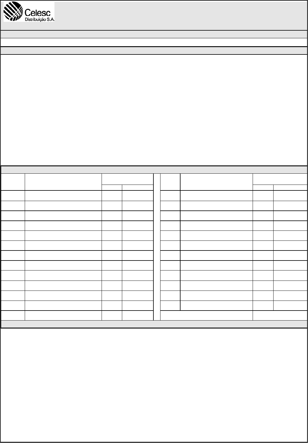 DECLARAÇÃO DE CARGA INSTALADA NO GRUPO B 1 - DADOS DA SOLICITAÇÃO Data: ____/____/____ Nº da UC: ____________________Protocolo n°:___________________LOS:_________ 2 - DADOS DA UNIDADE CONSUMIDORA (UC) Nome: ............................................................................................................................................................................. RG: .......................................................................CPF/CNPJ:........................................................................................ Endereço: ......................................................................................................................................... Nº: ....................... Bairro/Complemento:............................................................................... Cidade:.......................................................... Fone Res/Coml. (........) ......................................................... Fone Celular:(.........)........................................................ E-mail: ............................................................................................................................................................................. Atividade Principal:..................................................................................................... Código de Atividade: .................. Classe: Residencial � Comercial � Industrial � Rural � Área Construída: .....................................m2 Tipo de Ligação: Monofásico � Bifásico � Trifásico � Rural 440/220V � Uso Coletivo � Tipo de Ramal de Ligação: Aéreo � Subterrâneo � Misto � 3 - CARGA INSTALADA Quant TIPO DO APARELHO CARGA (W/CV) Quant TIPO DO APARELHO CARGA (W/CV) Unit Total (W) Unit Total (W) Chuveiro Condicionador de Ar Condicionador de Ar Geladeira Freezer Lavadora de roupas Ferro de passar roupa Forno Elétrico Microondas Lavadora de louças Lâmpadas W Lâmpadas W TOTAL (W) 4 - DADOS DO PADRÃO DE ENTRADA Carga Total Instalada: ............................kW - Fator Demanda ...............% - Demanda Estimada: .....................kW Ramal de Ligação Aéreo (seção).................mm2 - Comprimento:...............m - Disjuntor: .....................................A Material (Ramal de Ligação Aéreo): Alumínio Multiplexado ( ) - Cobre Multiplexado ( ) – Cobre Singelo ( ) Fornecedor do Ramal de Ligação Aéreo: ( ) Celesc ( ) Consumidor – Obra: Provisória ( ) Definitiva ( ) Ramal de Entrada/Saída de Aéreo (seção):..............mm2 - Subterrâneo: ..............mm² - Aterramento ...............mm2 Ramal de Carga aéreo:.......................mm2 -- Material: Alumínio Multiplex (...) - Cobre (...)Multiplex (...) Singelo (...) Responsável pela Informação:..................................................................................CPF ........................................... Fones de Contato: Cel (.....) ...........................................Coml. ....................................Res......................................... Recebido por:...........................................................................Matrícula:......................................Data:......./......../......