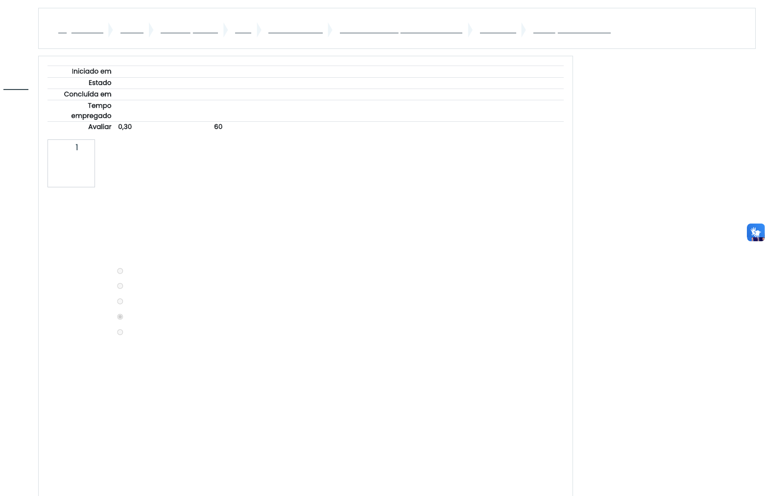 Página inicial Cursos GRADUAÇÃO EAD 2024 Módulo 3 - 2024 2024/3 - Fisioterapia Neurofuncional UNIDADE IV Avaliação - Unidade IV Questão 1 Completo Atingiu 0,05 de 0,05 Iniciado em quarta, 24 jul 2024, 09:06 Estado Finalizada Concluída em quarta, 24 jul 2024, 09:43 Tempo empregado 36 minutos 52 segundos Avaliar 0,30 de um máximo de 0,50(60%) A Fisioterapia atua na prevenção e na recuperação de pacientes com quaisquer diagnósticos neurológicos. Diante disso, responda VERDADEIRO ou FALSO. ( ) A fisioterapia busca o desenvolvimento de atividades, permitindo a reintegração familiar e social dentro de suas limitações físicas e funcionais. ( ) A reabilitação fisioterapêutica inicia-se na fase crônica da lesão. ( ) O principal objetivo fisioterapêutico é a independência funcional, reintegração na sociedade, prevenindo deformidades e complicações, melhora da função muscular remanescente e função respiratória, treino de transferências, trocas de posturas e manuseio da cadeira de rodas, treino de equilíbrio, ortostatismo e se possível treino de marcha. ( ) O tratamento fisioterapêutico previne úlceras de pressão, deformidades articulares, esvaziamento vesical e intestinal e distúrbios vasomotores. a. V, F, F, V. b. F, F, V, V. c. V, V, V, V. d. V, F, V, V. e. F, V, V, F. A resposta correta é: V, F, V, V. https://ambienteonline.uninga.br/ https://ambienteonline.uninga.br/course/index.php https://ambienteonline.uninga.br/course/index.php?categoryid=1 https://ambienteonline.uninga.br/course/index.php?categoryid=1535 https://ambienteonline.uninga.br/course/index.php?categoryid=1764 https://ambienteonline.uninga.br/course/view.php?id=28089 https://ambienteonline.uninga.br/course/view.php?id=28089§ion=8 https://ambienteonline.uninga.br/mod/quiz/view.php?id=766837 javascript:void(0); https://ambienteonline.uninga.br/user/index.php?id=28089 https://ambienteonline.uninga.br/grade/report/index.php?id=28089 https://ambienteonline.uninga.br/course/view.php?id=28089&stopjsnav=1 https://ambienteonline.uninga.br/ https://ambienteonline.uninga.br/my/ https://ambienteonline.uninga.br/calendar/view.php?view=month&course=28089 javascript:void(0); https://ambienteonline.uninga.br/user/files.php https://ambienteonline.uninga.br/my/ Questão 2 Completo Atingiu 0,00 de 0,05 Questão 3 Completo Atingiu 0,05 de 0,05 Analise as afirmações a seguir e responda: “O método Pilates consiste em uma série de exercícios feitos no solo (Mat) ou em aparelhos apropriados e tem como base cinco princípios: concentração, controle, centralização, respiração e fluidez”. Portanto “Os benefícios do Pilates em pacientes neurológicos, são melhora da qualidade de vida do paciente neurológico auxilia na prevenção de doenças crônicas, além de proporcionar melhora nas funções respiratória, hemodinâmica e motora”. a. As duas afirmações estão corretas, mas não se justificam. b. A primeira afirmação está correta e a segunda incorreta. c. As duas afirmações estão incorretas. d. As duas afirmações estão corretas, e a segunda justifica a primeira. e. A primeira afirmação está incorreta e a segunda correta. A resposta correta é: A primeira afirmação está incorreta e a segunda correta. As transferências são o método de mover um paciente de uma superfície para outra. Sabendo disso, quais as vantagens da técnica de transferência de paciente? a. Somente auxilia o fisioterapeuta. b. É um fator de segurança para o paciente e para o fisioterapeuta. c. É importante pois o paciente necessita ficar na posição sentada. d. Todas alternativas estão corretas. e. Previne úlceras de decúbito no paciente. A resposta correta é: É um fator de segurança para o paciente e para o fisioterapeuta. javascript:void(0); https://ambienteonline.uninga.br/user/index.php?id=28089 https://ambienteonline.uninga.br/grade/report/index.php?id=28089 https://ambienteonline.uninga.br/course/view.php?id=28089&stopjsnav=1 https://ambienteonline.uninga.br/ https://ambienteonline.uninga.br/my/ https://ambienteonline.uninga.br/calendar/view.php?view=month&course=28089 javascript:void(0); https://ambienteonline.uninga.br/user/files.php https://ambienteonline.uninga.br/my/ Questão 4 Completo Atingiu 0,05 de 0,05 Questão 5 Completo Atingiu 0,00 de 0,05 Com base na técnica de Maitland, responda: I - movimento grande no meio do arco em ritmo lento sem resistência, estimulando o retorno venoso e linfático. II - movimento por todo arco com oscilação mais rápida que o grau I e II, causando os mesmos efeitos do grau II acrescentado estresses nos tecidos encurtados por aderências. III - micromovimentos no final do arco que promovem estresses teciduais. IV - micromovimentos no começo do arco de movimento em ritmo lento, livre da resistência de tecidos, levando informações neurológicas através de mecanorreceptores. ( ) grau I. ( ) grau II. ( ) grau III. ( ) grau IV. a. I, III, IV, II. b. IV, I, II, III. c. II, IV, I, III. d. I, II, III, IV. e. III, II, I, IV. A resposta correta é: IV, I, II, III. Correlacione o tratamento com sua função: I - Facilitação Neuromuscular Proprioceptiva (FNP). II - Alongamentos e fortalecimento muscular (global). III - Neuroestimulação Elétrica Transcutânea (TENS). IV - Alongamento, fortalecimento muscular, facilitação neuromuscular proprioceptiva. ( ) Ganho significante de força e alongamento muscular e maior facilidade em realizar suas atividades cotidianas. ( ) Eficaz para adequação de tônus em pacientes com lesão medular e espasticidade. ( ) Favorece a reaquisição dos padrões motores e proporciona maior independência e qualidade de vida. ( ) Aumento de força muscular, redução da hipotensão postural e melhora a locomoção em cadeiras de rodas. a. I, III, IV, II. b. II, I, III, IV. c. IV, I, II, III. d. IV, II, I, III. e. II, III, I, IV. A resposta correta é: II, III, I, IV. javascript:void(0); https://ambienteonline.uninga.