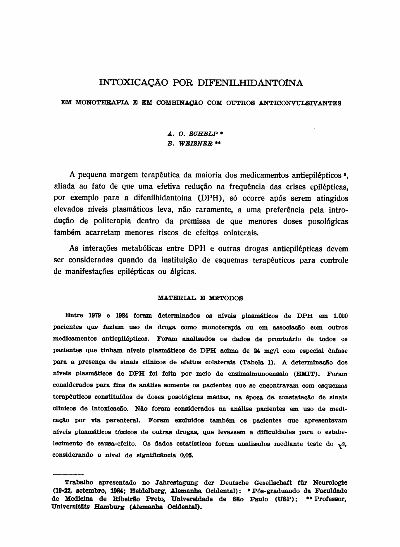 INTOXICAÇÃO POR DIFENILHIDANTOÍNA EM MONOTERAPIA E EM COMBINAÇÃO COM OUTROS ANTICONVULSIVANTES A. O. SCHELP* B. WEISNER ** A pequena margem terapêutica da maioria dos medicamentos antiepilépticos5, aliada ao fato de que uma efetiva redução na freqüência das crises epilépticas, por exemplo para a difenilhidantoína (DPH), só ocorre após serem atingidos elevados níveis plasmáticos leva, não raramente, a uma preferência pela intro dução de politerapia dentro da premissa de que menores doses posológicas também acarretam menores riscos de efeitos colaterais. As interações metabólicas entre DPH e outras drogas antiepilépticas devem ser consideradas quando da instituição de esquemas terapêuticos para controle de manifestações epilépticas ou álgicas. MATERIAL. E MÉTODOS Entre 1979 e 1984 foram determinados os níveis plasmáticos de DPH em 1.0Ü0 pacientes que faziam uso da droga como monoterapia ou em associação com outros medicamentos antiepilépticos. Foram analisados os dados de prontuário de todos os pacientes que tinham níveis plasmáticos de DPH acima de 24 mg/l com especial ênfase para a presença de sinais clínicos de efeitos colaterais (Tabela 1). A determinação dos níveis plasmáticos de DPH foi feita por meio de enzimaimunoensaio (EMIT). Foram considerados para fins de análise somente os pacientes que se encontravam com esquemas terapêuticos constituídos de doses posológicas médias, na época da constatação de sinais clínicos de intoxicação. Não foram considerados na análise pacientes em uso de medi cação por via parenteral. Foram excluídos também os pacientes que apresentavam níveis plasmáticos tóxicos de outras drogas, que levassem a dificuldades para o estabe lecimento de causa-efeito. Os dados estatísticos foram analisados mediante teste do ^ 2 , considerando o nível de significância 0,05. Trabalho apresentado no Jahrestagung der Deutsche Gesellschaft für Neurologie (19-22, setembro, 1984; Heidelberg, Alemanha Ocidental): *Pós-graduando da Faculdade de Medicina de Ribeirão Preto, Universidade de São Paulo (USP); ** Professor, Universitäts Hamburg (Alemanha Ocidental). RESULTADOS Os níveis plasmáticos de DPH se encontram com mais freqüência acima daqueles considerados como terapêuticos naqueles pacientes submetidos a politerapia (.19%) em comparação àqueles em uso de DPH como droga única (3%). Na tabela 1 é apresentada a freqüência em que foram determinados níveis séricos elevados ( > 24 mg/l) de DPH em combinação com uma ou mais drogas anticonvulsi- vantes. Foi estabelecido um percentual que variou entre 5 e 9%, excetuando-se as combinações com clonazepan ou compostas de mais de três medicamentos que, devido ao pequeno número, não apresentaram significância (p > 0,05). Dos pacientes, 52 apresentaram níveis plasmáticos de DPH acima de 24 mg/l sob monoterapia ou polite rapia. Dentre os pacientes em uso de DPH como medicamento único, três (14%) apresentaram efeitos colaterais enquanto que sob politerapia 15 pacientes (50%) apre sentaram efeitos não desejados (Fig. 1). As concentrações plasmáticas médias de DPH não se diferenciaram significativamente nestes grupos (Tabela 2). Na tabela 3 são apresentados os efeitos colaterais registrados, com os respectivos percentuais. Não foi constatado significativo predomínio de efeitos colaterais para qualquer das associações de DPH com uma ou mais drogas antiepilépticas (p > 0,05). COMENTÁRIOS Em 1.000 pacientes tratados com DPH foi determinado o percentual de efeitos colaterais observados naqueles pacientes que tinham níveis plasmáticos acima dos níveis médios 1 . Observaram-se com maior freqüência (Tabela 1) níveis plasmáticos elevados entre os pacientes submetidos a politerapia com níveis posológicos médios de DPH (300mg/dia). Estão relativamente bem estabelecidas as interferências mútuas que se observam na farmacocinética das diferentes drogas antiepilépticas quando utili zadas em associação 3. A indução enzimática do sistema microssomal, parti cularmente pela carbamazepina, não parece ter influência sobre os níveis plasmáticos de DPH 2 , o que justifica o elevado percentual de casos com níveis plasmáticos acima de 24mg/l nos pacientes submetidos a esta associação terapêutica. A distribuição percentual dos efeitos colaterais é semelhante à constatada em outros estudos 6. O percentual foi consideravelmente mais elevado no grupo de pacientes sob politerapia, apesar dos níveis plasmáticos de DPH não estarem significativamente mais elevados neste grupo em comparação àqueles observados nos pacientes sob monoterapia, o que demonstra claramente a importância de outros fatores, como por exemplo a determinação das frações livres dos medicamentos. Os dados fortalecem a premissa de que devemos pr imeiramente esgotar todas as tentativas de controle com uma única droga, antes de ser tentada utilização de um segundo medicamento 5 » 6 . RESUMO Entre julho de 1979 e julho de 1984 foram determinadas as concentrações plasmáticas de difenilhidantoína de 1.000 pacientes que faziam uso do medica mento como única droga ou em associação com outros anticonvulsivantes. Sob monoterapia encontramos um percentual de 3,3% com níveis séricos acima de 24mg/l e 0,4% com sinais clínicos de efeitos colaterais. Entre os pacientes em utilização de associação medicamentosa foi determinada elevação dos níveis séricos de difenilhidantoína em 9 ,1% dos pacientes e sinais clínicos de intoxi cação em 4,6%. Não foi constatado predomínio de qualquer das diferentes associações medicamentosas na frequência de sinais clínicos de intoxicação. Os dados reforçam a assertiva de que devemos esgotar todas as possibilidades de controle com uma única droga, antes de tentar a utilização de um segundo medicamento. SUMMARY Diphenyldantoin intoxication in monotherapy and in association with other antiepileptic