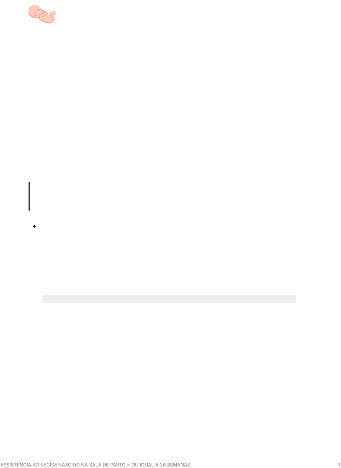 ASSISTÊNCIA AO RECÉM NASCIDO NA SALA DE PARTO OU IGUAL A 34 SEMANAS 1 ASSISTÊNCIA AO RECÉM NASCIDO NA SALA DE PARTO > OU IGUAL A 34 SEMANAS REANIMAÇÃO NEONATAL O período neonatal é de extrema vulnerabilidade para a criança que está completando os muitos ajustes fisiológicos necessários para a existência extra útero. O atendimento inadequado leva ao quadro de asfixia neonatal com sequelas neurológicas. PREPARO PARA A ASSISTÊNCIA Considerando-se a frequência de RNs que precisam de algum procedimento de reanimação e a rapidez com que tais manobras devem ser iniciadas, é fundamental que pelo menos um profissional de saúde capaz de realizar os passo iniciais e a ventilação com pressão positiva VPP por meio de máscara facial esteja presente em todo o parto. OBS.: A ÚNICA RESPONSABILIDADE DESSE PROFISSIONAL DEVE SER O ATENDIMENTO AO RN. � ANAMNESE MATERNA Ao identificar fatores de risco perinatais, podem ser necessários 23 profissionais treinados, dos quais pelo menos um precisa ser médico apto a intubar e indicar massagem cardíaca e medicações. No caso de gemelares, dispor de equipe própria para cada criança. ASSISTÊNCIA AO RECÉM NASCIDO NA SALA DE PARTO OU IGUAL A 34 SEMANAS 2 � VERIFICAR MATERIAL Todo material necessário para a reanimação deve ser preparado, testado e estar disponível em local de fácil acesso, antes do nascimento, incluindo equipamentos e material para avaliação do paciente, manutenção da temperatura, aspiração de vias aéreas, ventilação e administração de medicações. Logo após o nascimento, a equipe deve ficar voltada exclusivamente aos cuidados do RN, sem perder tempo ou dispensar a atenção com a busca e/ou o ajuste do material. Temperatura da sala de parto: 2325°C Normotermia do RN 36,5 37,5°C � BRIEFING DA EQUIPE Consiste em uma rápida reunião entre os membros da equipe para planejar o atendimento neonatal, antes do nascimento, realizando a divisão das funções de cada membro da equipe, deixando claro a quem caberá o papel de liderança dos procedimento de reanimação. PERGUNTAS INICIAIS AVALIAÇÃO DA VITALIDADE ASSISTÊNCIA AO RECÉM NASCIDO NA SALA DE PARTO OU IGUAL A 34 SEMANAS 3 Gestação 34 semanas? Respirando ou chorando? Tônus muscular em flexão? Logo após a extração completa do produto conceptual do útero materno, se o RN semanas começa a respirar ou chorar e apresentar tônus muscular em flexão, considera-se que sua vitalidade está adequada, independentemente do aspecto do líquido amniótico, e deve continuar em contato pele-a-pele junto da parturiente depois do clampeamento do cordão umbilical. Na sala de parto, enquanto o RN está unto à parturiente, prover calor, assegurar as vias aéreas pérvias, avaliar a vitalidade de maneira continuada e estimular o início da amamentação. BOA VITALIDADE Logo após a extração completa do produto conceptual do útero materno, se o RN 34 semanas começa a respirar ou chorar e apresentar tônus muscular em flexão, considera-se que sua vitalidade está adequada, independentemente do aspecto do líquido amniótico. SEM BOA VITALIDADE No RN que não está com boa vitalidade ao nascer, sugere-se fazer estímulo tátil no dorso, de modo delicado e no máximo duas vezes, para ajudar a iniciar a respiração antes do clampeamento imediato do cordão. CLAMPEAMENTO DO CORDÃO No RN com boa vitalidade, recomenda-se clampear o cordão no Em RN que não começa a respirar logo após o nascimento, o clampeamento tardio do cordão ASSISTÊNCIA AO RECÉM NASCIDO NA SALA DE PARTO OU IGUAL A 34 SEMANAS 4 mínimo 60 segundos após o nascimento. Enquanto aguarda-se para clampear e cortar o cordão, o neonato pode ser posicionado no abdome ou tórax materno, tomando-se cuidado para evitar a perda da temperatura corporal Assim: Mínimo de 60 segundos Colo da mãe retarda o início dos procedimentos de reanimação, em espacial da VPP. Assim: Estímulo tátil no dorso Clampeamento imediato Mesa de reanimação 💡 PARA O RN DE 34 SEMANAS BOA VITALIDADE Mínimo de 30 segundos para clampeamento do cordão Mesa de reanimação SEM BOA VITALIDADE → Estímulo tátil no dorso Clampeamento imediato Mesa de reanimação OBS. Clampeamento tardio do cordão → é benéfico em relação à concentração de hemoglobina nas primeiras 24 horas, embora possa levar a frequência de policitemia, o que implica na necessidade de cuidado quanto ao aparecimento e acompanhamento da hiperbilirrubinemia indireta na 1º semana de vida. Aumenta a concentração de ferritina nos primeiro 3 a 6 meses, podendo reduzir a anemia do lactente, com ASSISTÊNCIA AO RECÉM NASCIDO NA SALA DE PARTO OU IGUAL A 34 SEMANAS 5 repercussões no desenvolvimento infantil. O clampeamento do cordão promove o aumento da resistência vascular sistêmica. OBS.: Ordenha do cordão não é recomendada Situações especiais: HIV CLAMPEAMENTO IMEDIATO DO CORDÃO recomendação do Minstério da saúde. OMS É possível aguardar o clampeamento do cordão em caso de possível infecção perinatal ao HIV DPP (comprometimento da circulação placentária) → não é mais bem definido quanto tempo se aguarda para realizar o clampeamento nessa situação. PASSOS INICIAIS Os passos iniciais compreendem ações para manutenção da normotermia e das vias aéreas pérvias e devem ser executados em, no máximo 30 segundos, seguidos da avaliação da respiração e da FC do RN. Lembrar que os passos iniciais da estabilização/reanimação atuam como um estímulo sensorial para o início da respiração. RN 34 SEMANAS � AQUECER fonte de calor radiante � SECAR secar corpo e fontanela e remover os campos úmidos � POSICIONAR posicionar a cabeça � ASPIRAR, SE OBSTRUÇÃO aspirar vias aéreas, 1º boca e 2º RN 34 SEMANAS � AQUECER fonte de calor radiante � SACO inserir saco plástico e touca dupla � POSICIONAR posicionar a cabeça (colocar um coxim abaixo dos ombros). ASSISTÊNCIA AO RECÉM NASCIDO NA SA