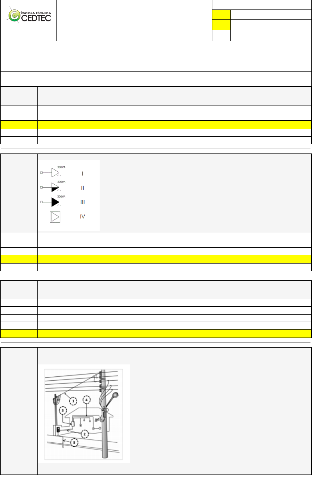 Pincel Atômico - 17/07/2024 10:15:08 1/2 FILIPE DOS SANTOS PEREIRA DAS NEVES Exercício Caminho do Conhecimento - Etapa 14 (25136) Atividade finalizada em 17/07/2024 10:14:56 (1803951 / 1) LEGENDA Resposta correta na questão # Resposta correta - Questão Anulada X Resposta selecionada pelo Aluno Disciplina: ELETRICIDADE APLICADA [872058] - Avaliação com 4 questões, com o peso total de 4,44 pontos [capítulos - 117] Turma: Curso Técnico: Mecânica - Grupo: JUNHO/23 PRES - N.MEC.Jun.23 [92901] Aluno(a): 91479122 - FILIPE DOS SANTOS PEREIRA DAS NEVES - Respondeu 3 questões corretas, obtendo um total de 3,33 pontos como nota [350239_169531] Questão 001 O trabalhador que presta serviço de manutenção elétrica deve possuir, além das ferramentas, como alicate e chave de fenda, equipamentos de medição, como o multímetro. Representam as unidades de medida de tensão, corrente e resistência elétrica correta e respectivamente: Ampére; Watt; e, Volt Ampére; Volt; e, Ohm X Volt; Ampére; e, Ohm Volt; Ohm; e, Ampére Ampére; Ohm; e, Volt [350240_169534] Questão 002 Com relação a simbologias de tomadas elétricas, pode-se afirmar que as indicações I, II, III e IV abaixo, correspondem a: I - Tomada de piso, II - Tomada média na parede, III - Tomada alta na parede e IV - Tomada baixa na parede. I - Tomada média na parede, II - Tomada baixa na parede, III - Tomada de piso e IV - Tomada alta na parede. I - Tomada alta na parede, II - Tomada média na parede, III - Tomada baixa na parede e IV -Tomada de piso X I - Tomada baixa na parede, II - Tomada média na parede, III - Tomada alta na parede e IV -Tomada de piso. I - Tomada baixa na parede, II - Tomada alta na parede, III - Tomada baixa na parede e IV -Tomada de piso [350239_169530] Questão 003 Qual a principal fonte de geração de energia elétrica em nosso país? Eólica Marés Nuclear Solar X Hidrelétrica [350241_169535] Questão 004 As instalações elétricas prediais são um conjunto de componentes elétricos que têm como objetivo fornecer energia elétrica para utilização predial. Em relação aos componentes típicos da entrada de energia elétrica, observe a figura a seguir, em que os nomes dos componentes elétricos foram indicados pelos números de 1 a 5. A interpretação CORRETA da figura e seus conhecimentos sobre instalações elétricas prediais permite concluir que os nomes dos componentes indicados pelos números de 1 a 5 correspondem à alternativa: Pincel Atômico - 17/07/2024 10:15:08 2/2 X 1 – Ramal de ligação, 2 – quadro de distribuição, 3 – circuito terminal, 4 – circuito de distribuição, 5 – aterramento. 1 – Ramal de ligação, 2 – circuito terminal, 3 – quadro de distribuição, 4 – circuito de distribuição, 5 – aterramento. 1 – Circuito de distribuição, 2 – circuito terminal, 3 – quadro de distribuição, 4 – ramal de ligação, 5 – aterramento. 1 – Circuito de distribuição, 2 – ramal de ligação, 3 – quadro de distribuição, 4 – circuito terminal, 5 – aterramento. 1 – Ramal de ligação, 2 – circuito de distribuição, 3 – quadro de distribuição, 4 – circuito terminal, 5 – aterramento.
